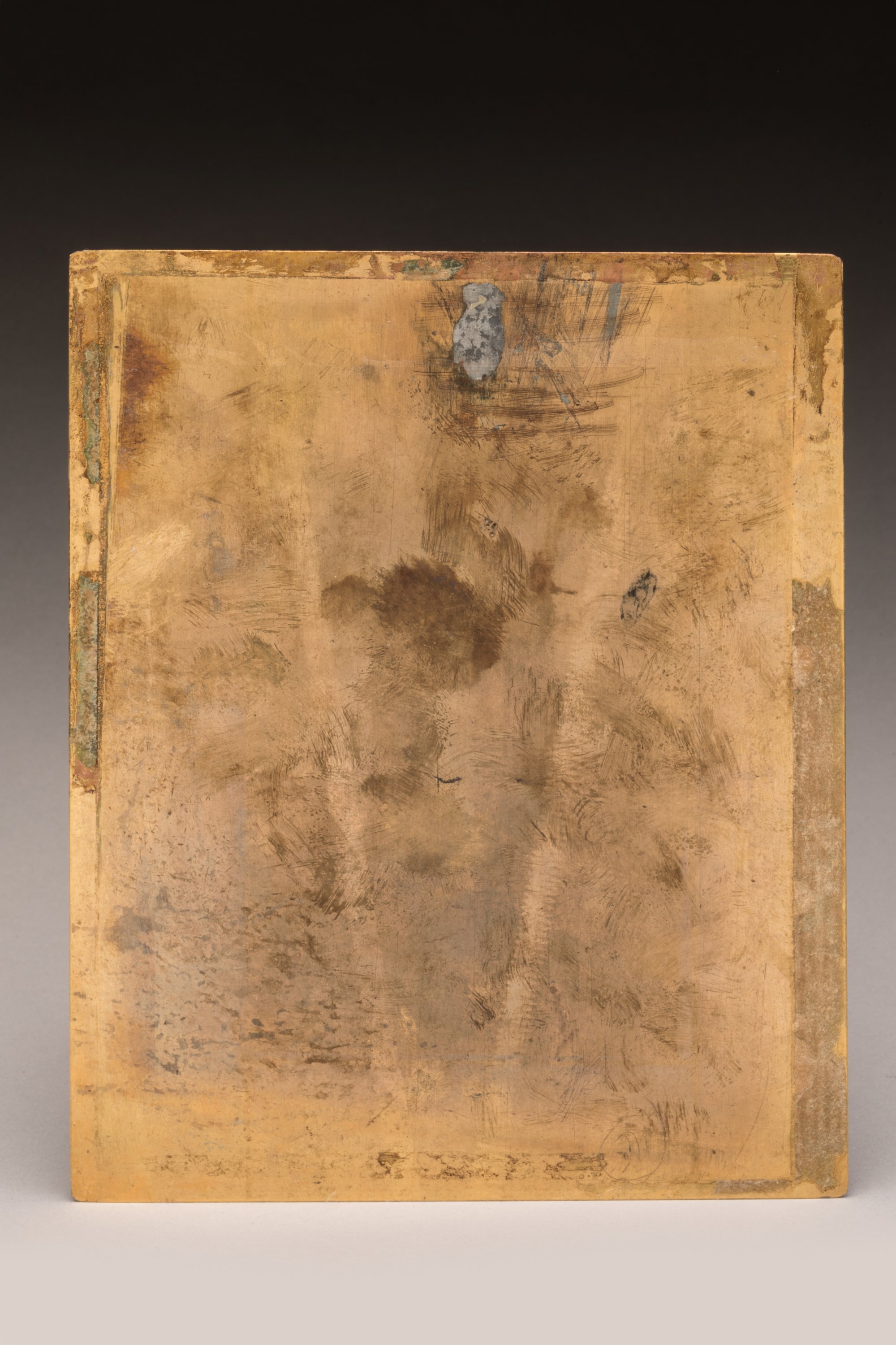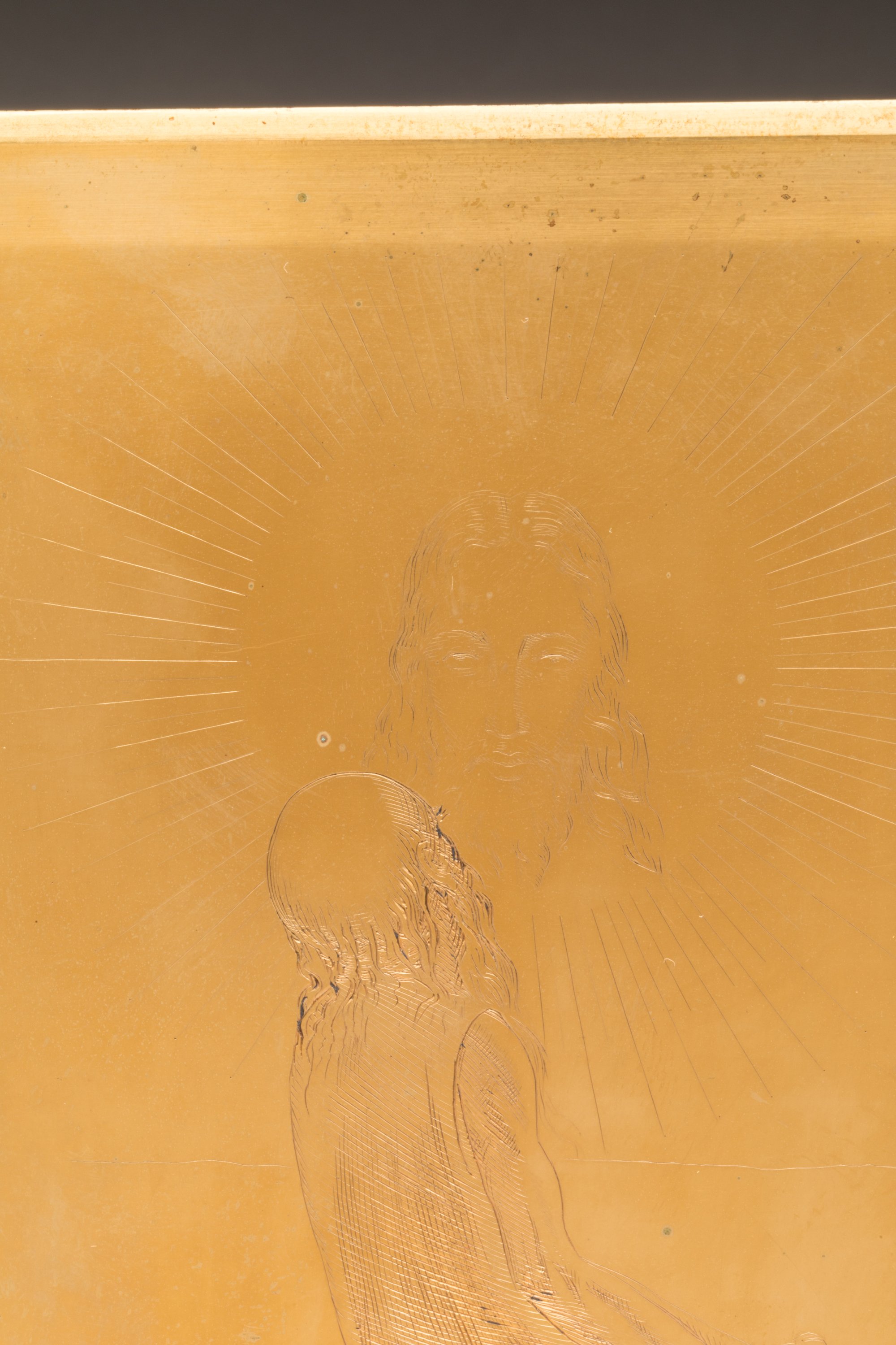 PLAQUE de cuivre dorée à l'or fin, gravée d'une scène religieuse.