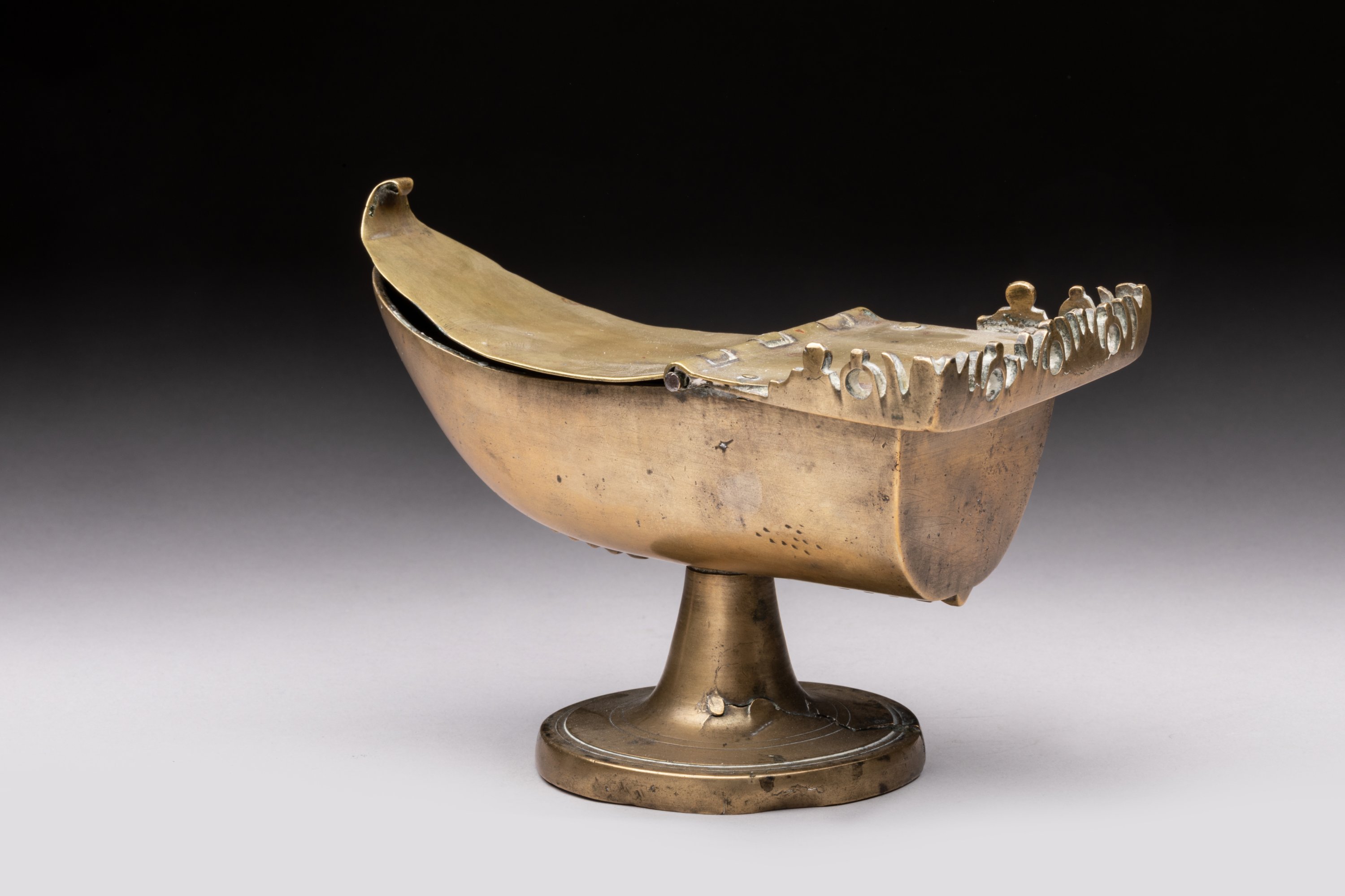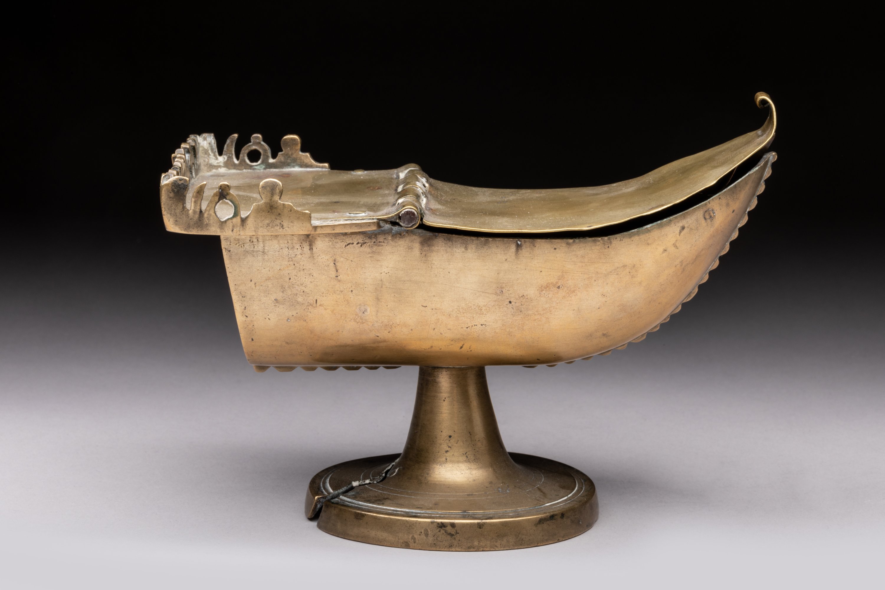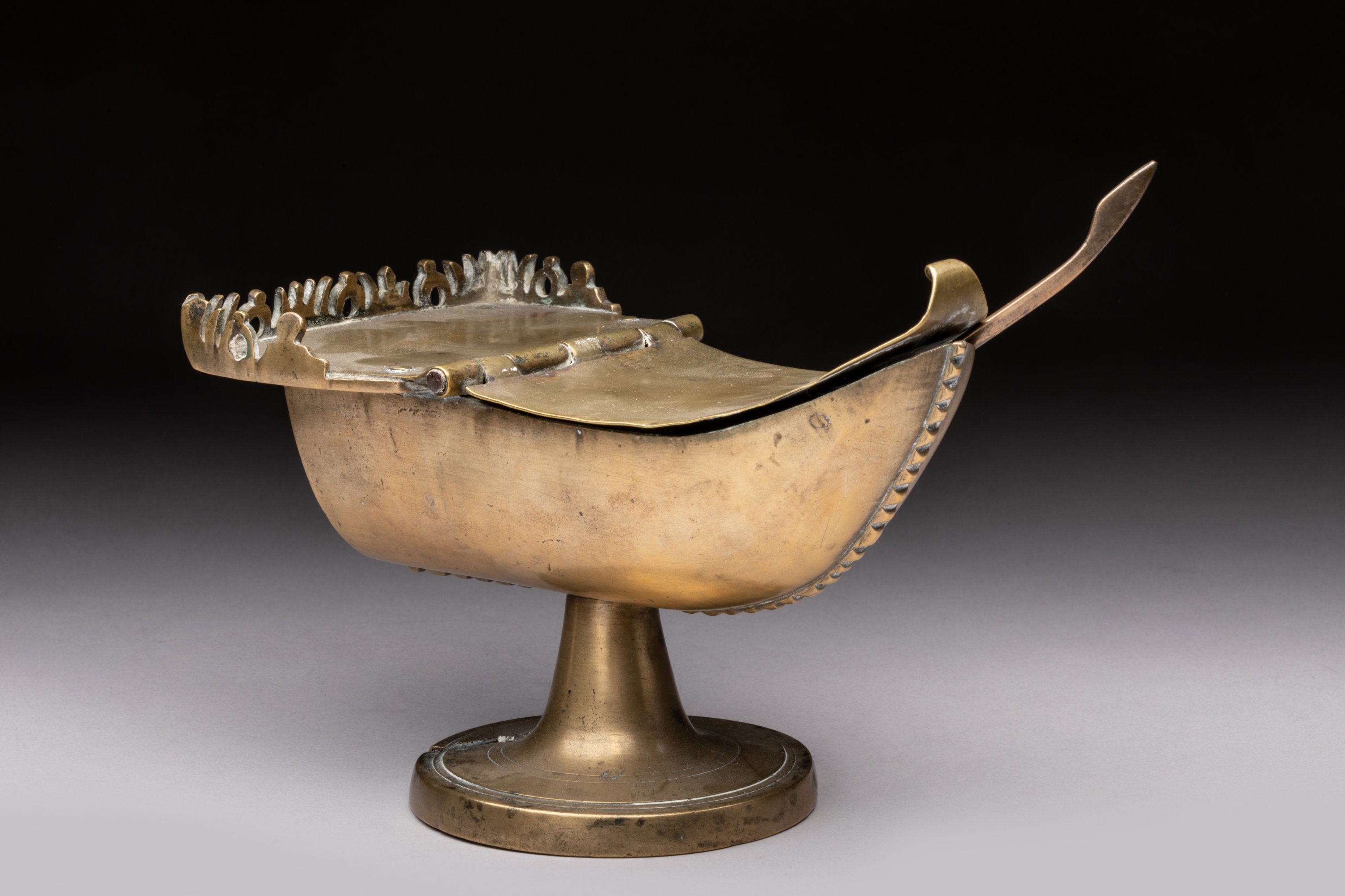 NAVETTE à ENCENS en laiton, en forme de nef à l'antique sur piédouche.