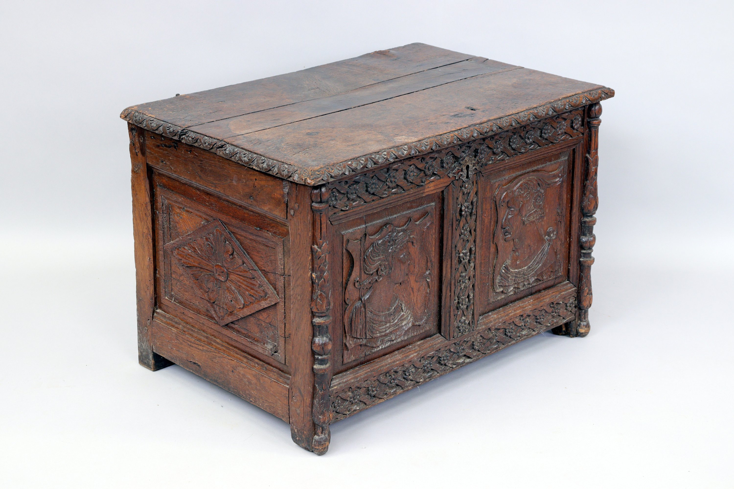 COFFRE en chêne mouluré et sculpté, présentant en façade des personnages à l'antique se faisant face et des rosaces dans un losange sur les côtés. Les bords du coffre et du plateau sont ornés de moulures de fleurs et de végétaux. Plaque de serrure ajourée.