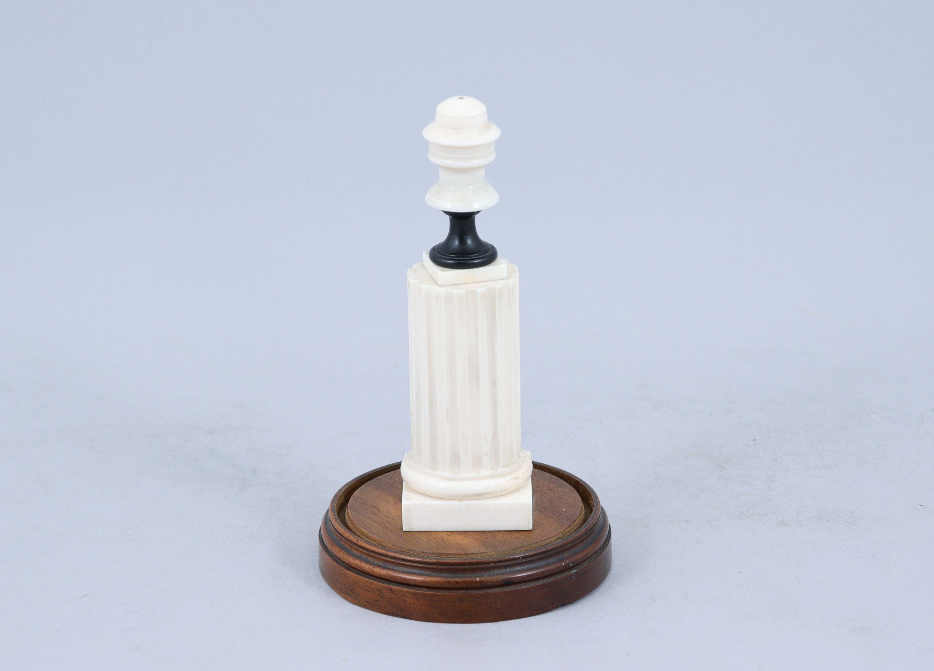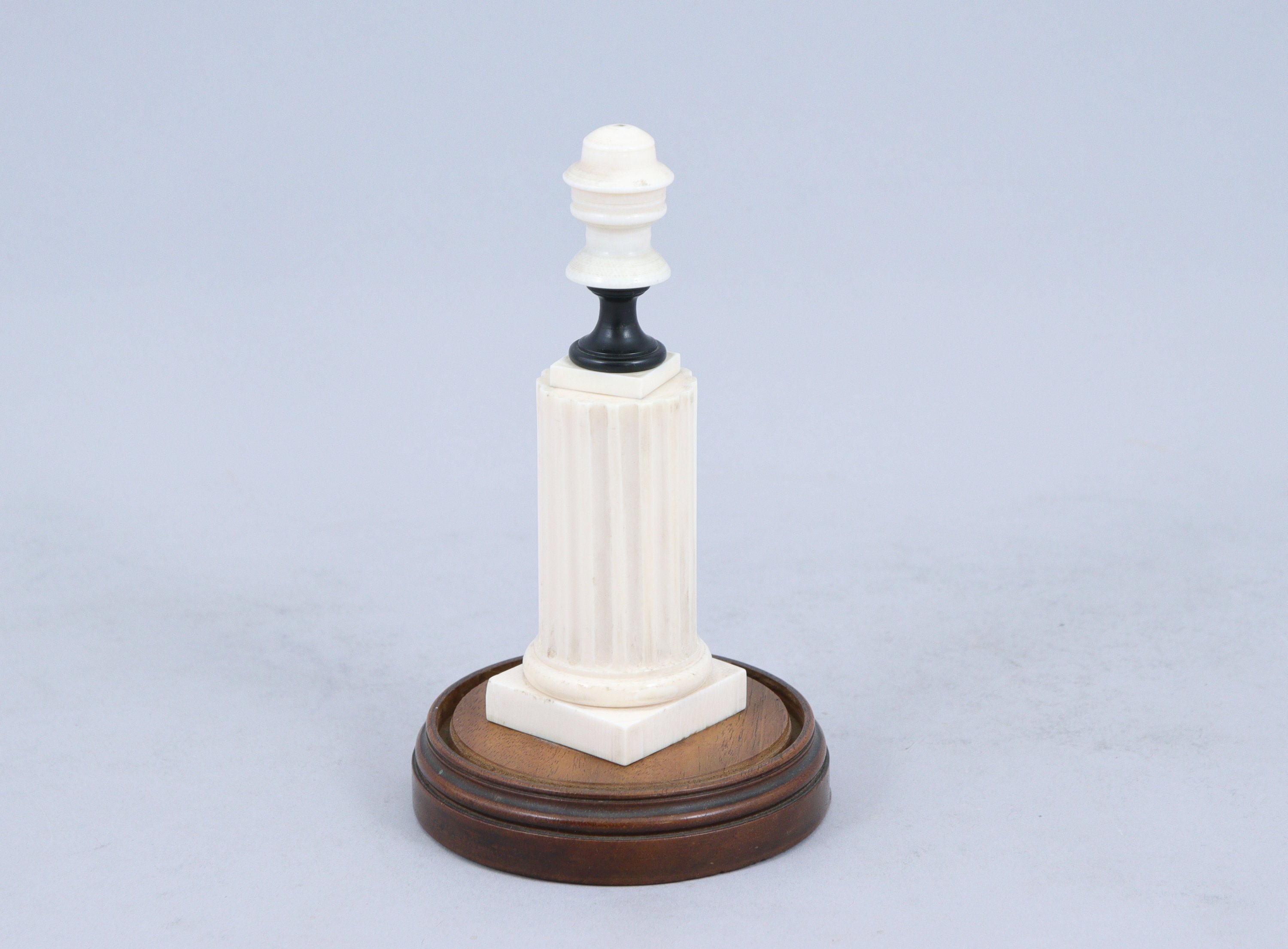 COLONNE en ivoire tourné, le fût cannelé surmonté d'une balustre en ivoire sur piédouche en bois noir.