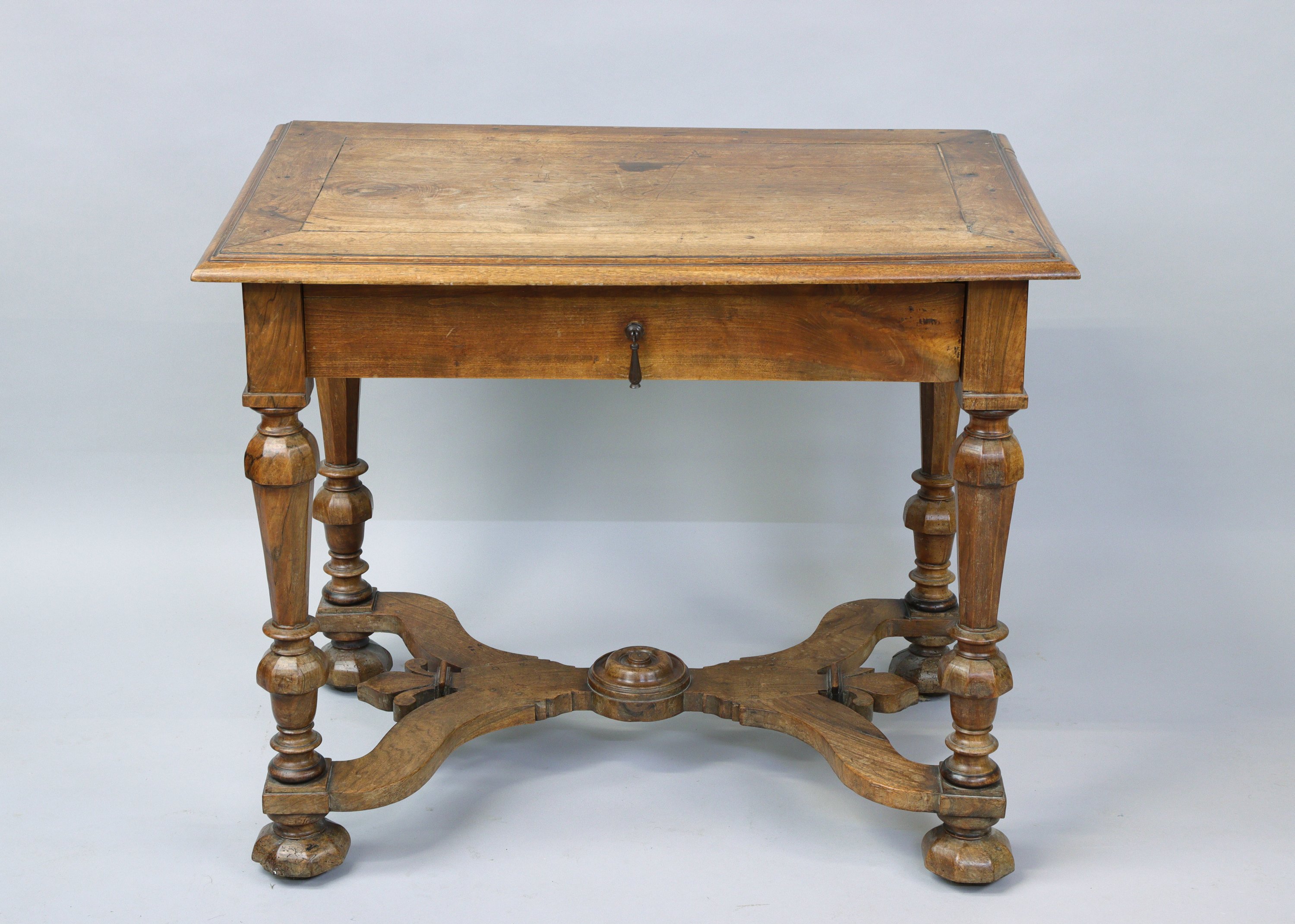ouvrant par un tiroir et reposant sur quatre pieds de forme balustre reliés par une entretoise en H, se terminant par des pieds en boules aplaties.