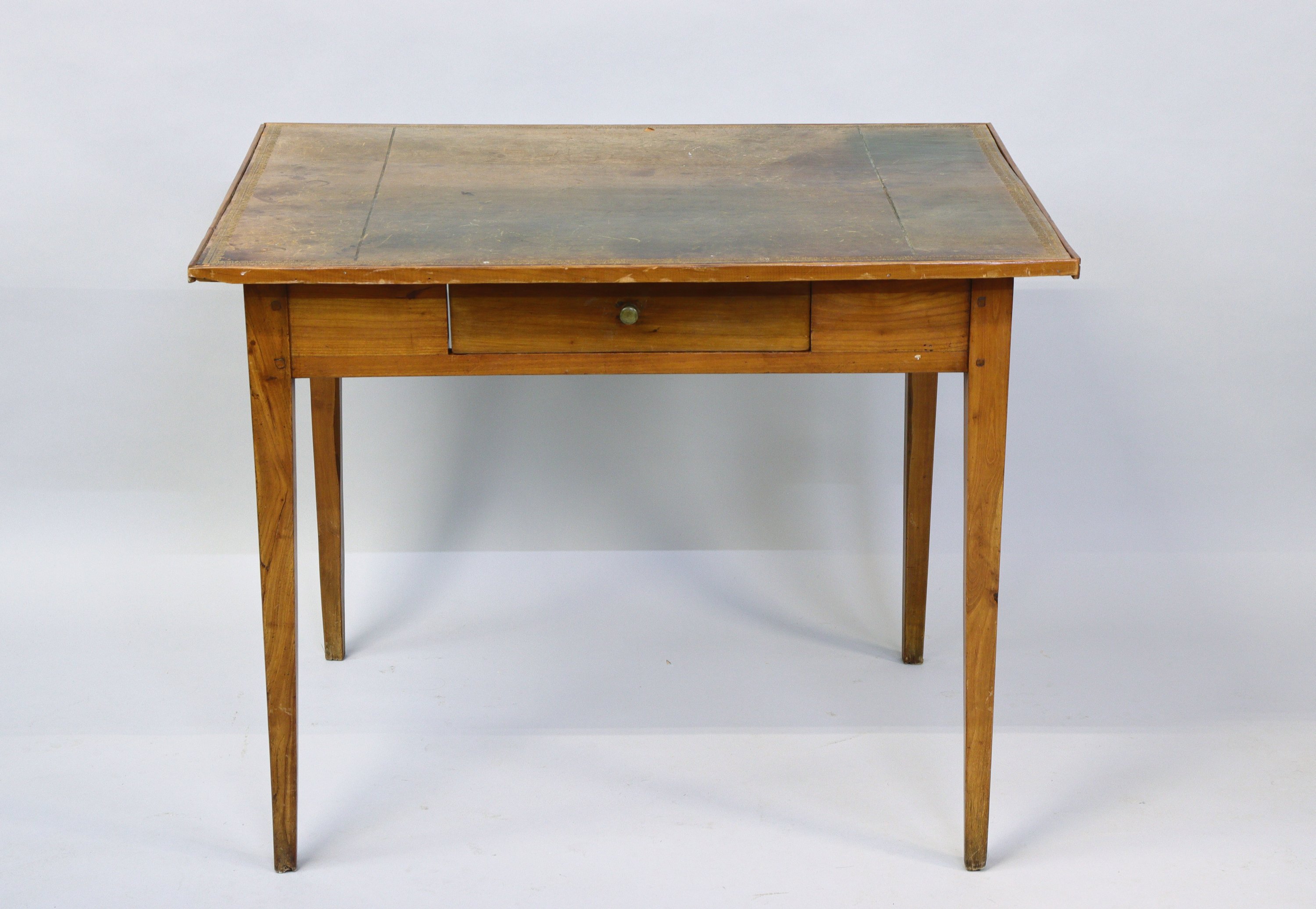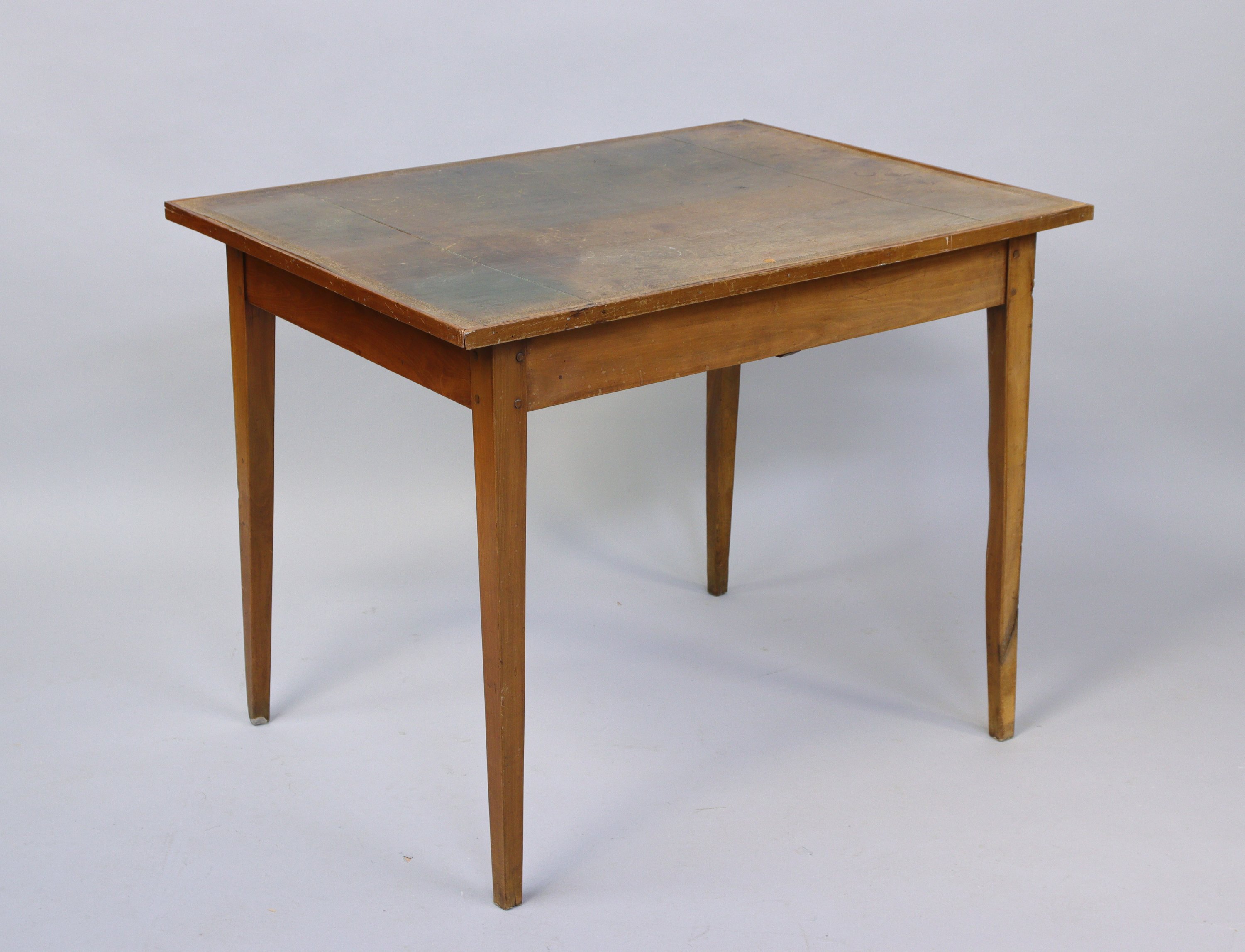 JOINT: BUREAU PLAT en bois naturel ouvrant par un tiroir et reposant sur quatre pieds gainés, le dessus garni de cuir vert. Travail de style Louis XVI, du XIXe. Haut. 70, Long. 90, Prof. 68 cm.
