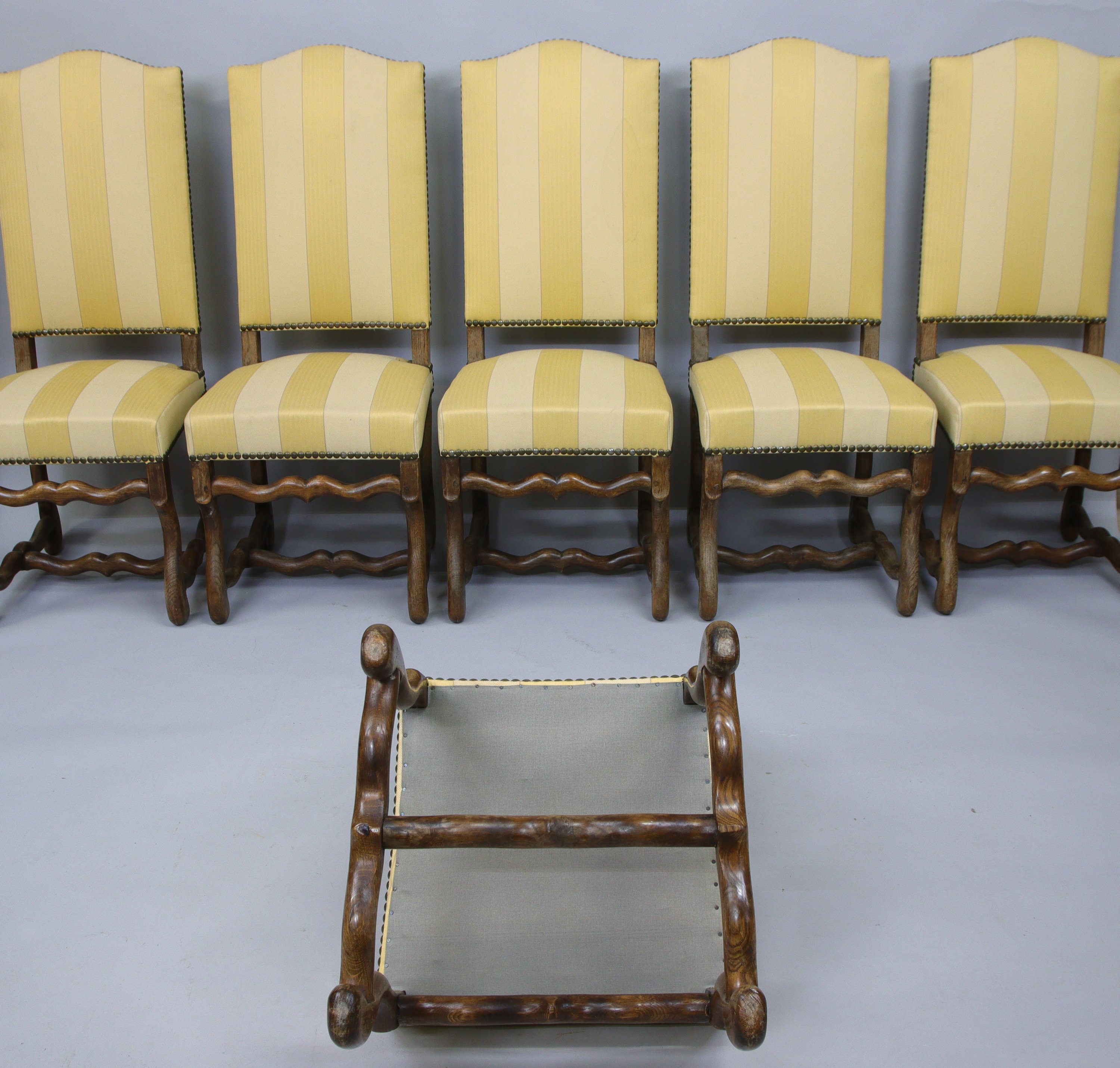 SUITE de SIX CHAISES en bois mouluré, le dossier plat, les pieds galbés réunis par une entretoise en H.