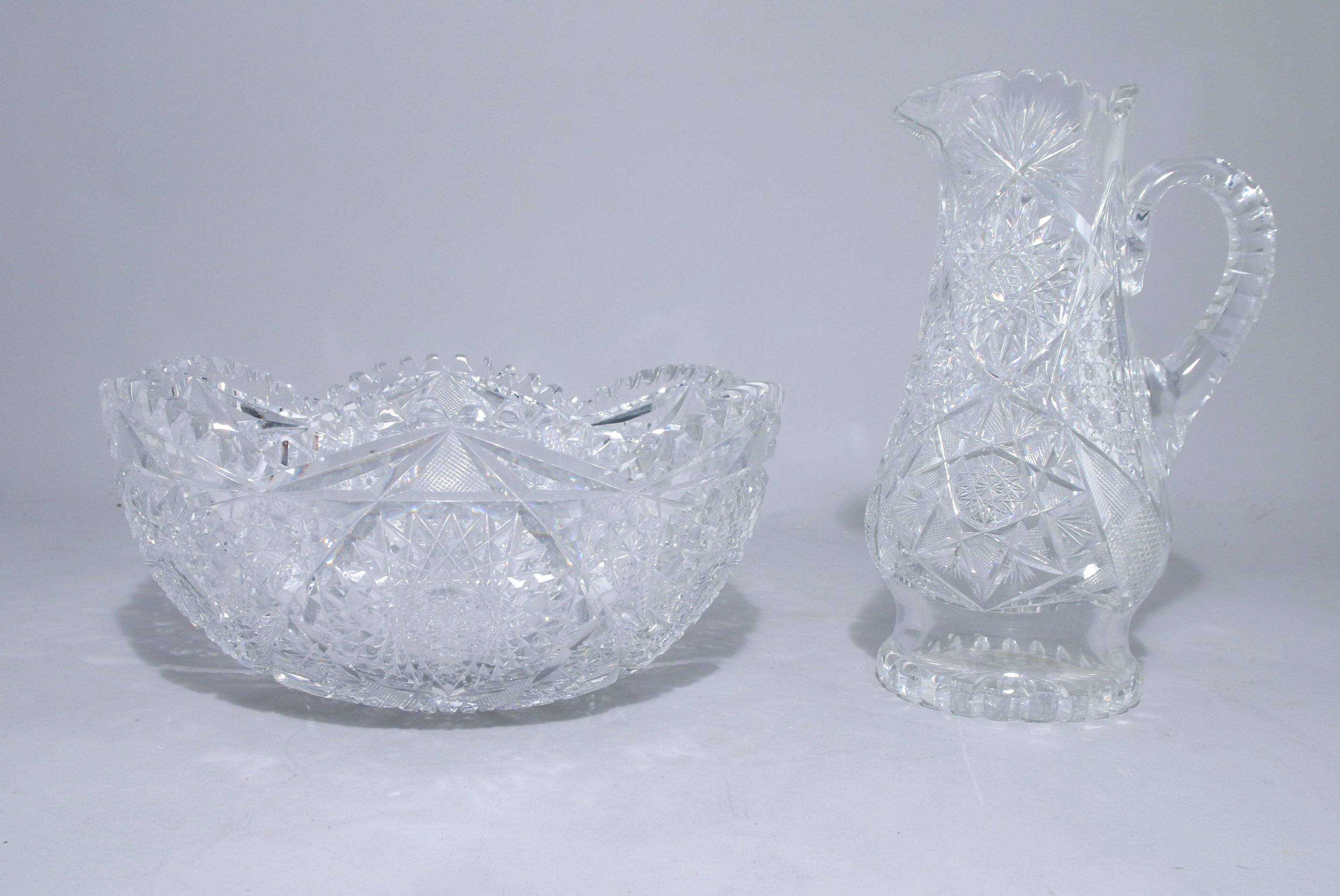 en cristal finement taillé de motifs rayonnants, fleurs et frises géométriques.