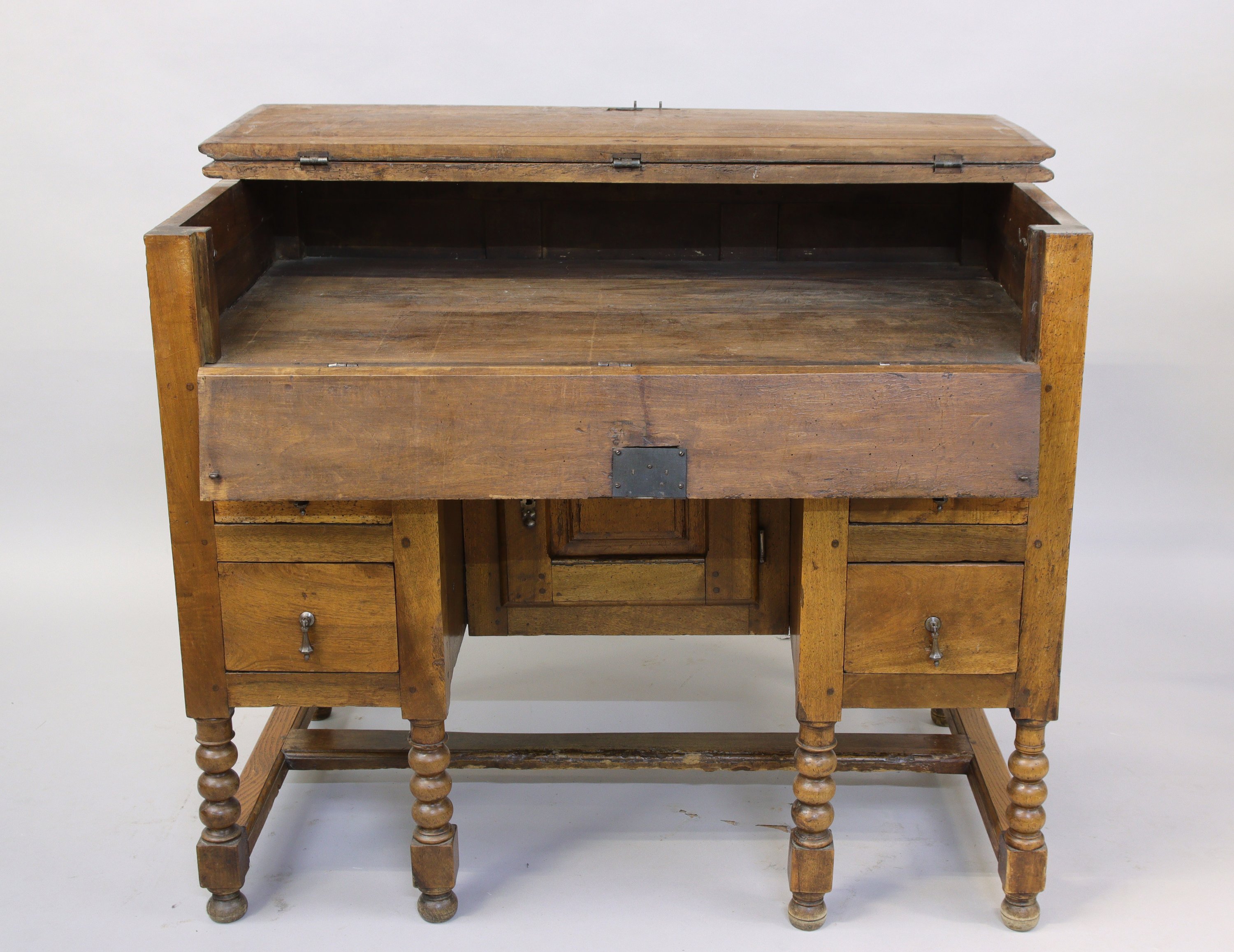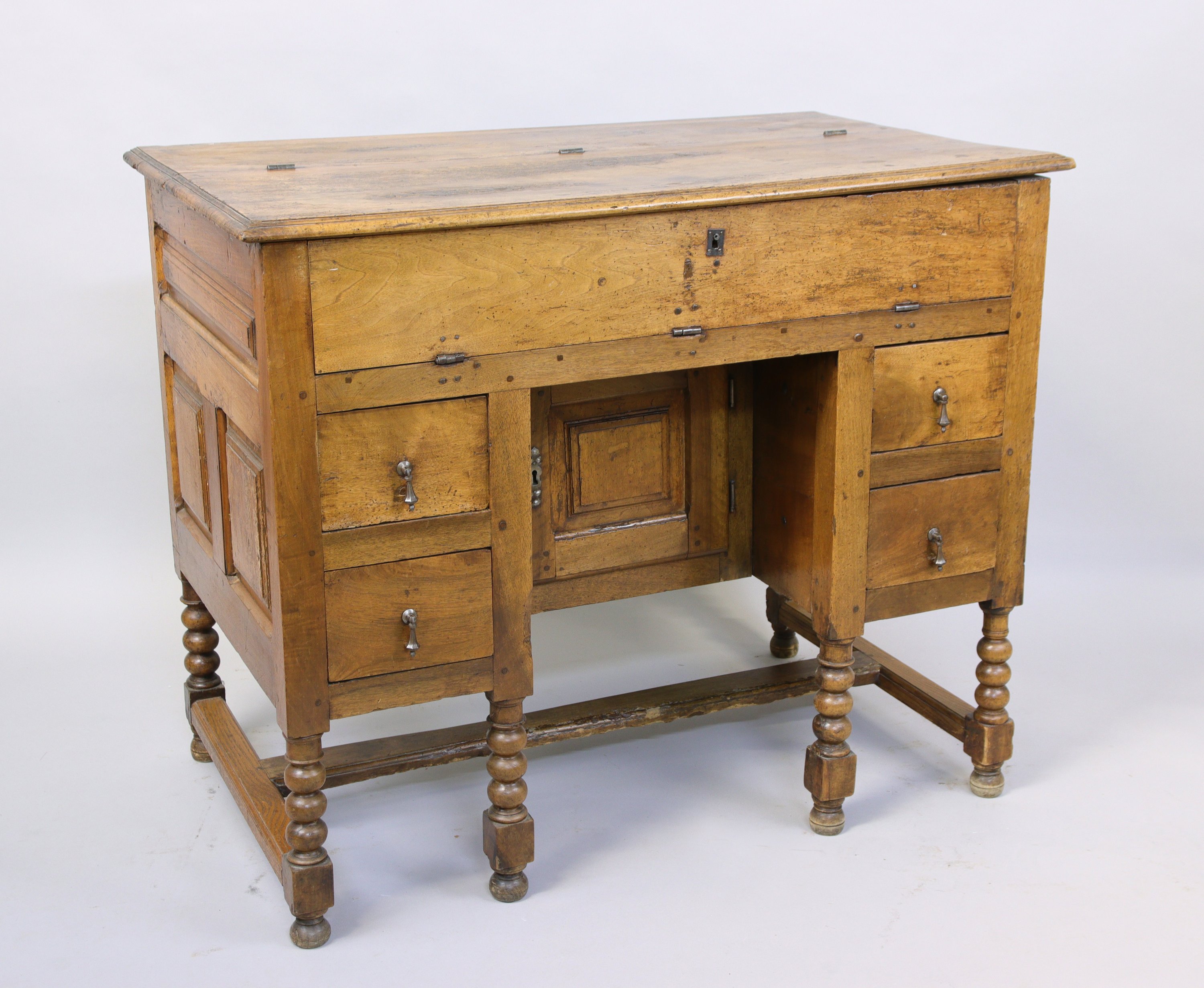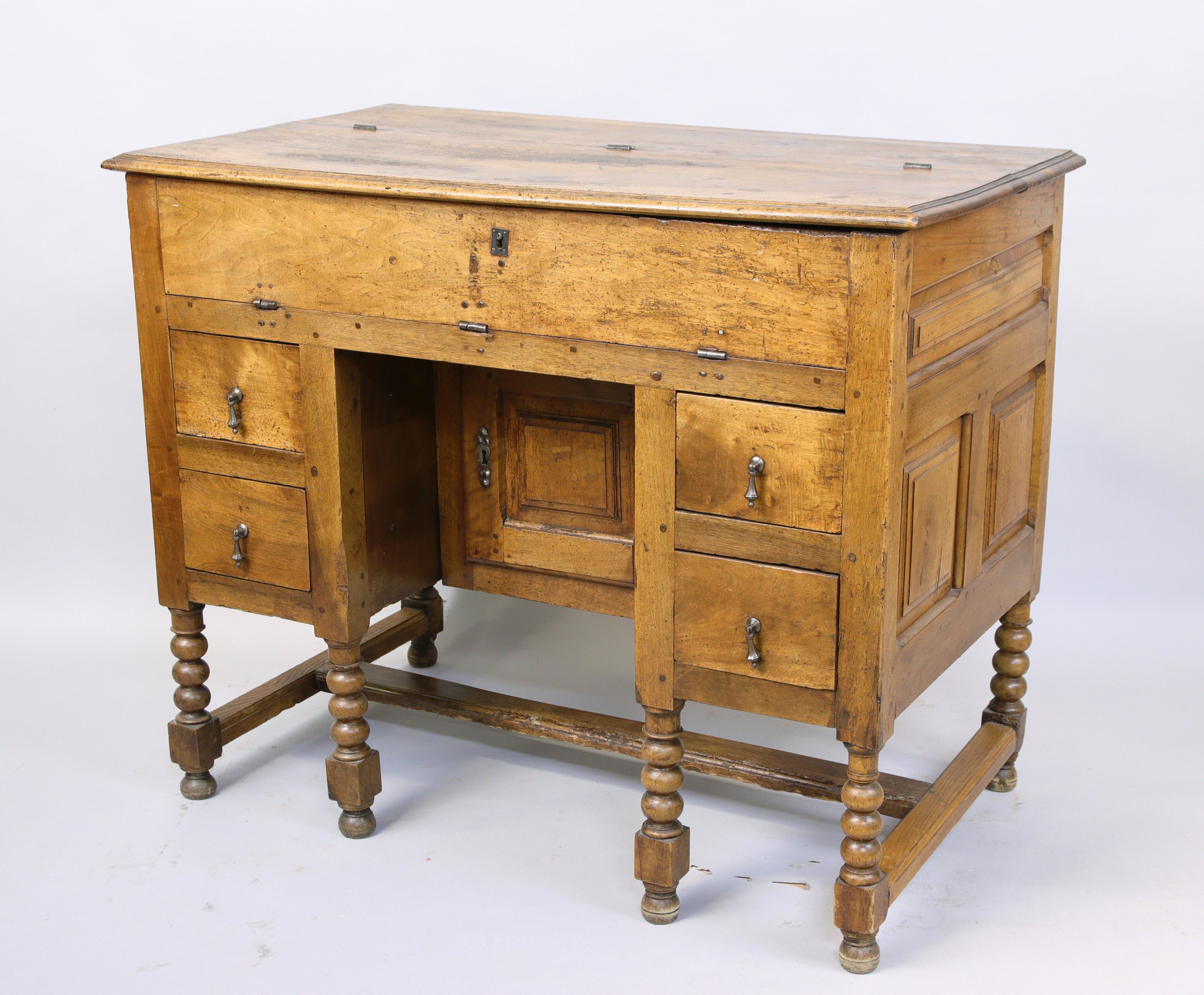 BUREAU DIT MAZARIN à trois faces en chêne ornées de motifs de caissons. Deux caisses ouvrant par deux tiroirs sont disposées de part et d'autre d'une porte centrale. Le plateau s'ouvre par le dessus.