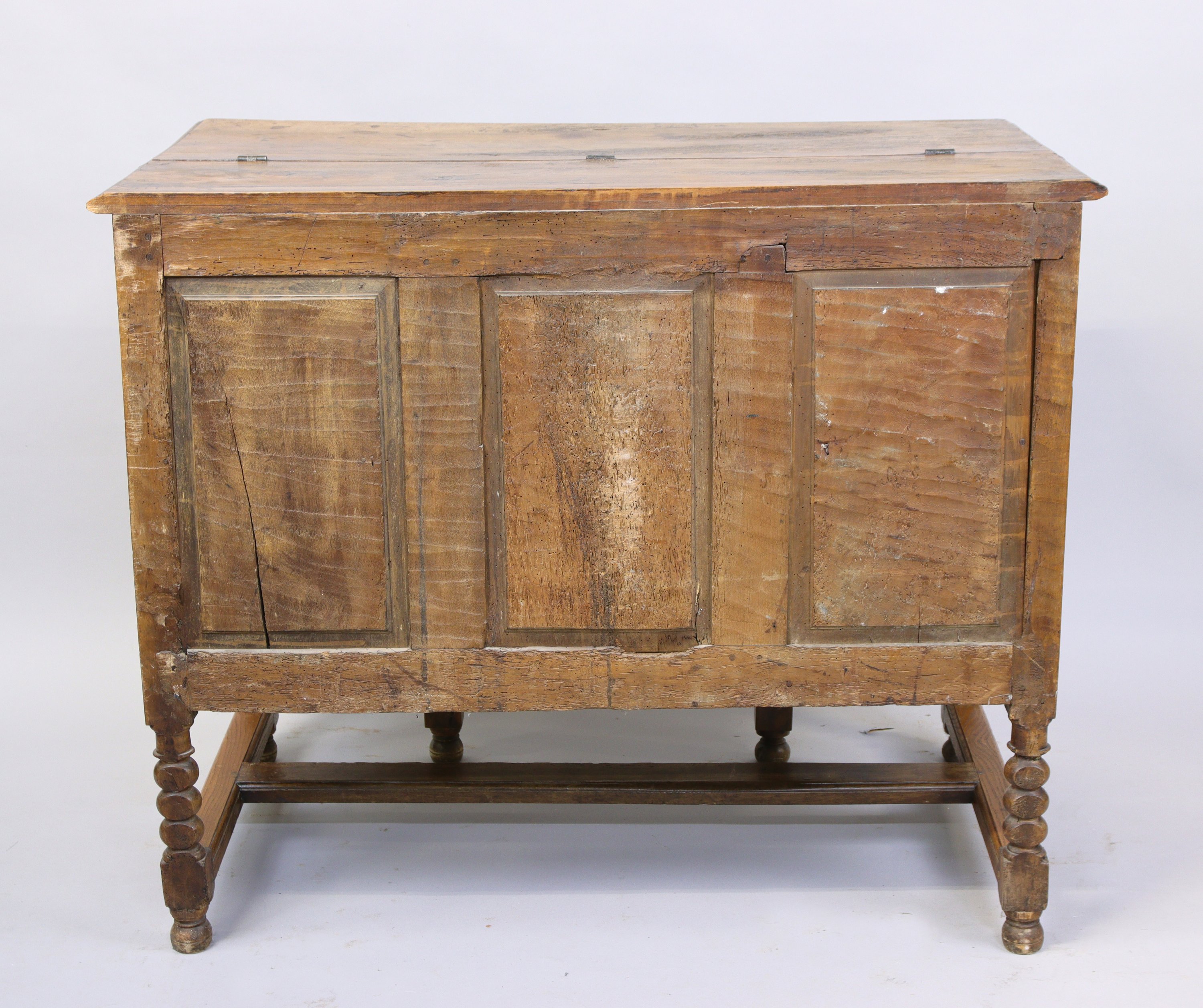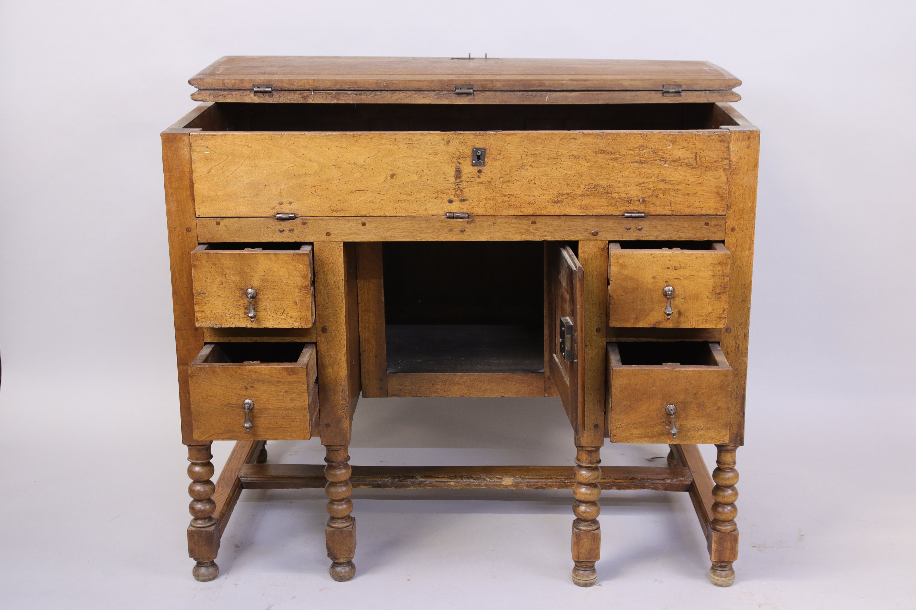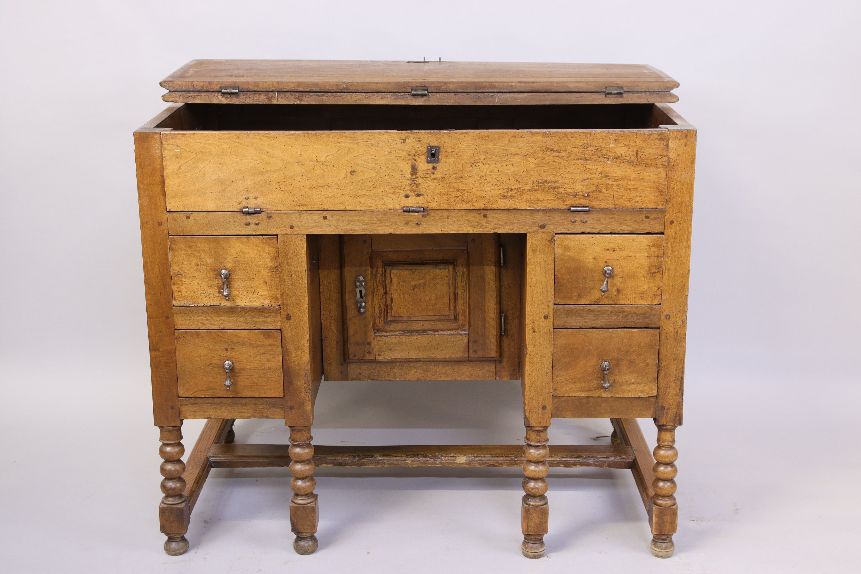 BUREAU DIT MAZARIN à trois faces en chêne ornées de motifs de caissons. Deux caisses ouvrant par deux tiroirs sont disposées de part et d'autre d'une porte centrale. Le plateau s'ouvre par le dessus.