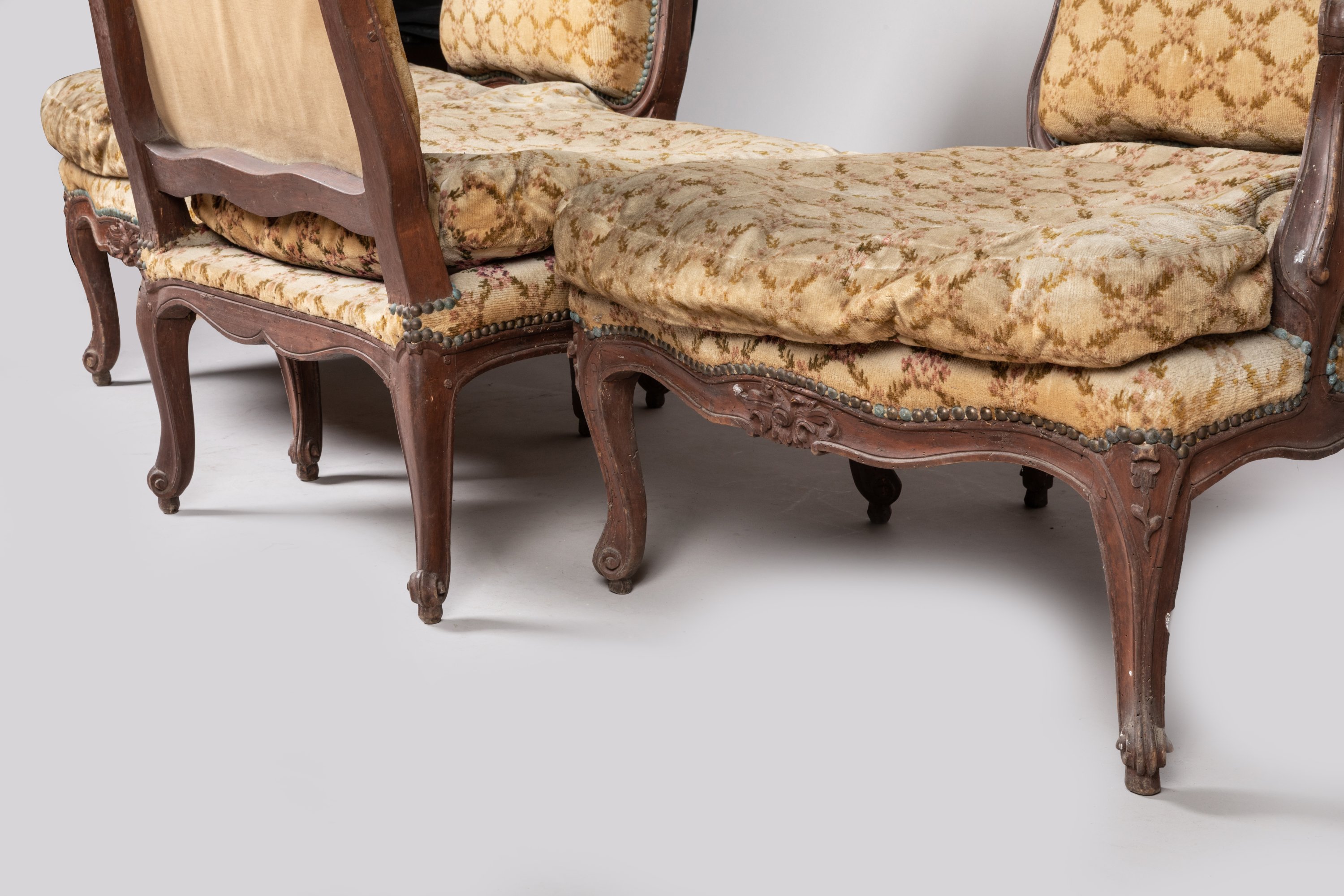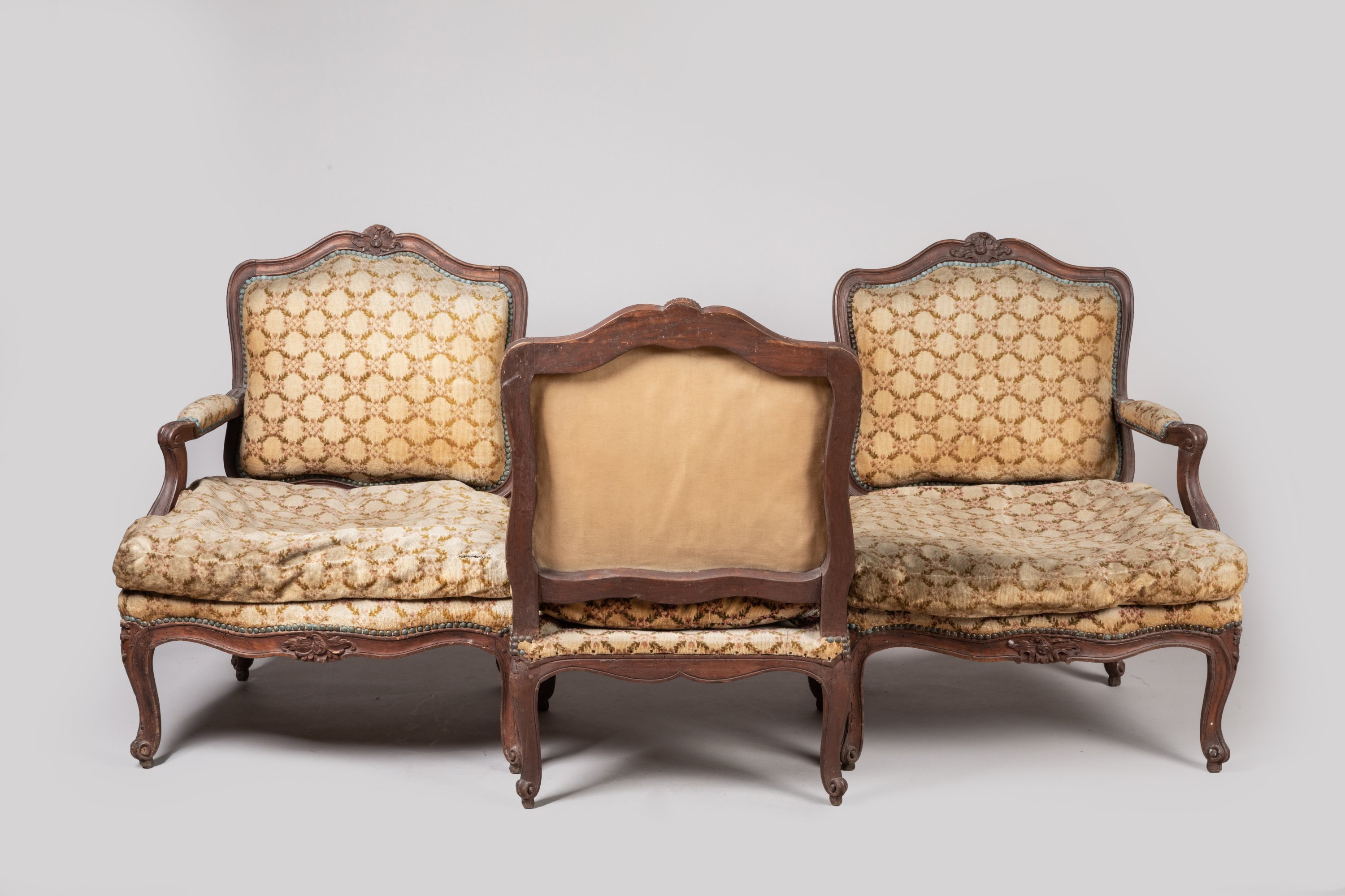 en hêtre mouluré et sculpté, à décor de grenades éclatées. Elle est composée dun fauteuil à un bras côté gauche, dune chaise et dun autre fauteuil à un bras côté droit. Ils portent les numéros 1, 2 et 5 en chiffres romains.
