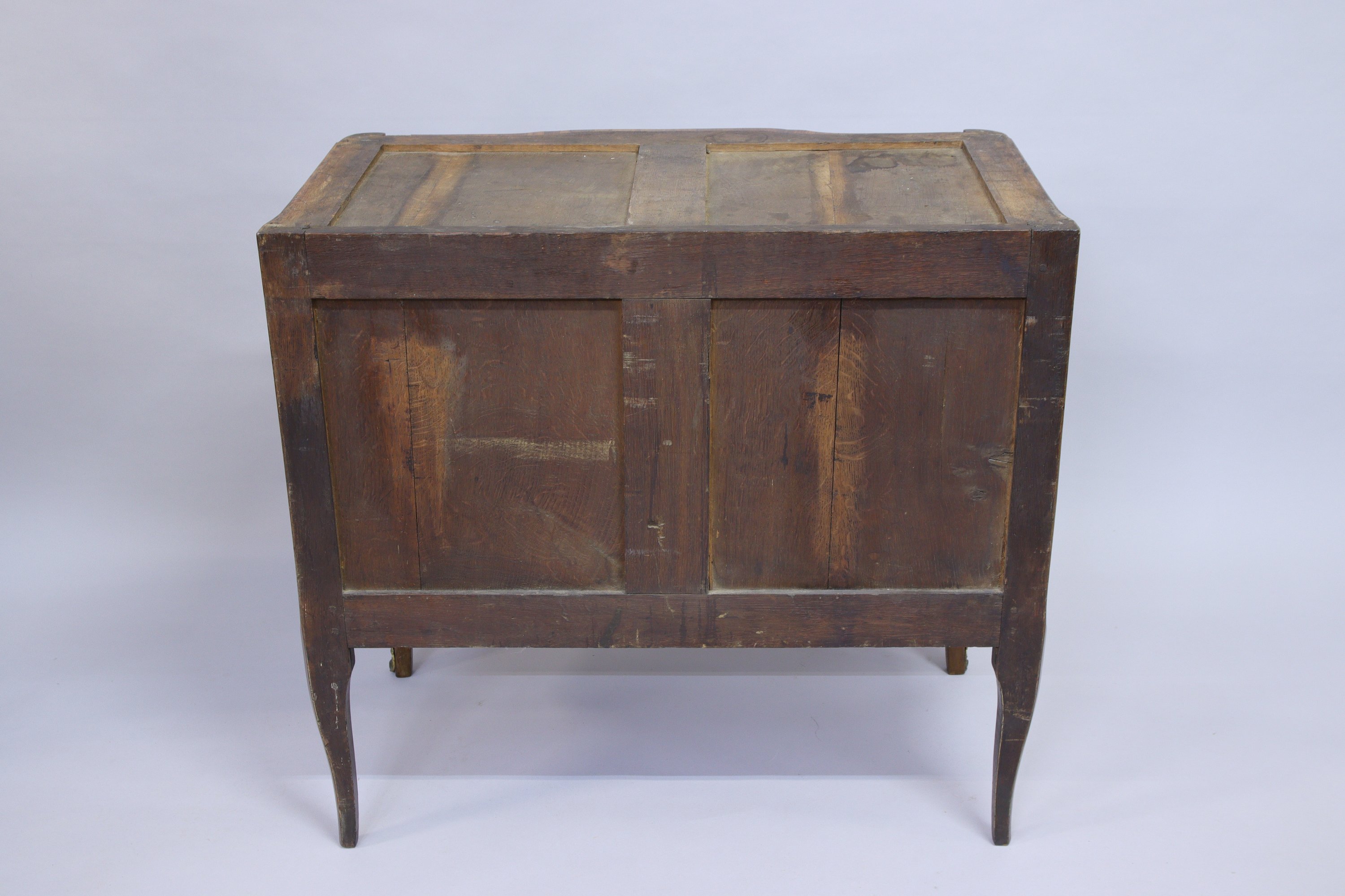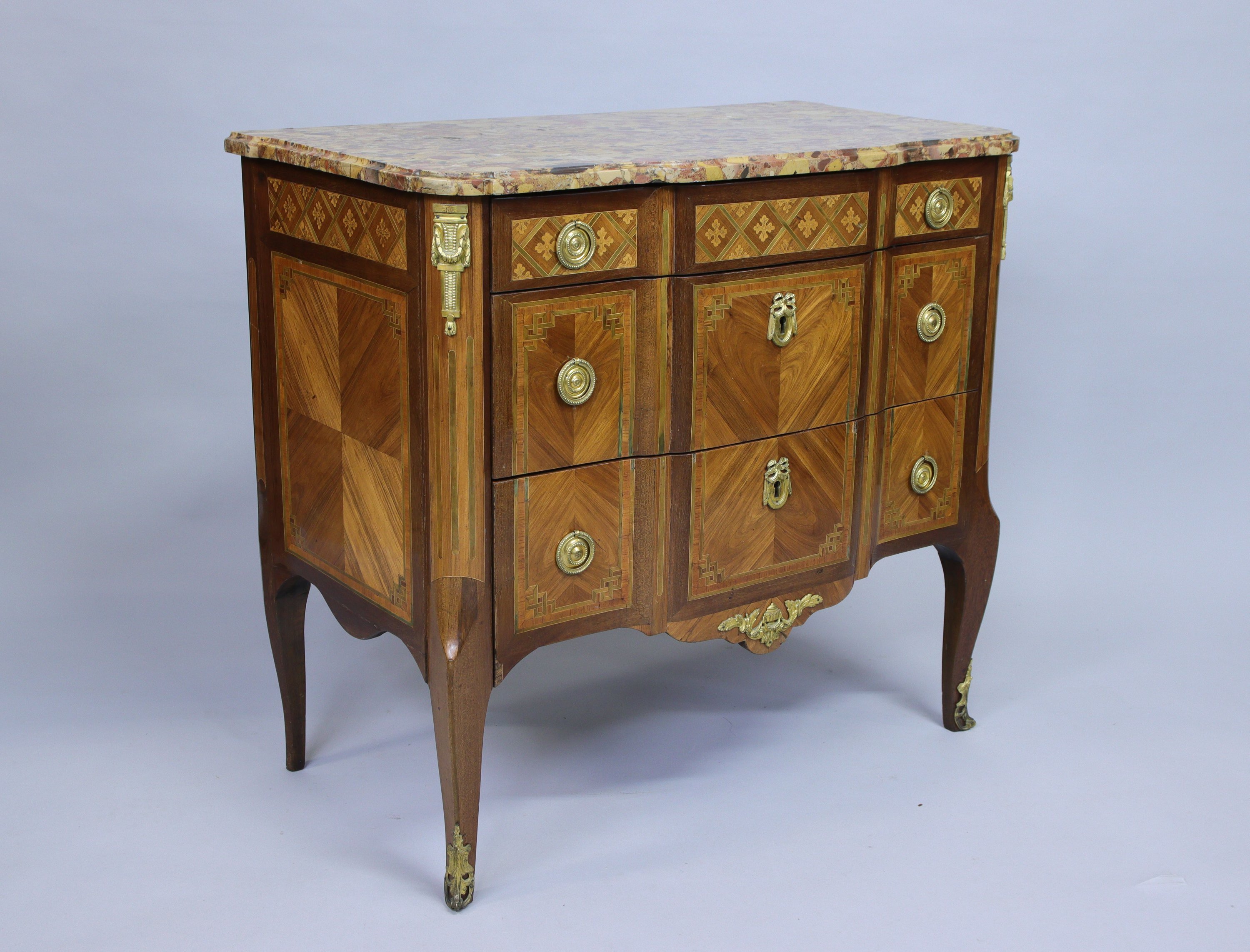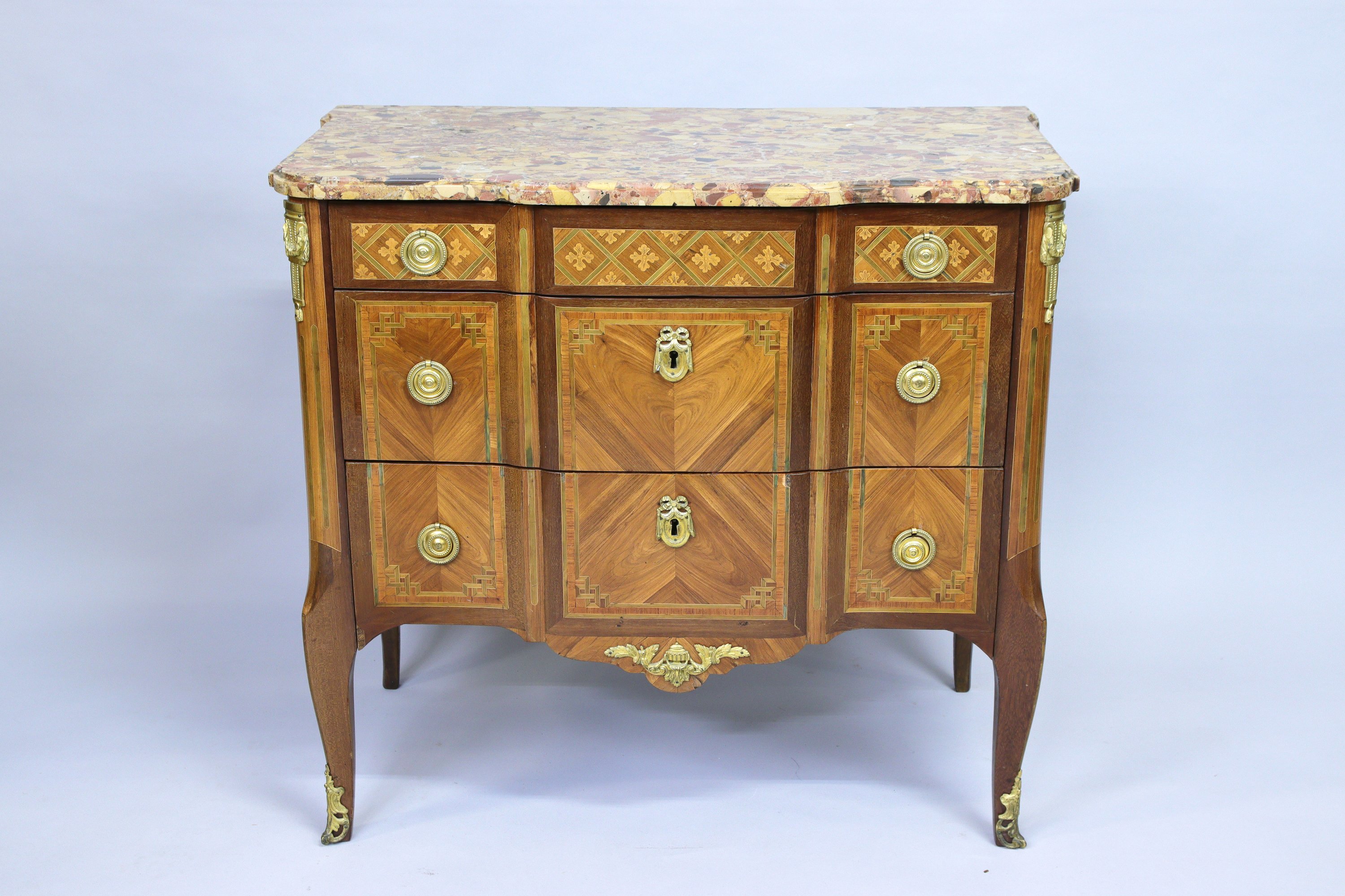 COMMODE TRANSITION à léger ressaut en frisage de bois de rose et marqueterie de citronnier, amarante et bois teintés. Elle ouvre par trois tiroirs sur trois rangs sans traverse et repose sur quatre pieds légèrement cambrés. Marqueterie dite "à la Reine " et rosaces stylisées. Encadrements de filets à la grecque. Garniture de bronzes ciselés et dorés tels qu'entrées de serrure ornées de rubans, chutes d'angle et tablier à décor de cassolette. Sabots feuillagés.