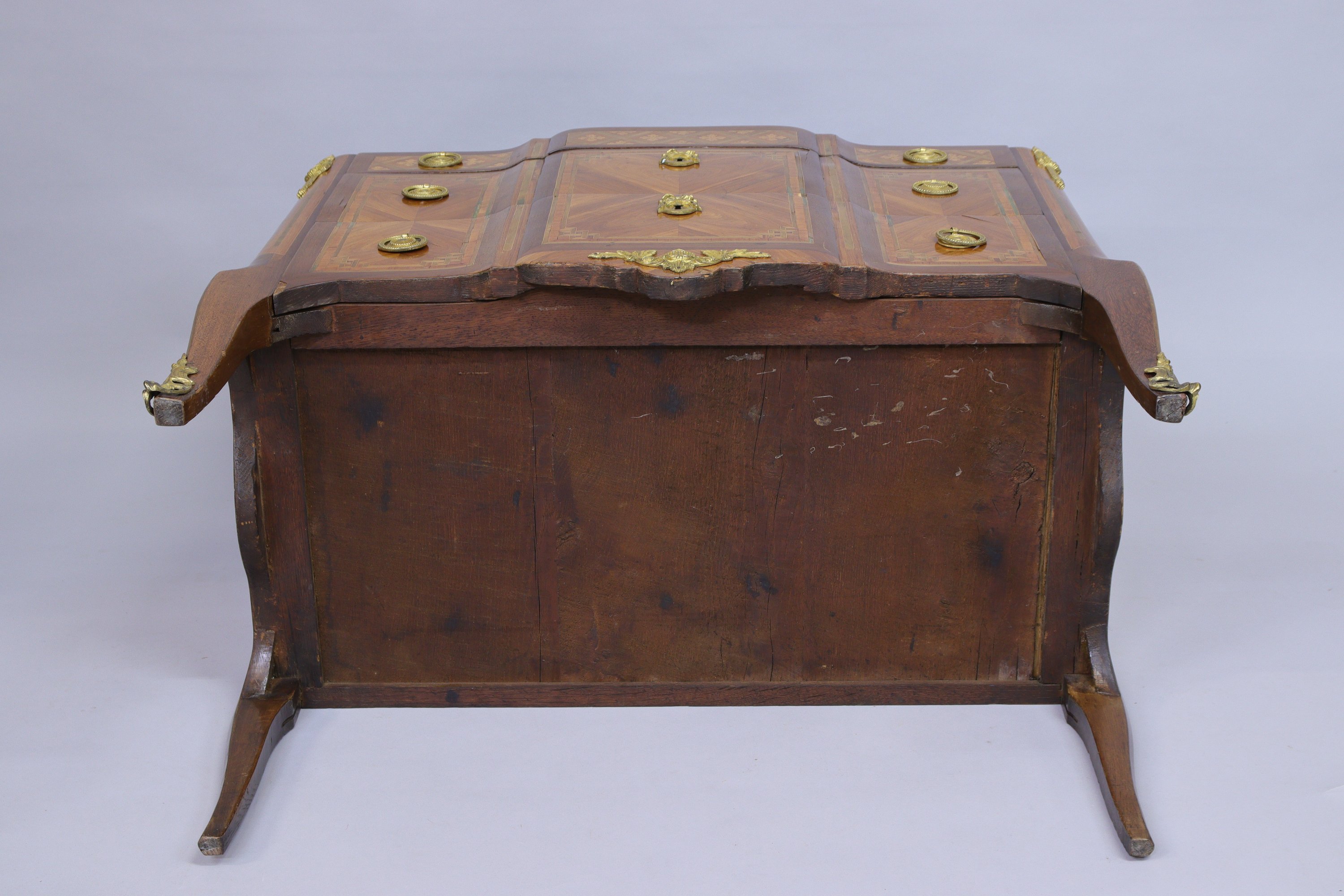 La marqueterie dite "à la Reine" est inventée sous le règne de Louis XV (1715-1774). Elle crée des illusions d'optique en formant un treillage stylisé en trois dimensions. Cet ornement perdure sous Louis XVI et est très copié dans la seconde moitié du XIXe siècle. D'ailleurs, Le mallettier Louis Vuitton (1821-1892) sest inspiré de la marqueterie dite "à la Reine" pour ce qui deviendra son symbole: le damier monogrammé LV.