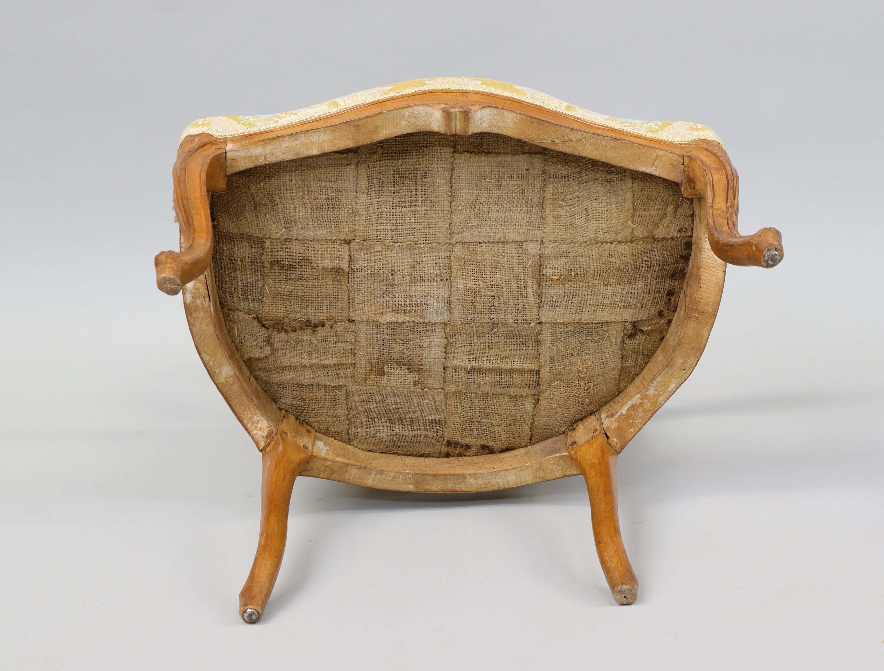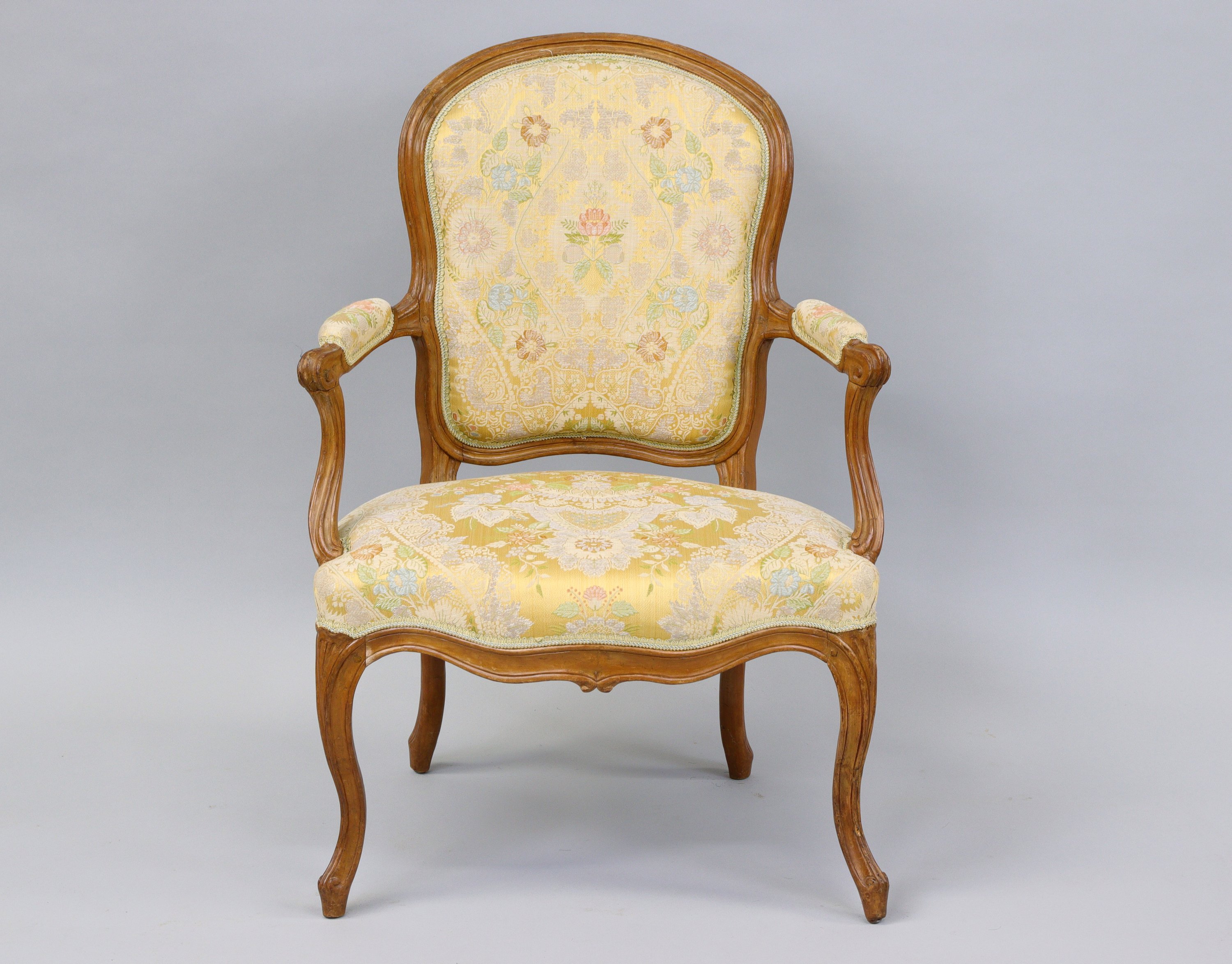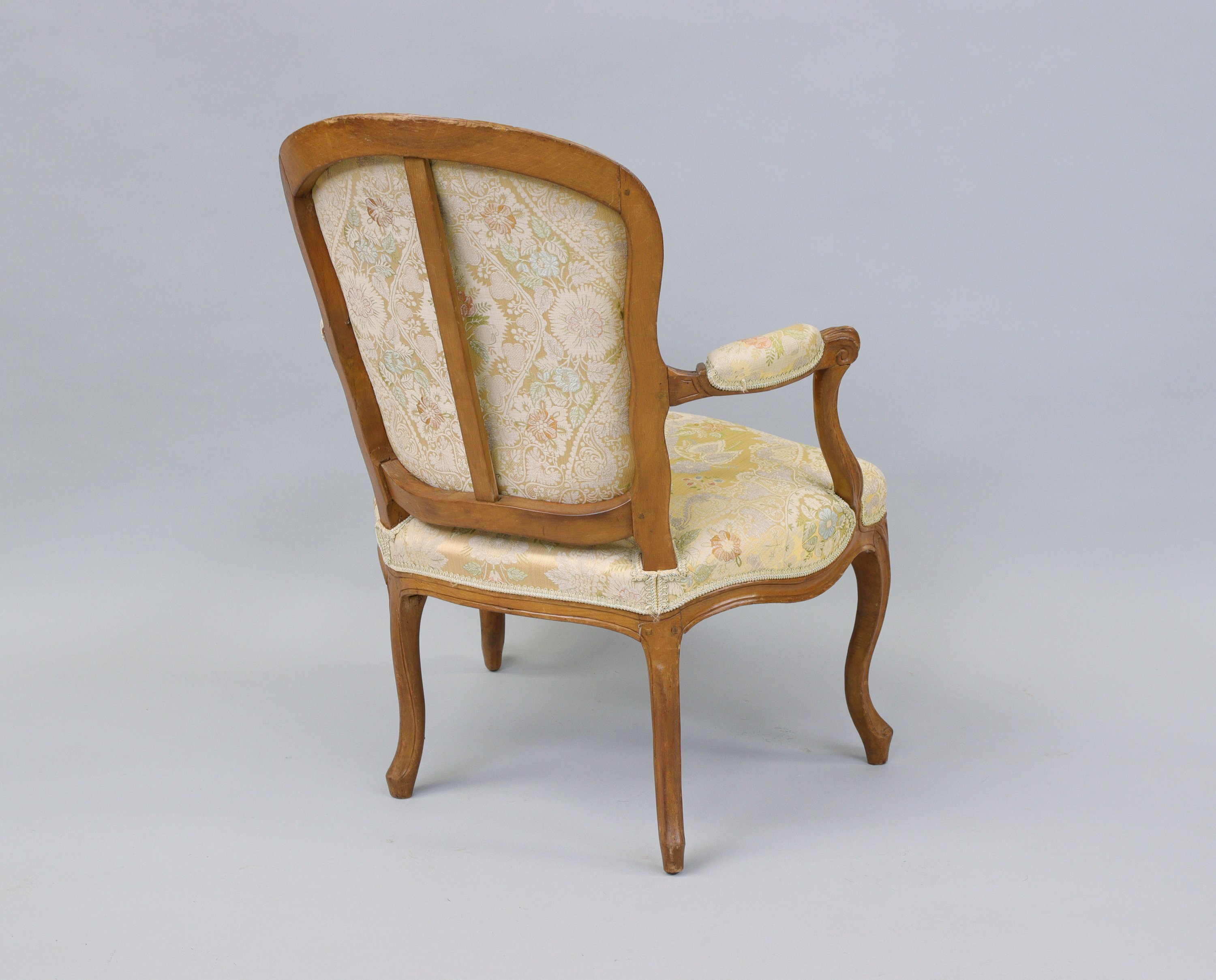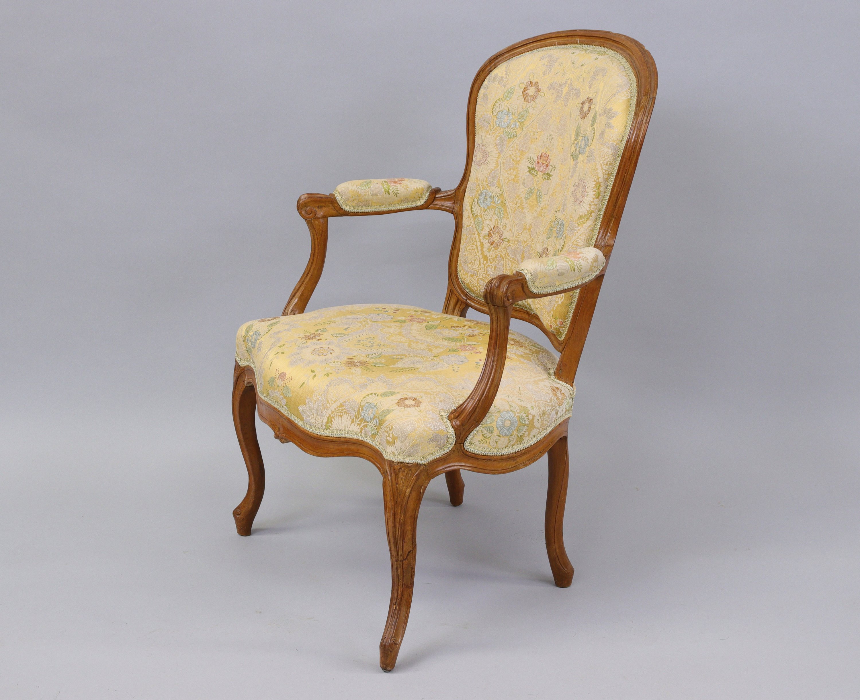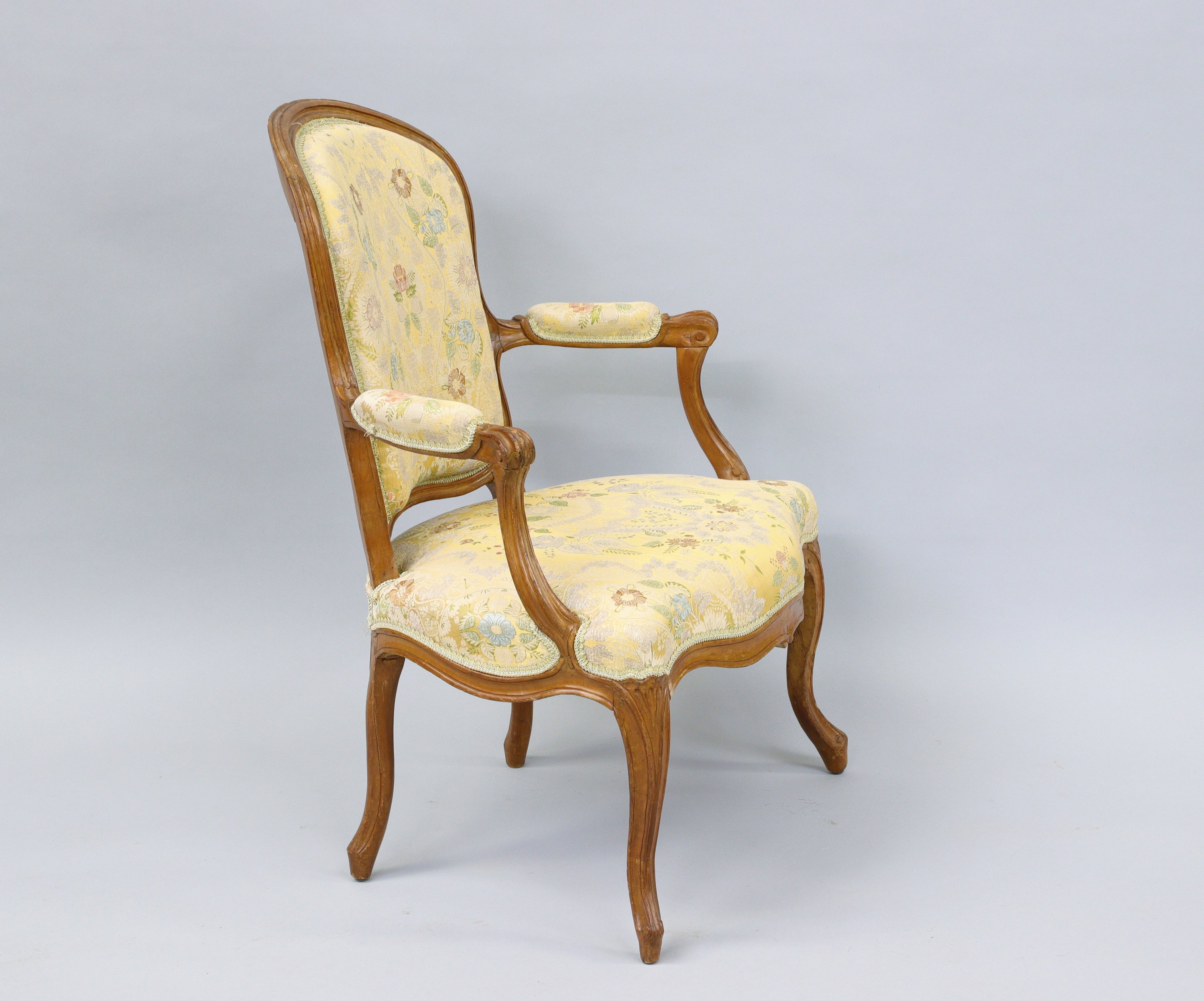 Fauteuil cabriolet en bois naturel mouluré à accotoirs à manchettes tournantes