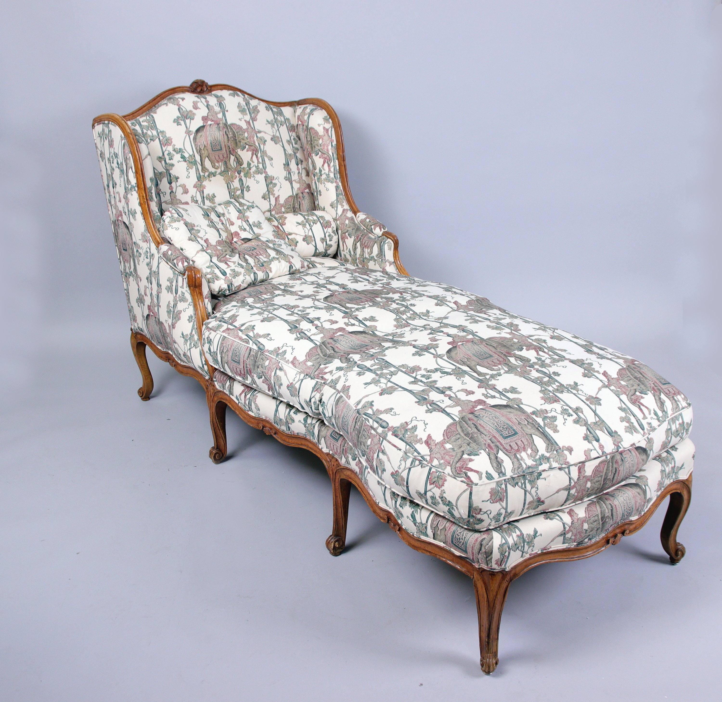DUCHESSE à OREILLES en hêtre mouluré et sculpté de fleurettes. Les crosses d'accotoirs sont traitées en coup de fouet. La ceinture mouvementée repose sur huit pieds galbés terminés par des enroulements.