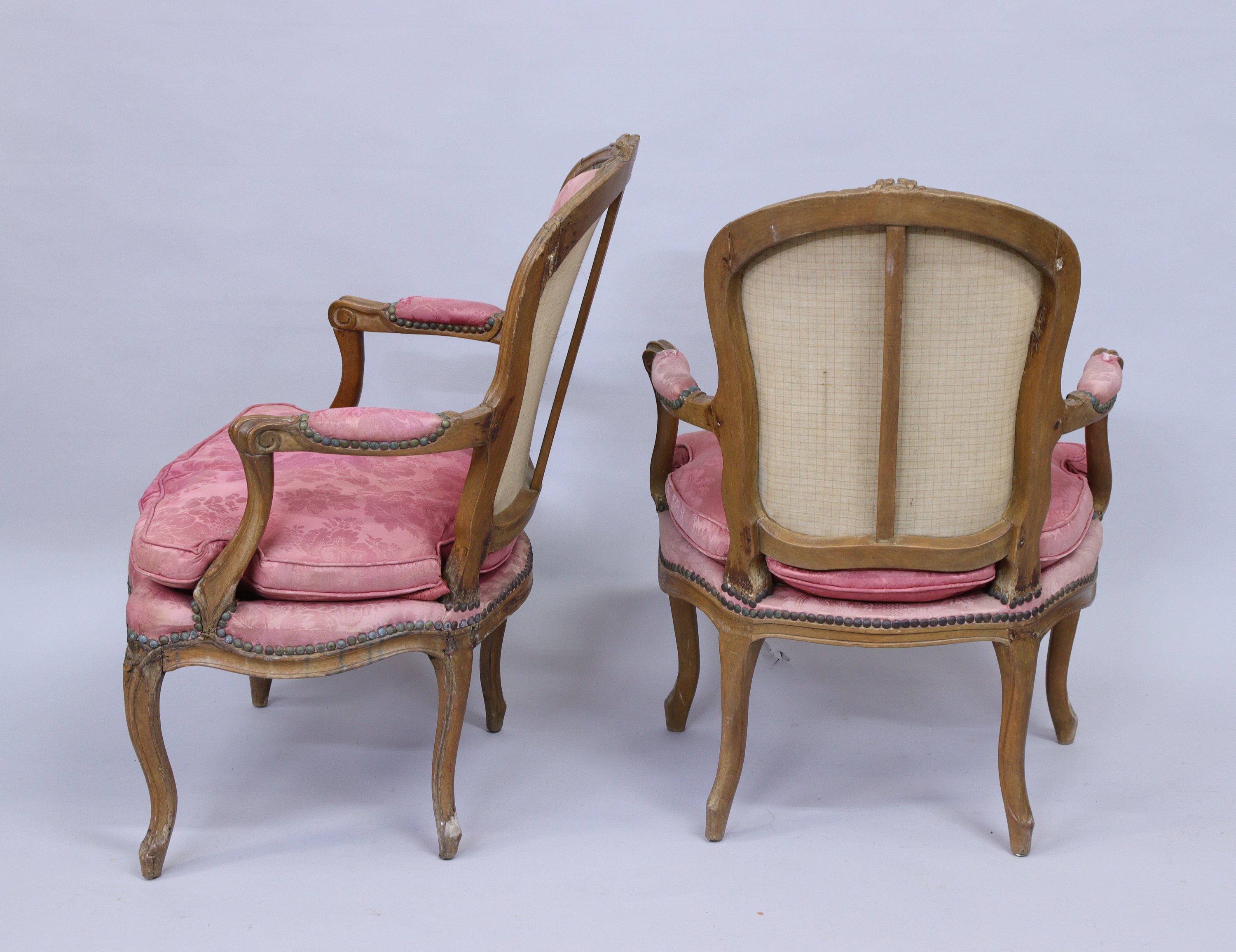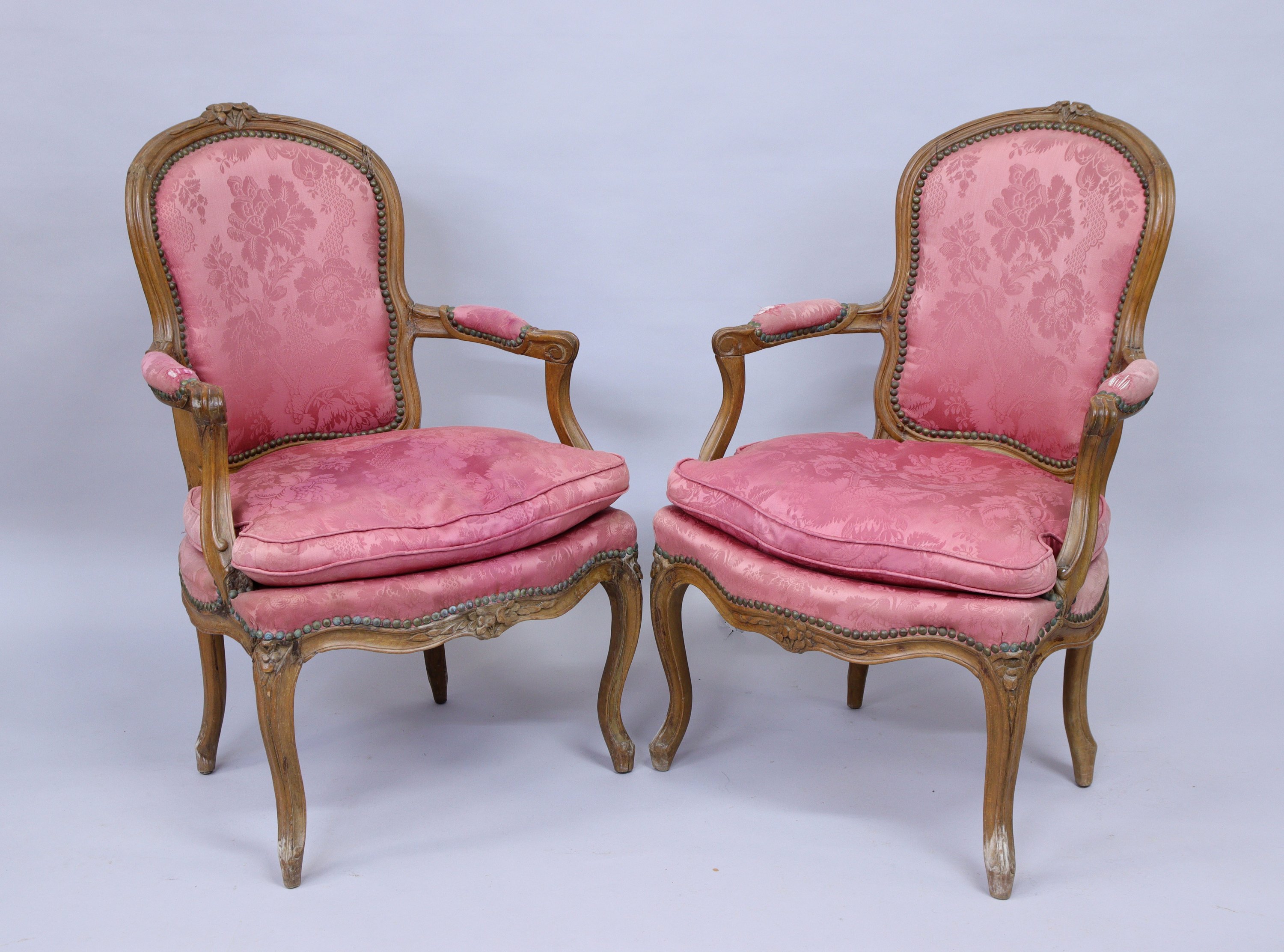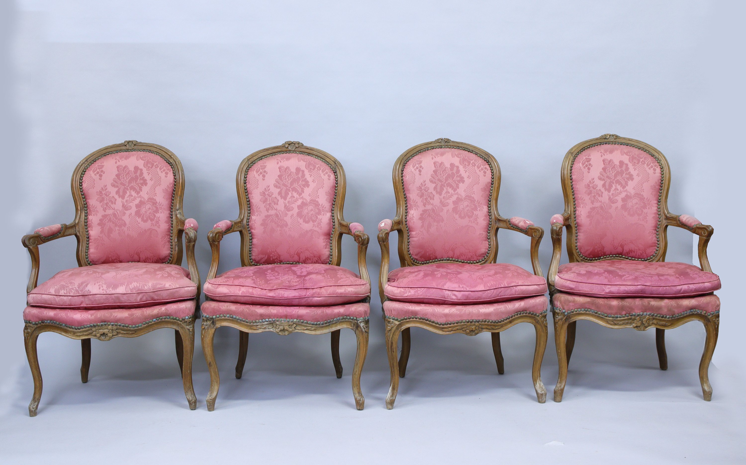 QUATRE FAUTEUILS CABRIOLET en hêtre mouluré et sculpté de feuillage et de fleurs épanouies.