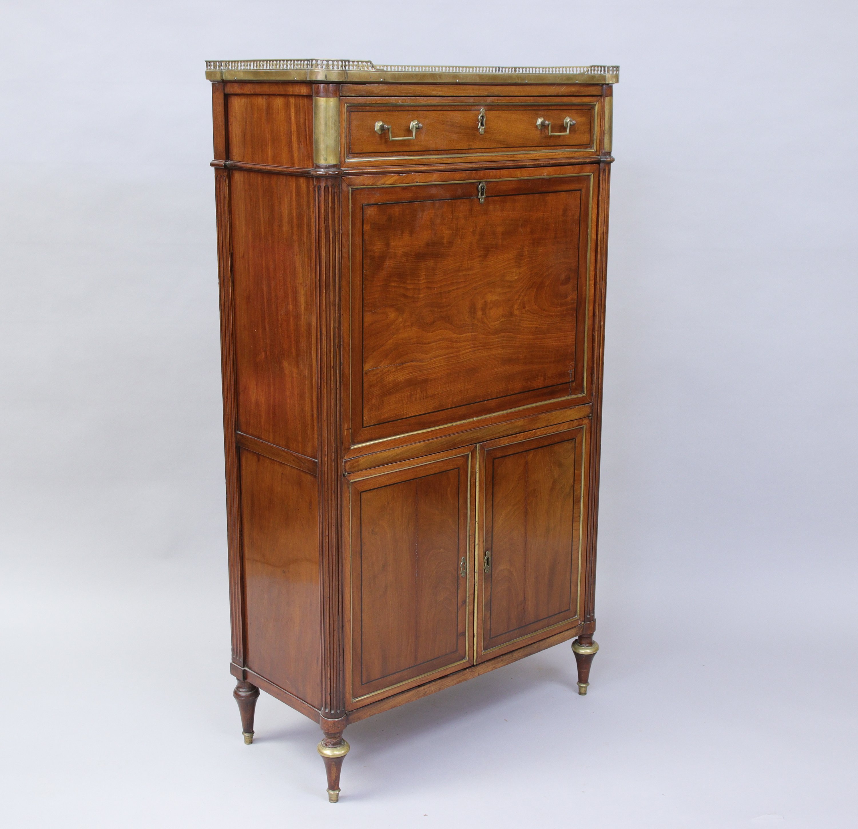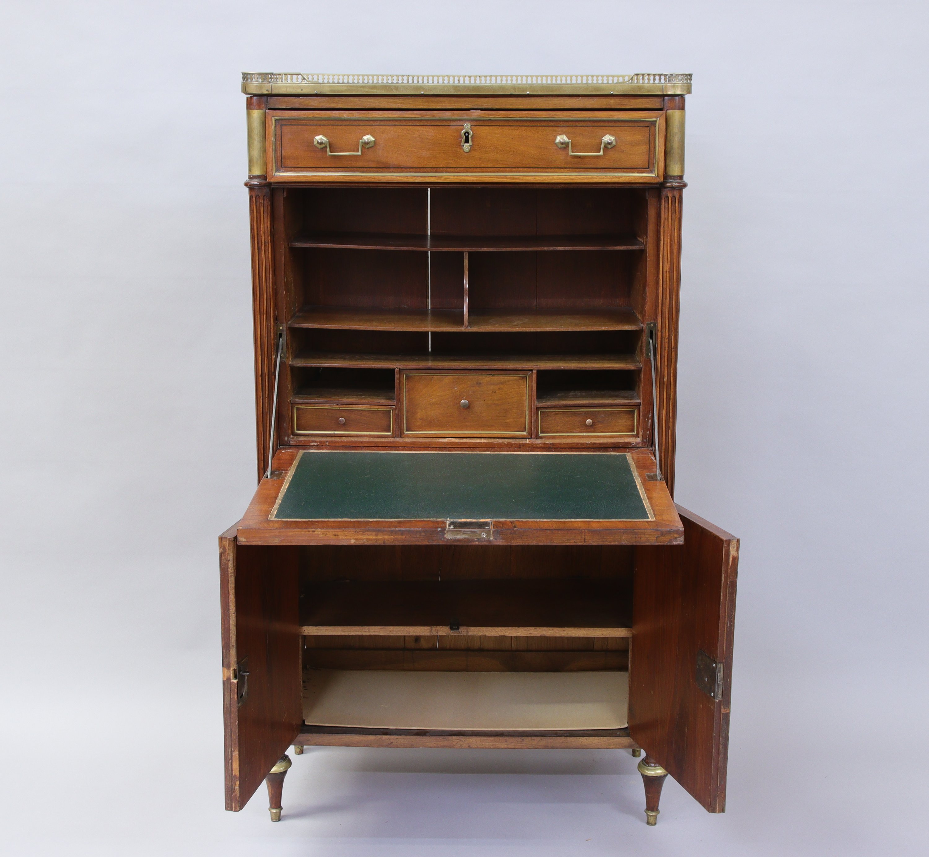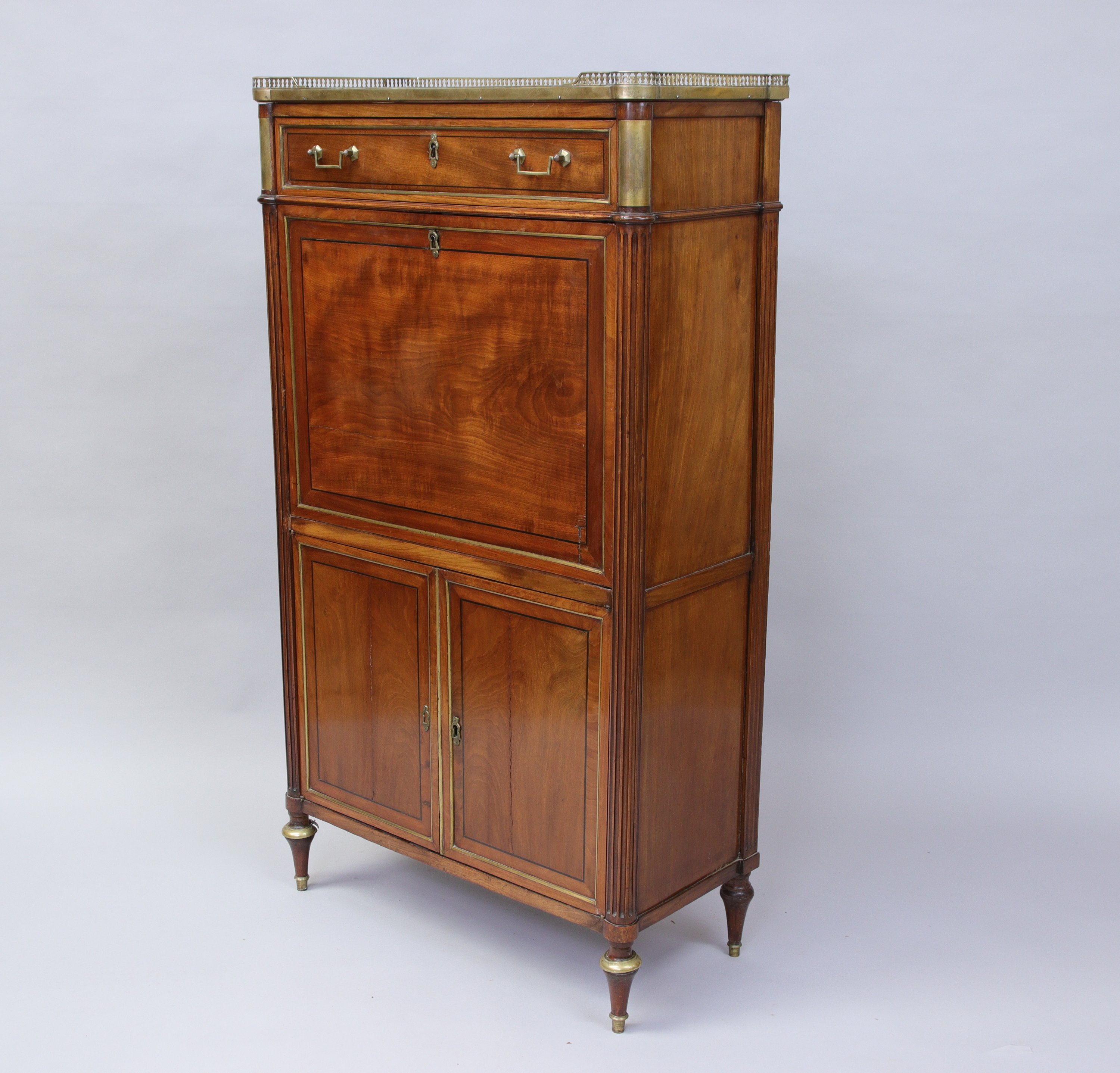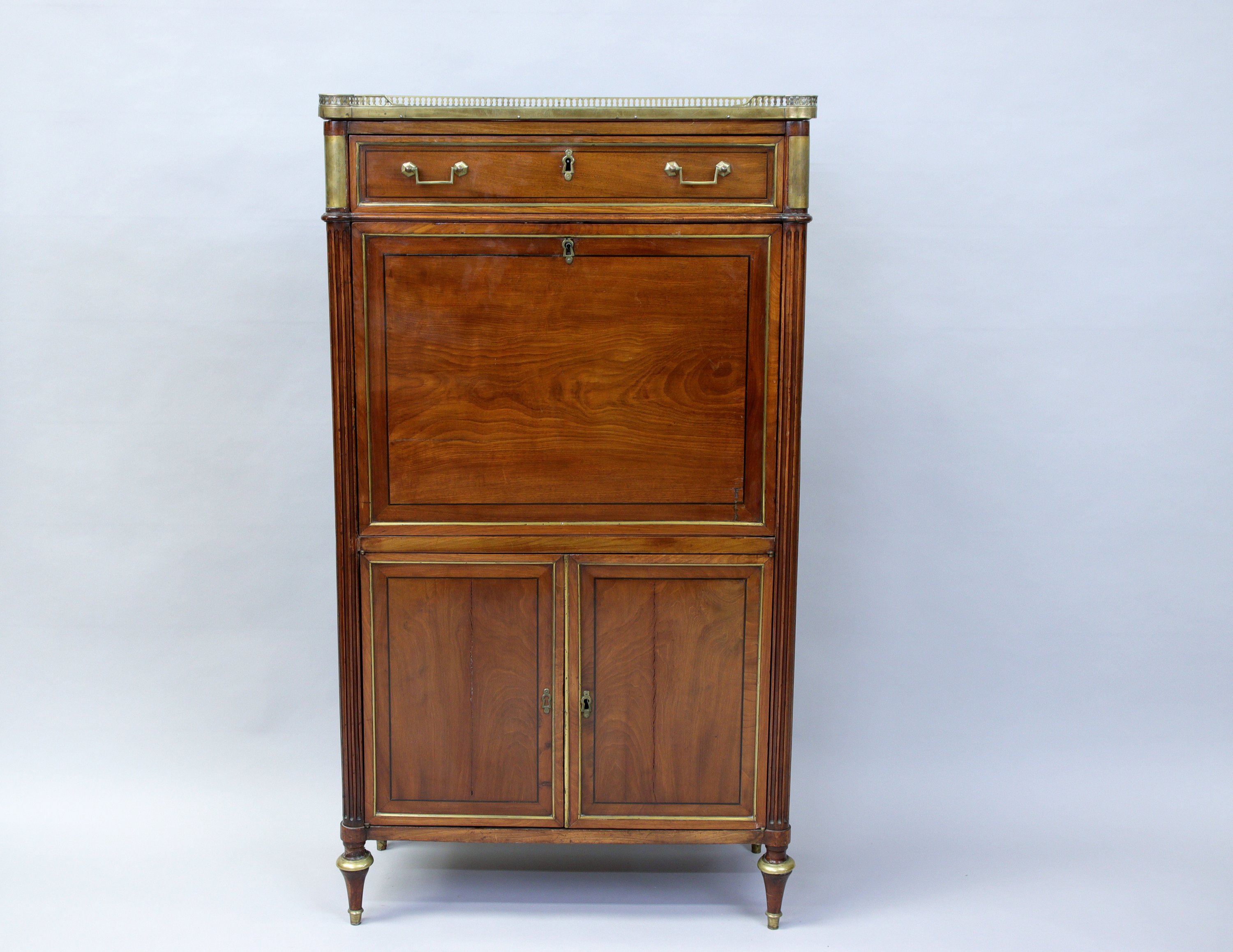 Il ouvre par un tiroir, un abattant et deux portes en partie basse. L'intérieur de l'abattant foncé de cuir découvre trois casiers et trois tiroirs. En partie basse, deux vantaux découvrent deux compartiments. Les montants antérieurs sont en colonne cannelée adossée dont le sommet est bagué de bronze doré. Les montants postérieurs sont en pilastres cannelés. Le piétement antérieur est orné d'une bague, et le tout de sabot en bronze doré.