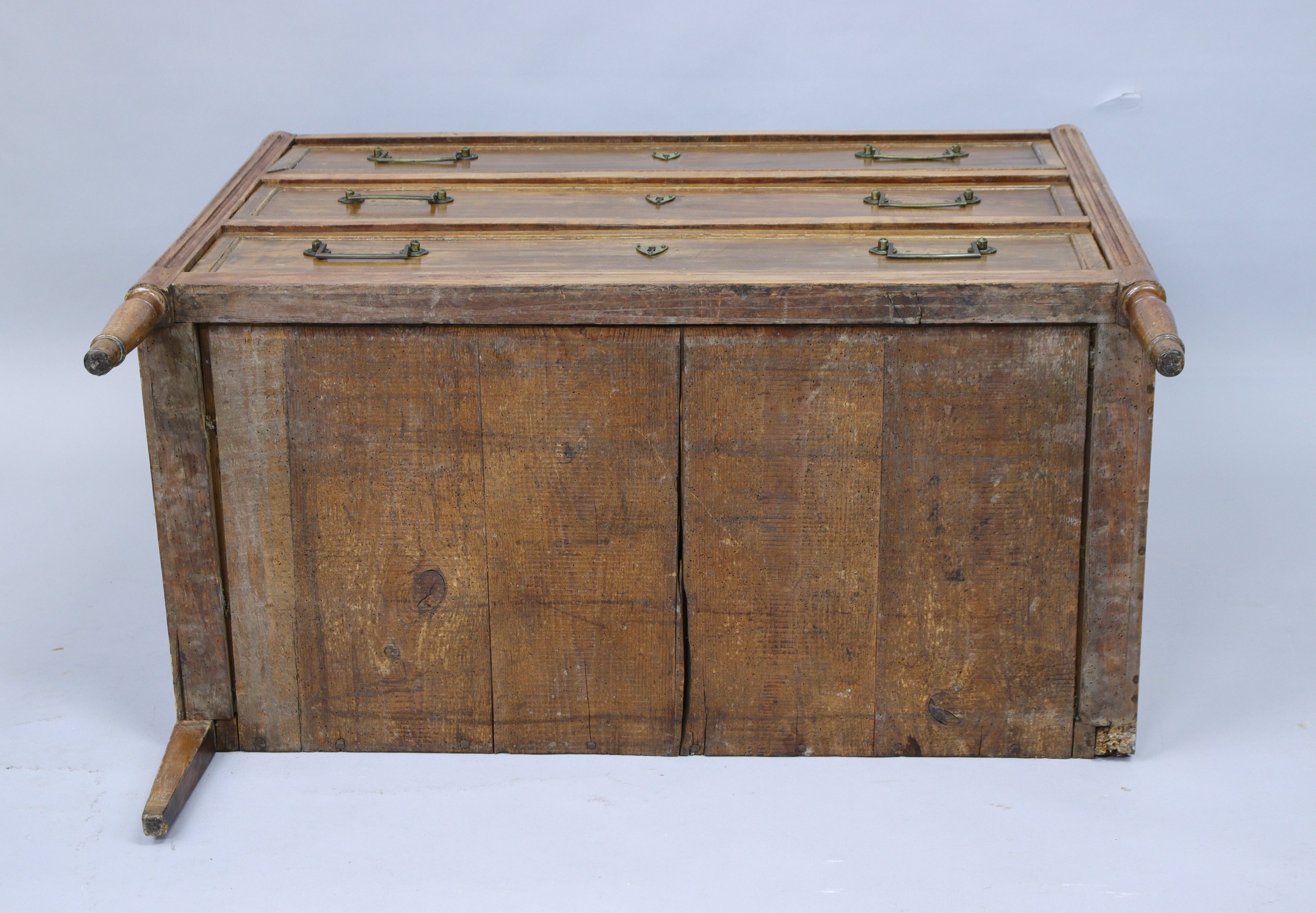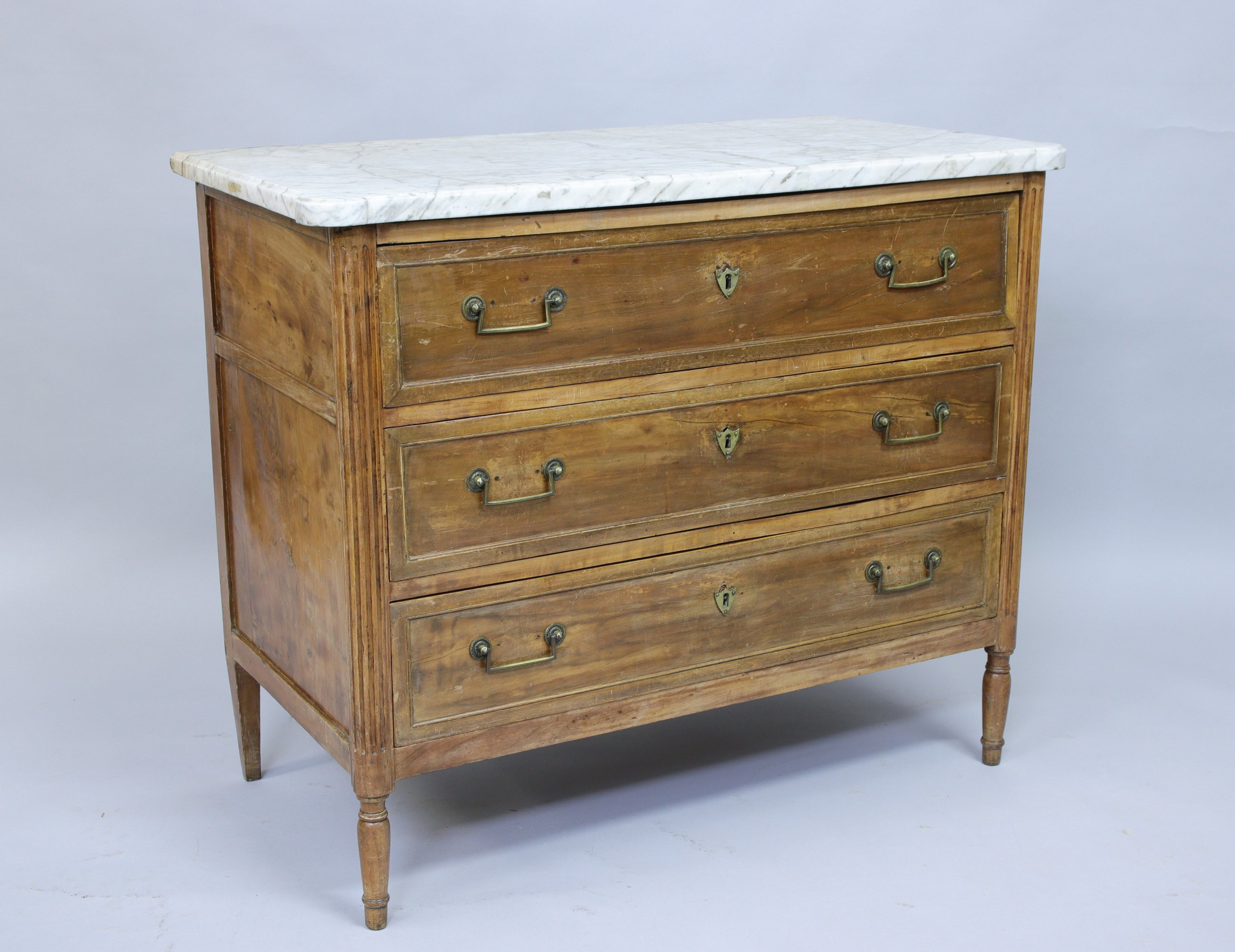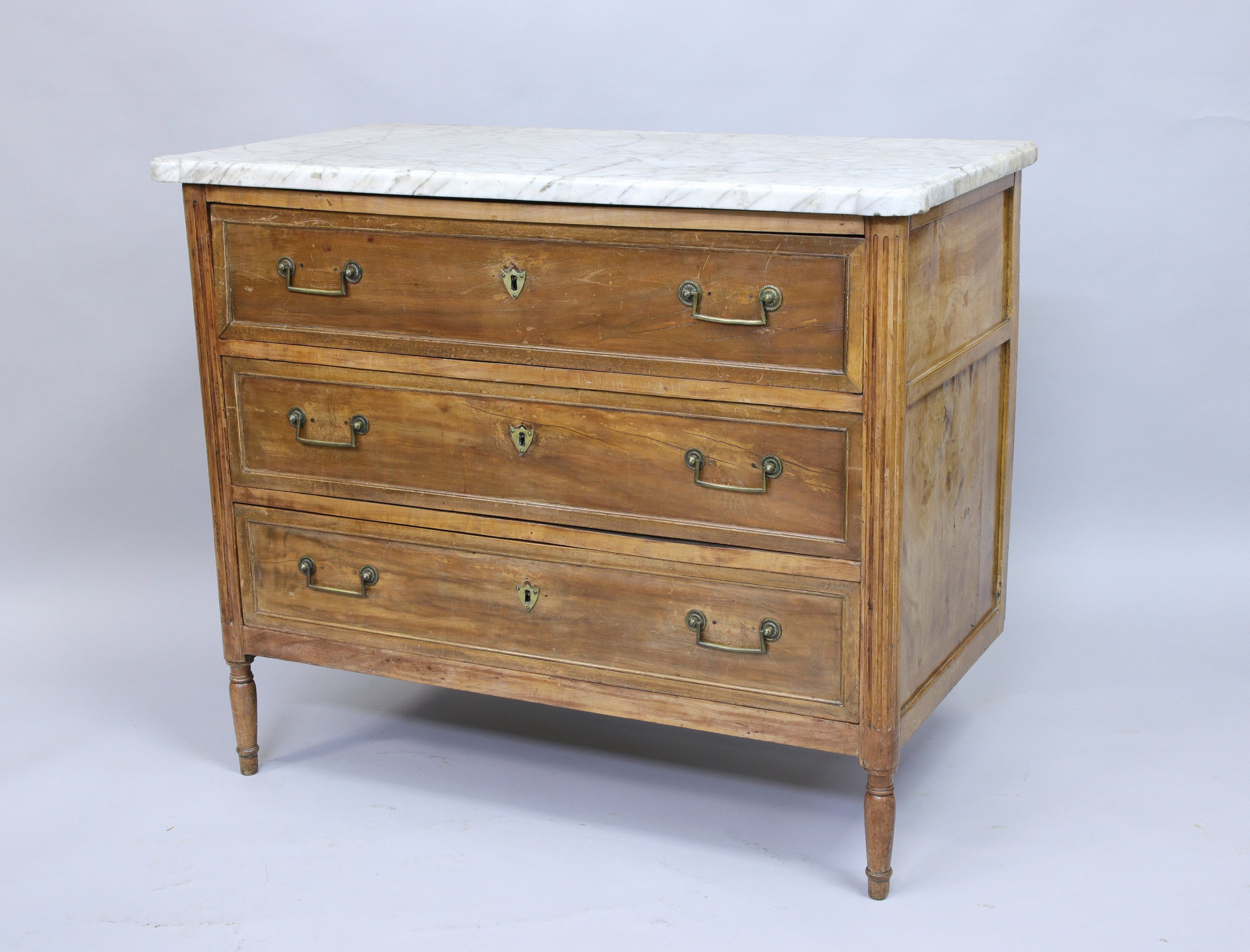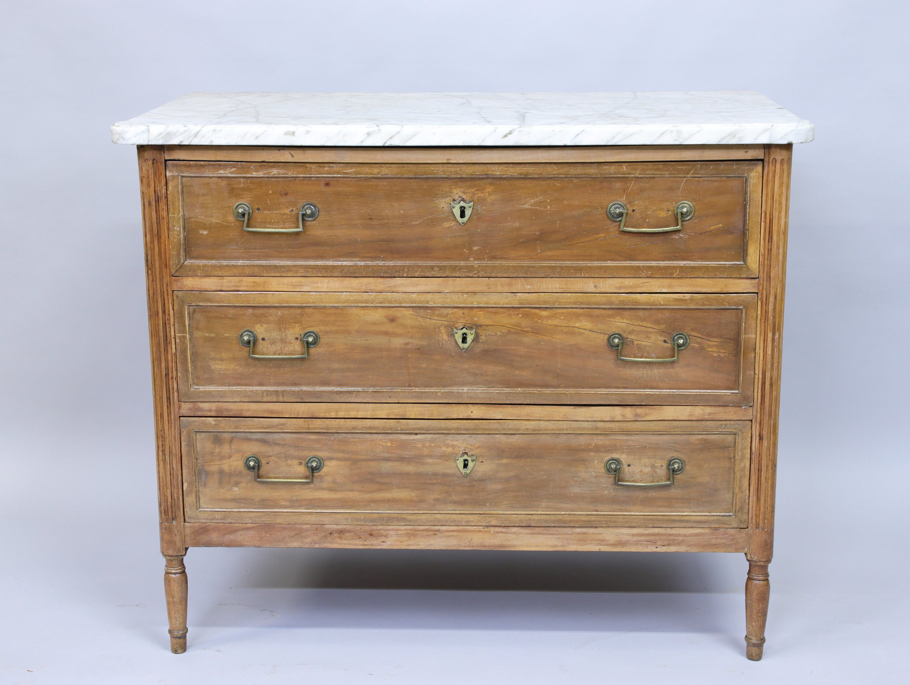 COMMODE en bois naturel anciennement vernis ouvrant par trois tiroirs. Poignées de tirages en laiton. Montants antérieurs en colonnes cannelées adossées. Piètement balustre.