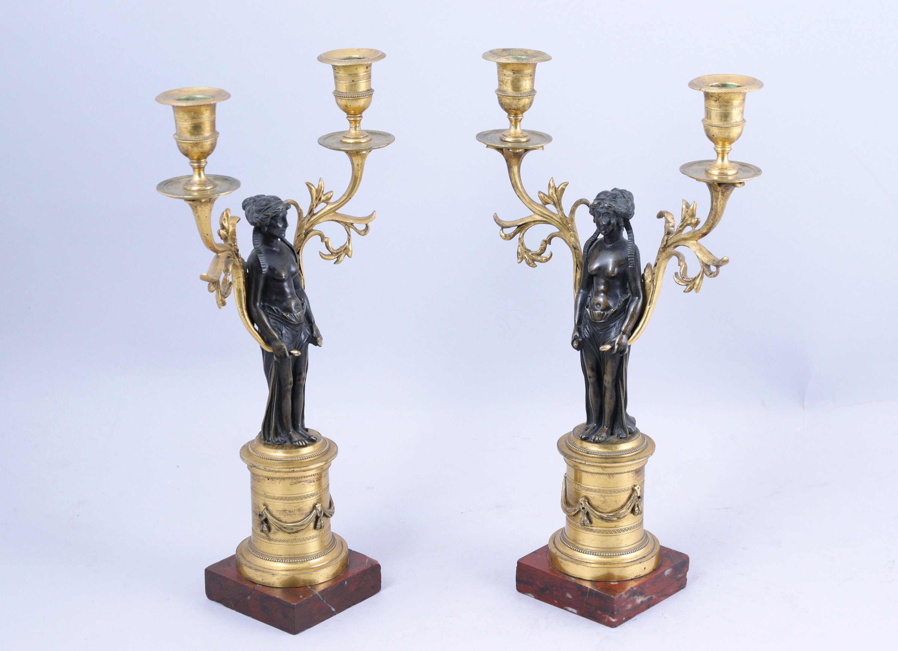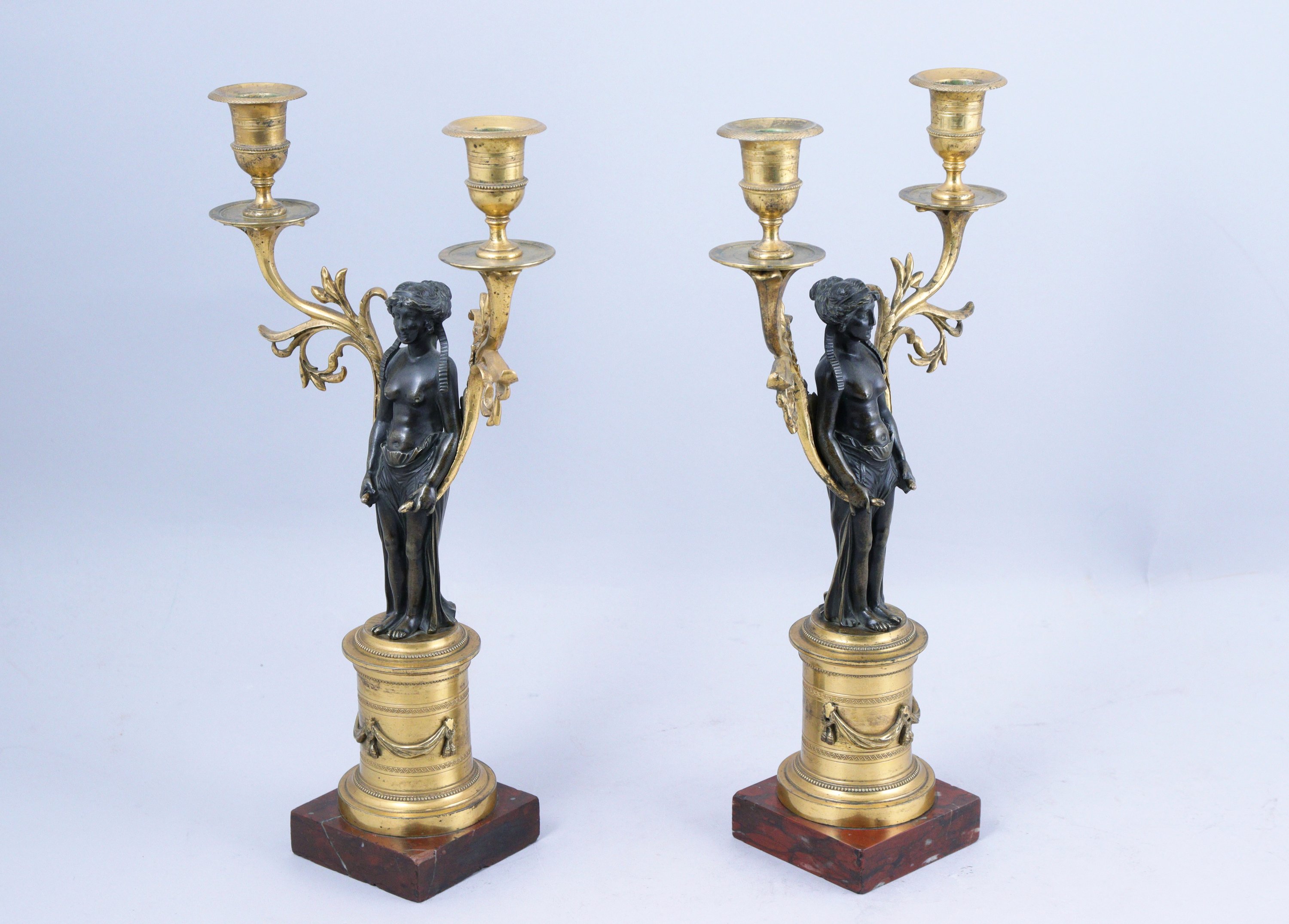 Paire de CANDÉLABRES AUX CARIATIDES en bronze doré et patiné, tenant chacune deux bras de lumière à motifs végétaux. La base circulaire ornée de rangs de perles et drapés tombants. Socles de marbre rouge.
