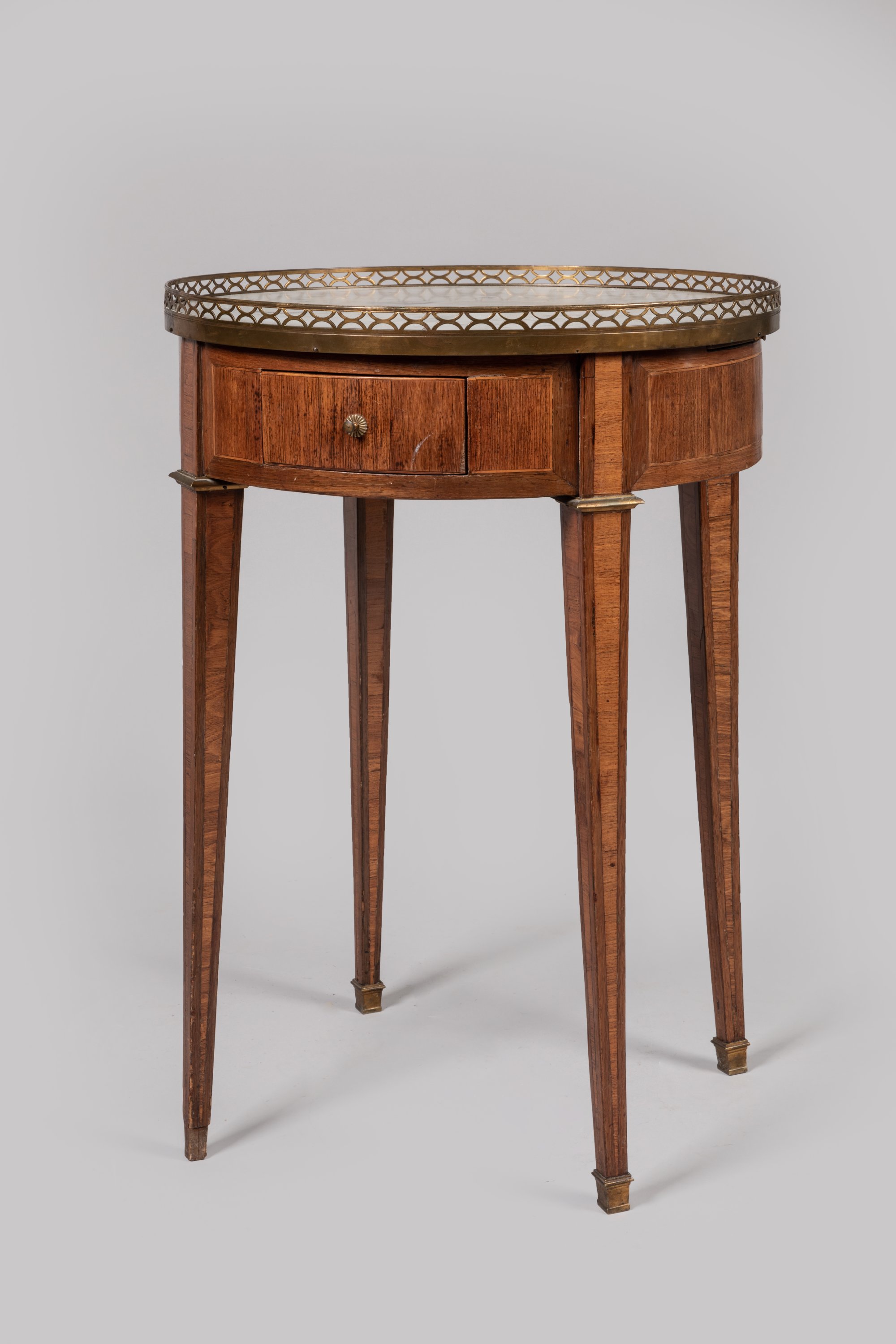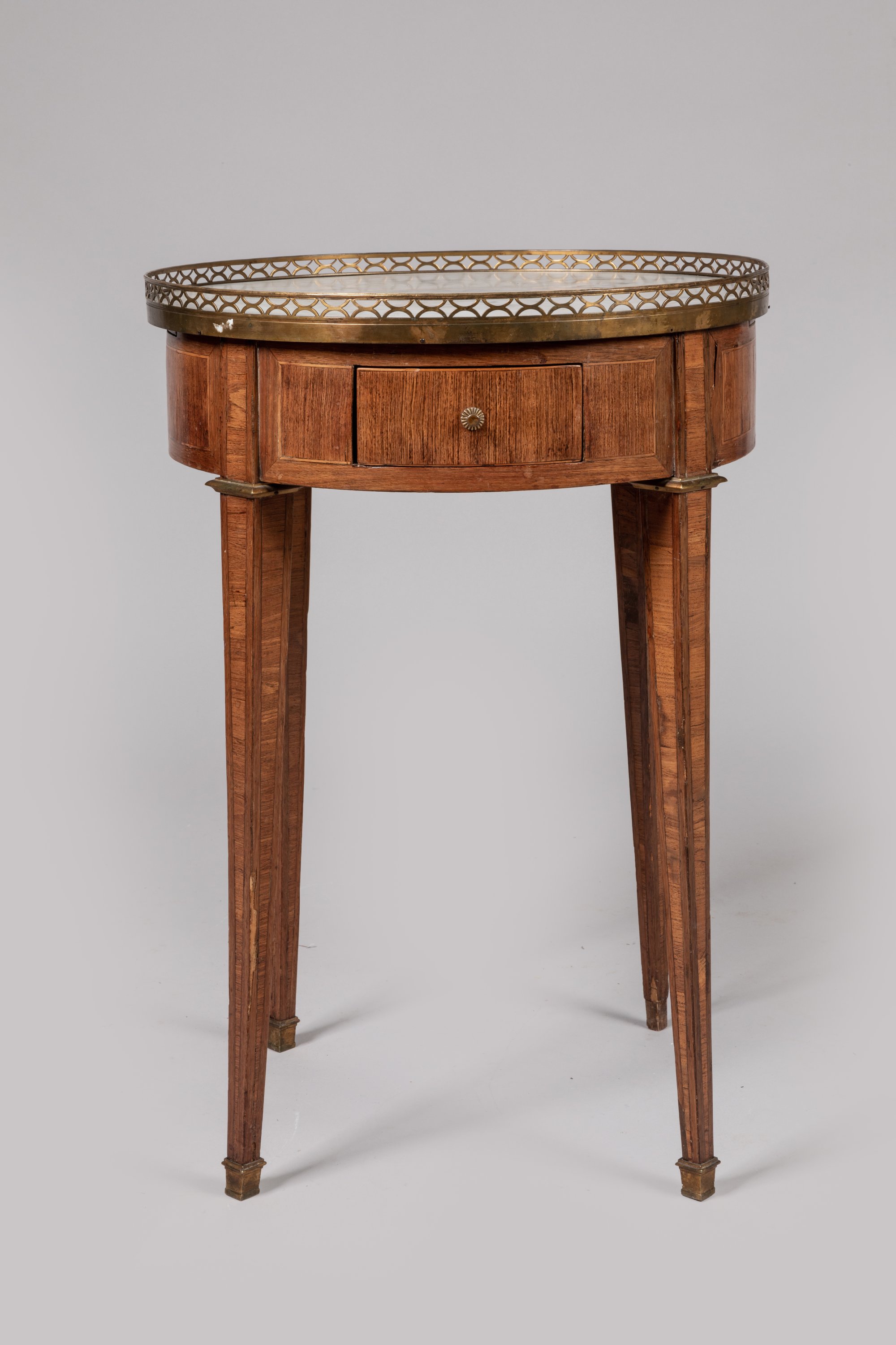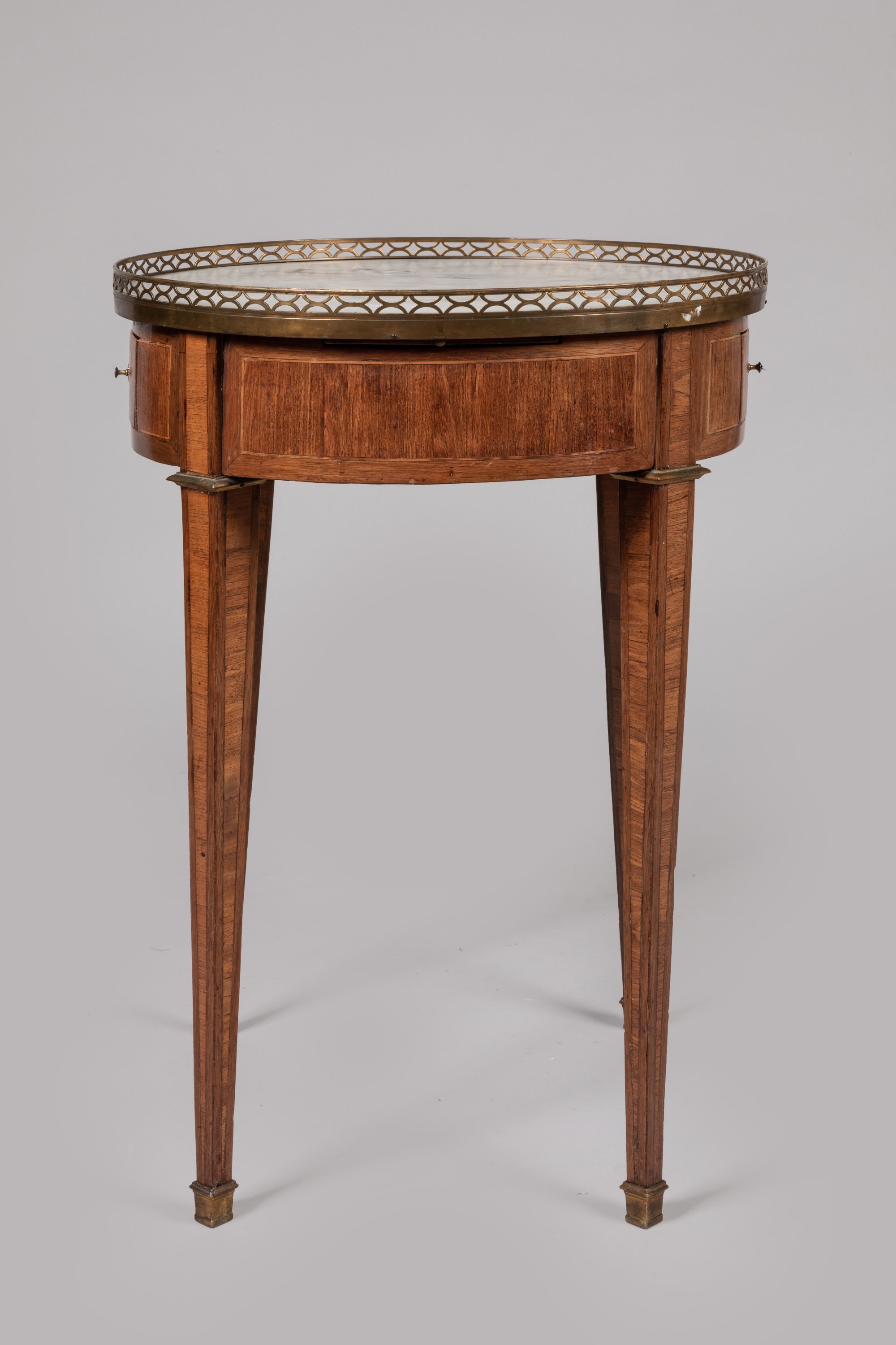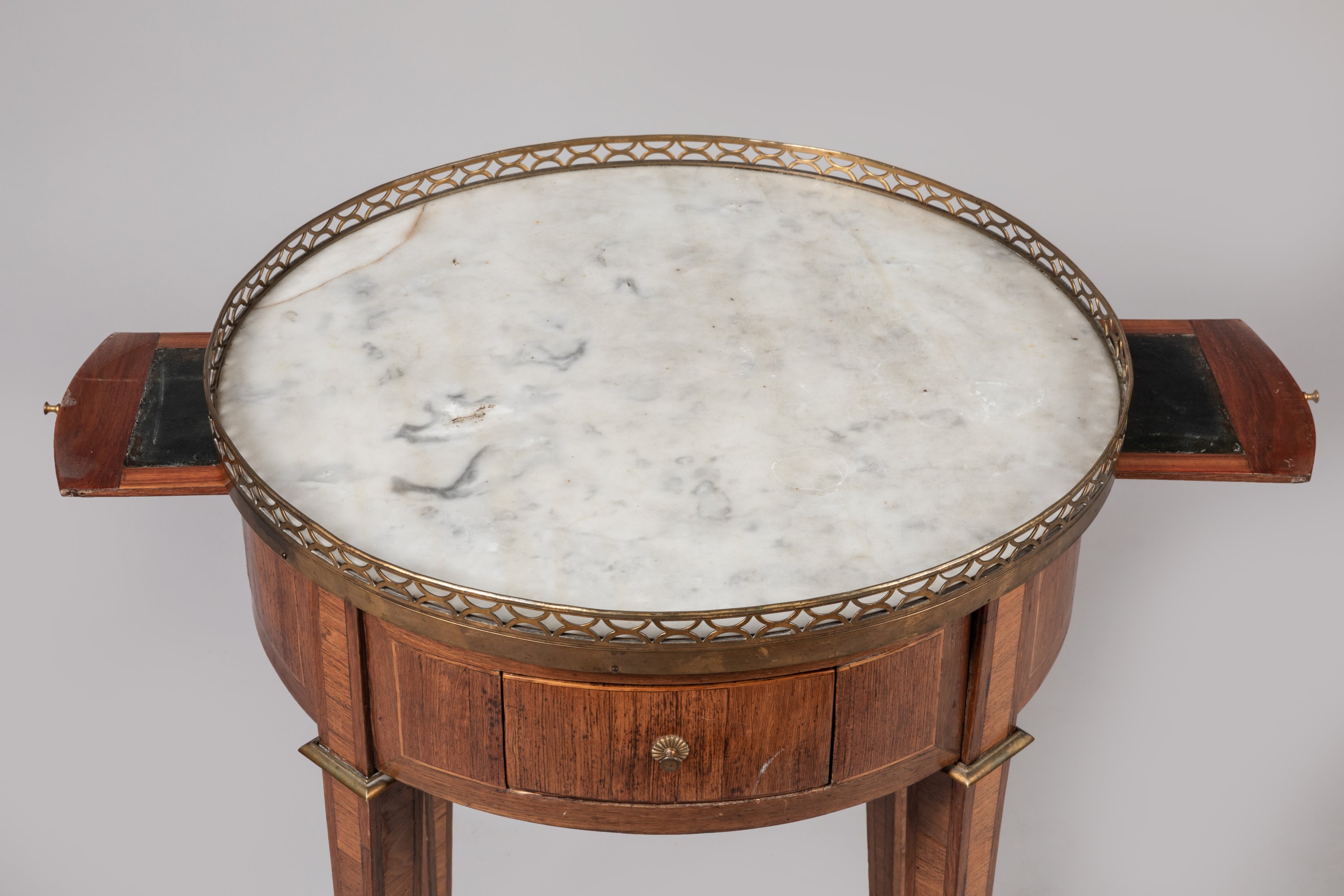 TABLE BOUILLOTTE en placage de bois de rose ouvrant à deux tiroirs et deux tirettes en ceinture et reposant sur des pieds gainés. Marbre blanc à galerie ajourée en bronze.