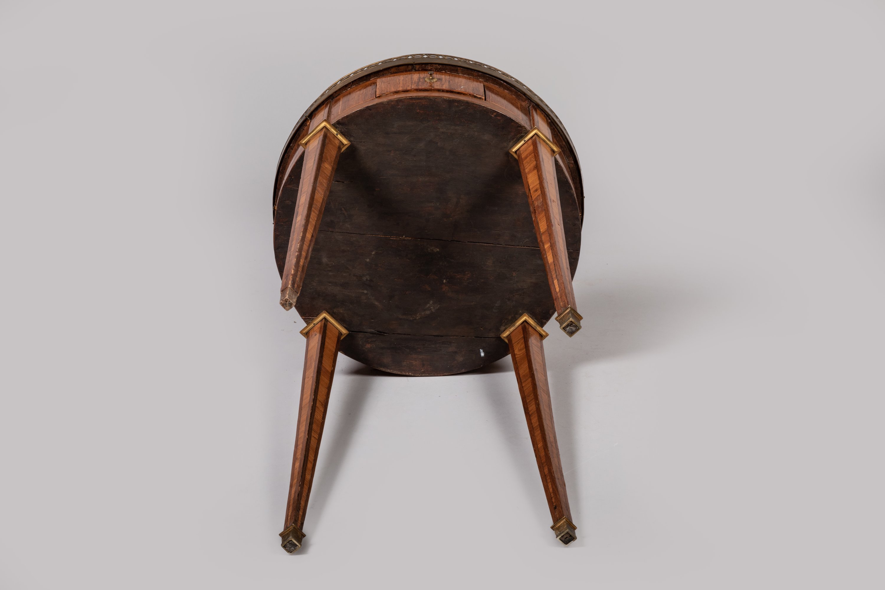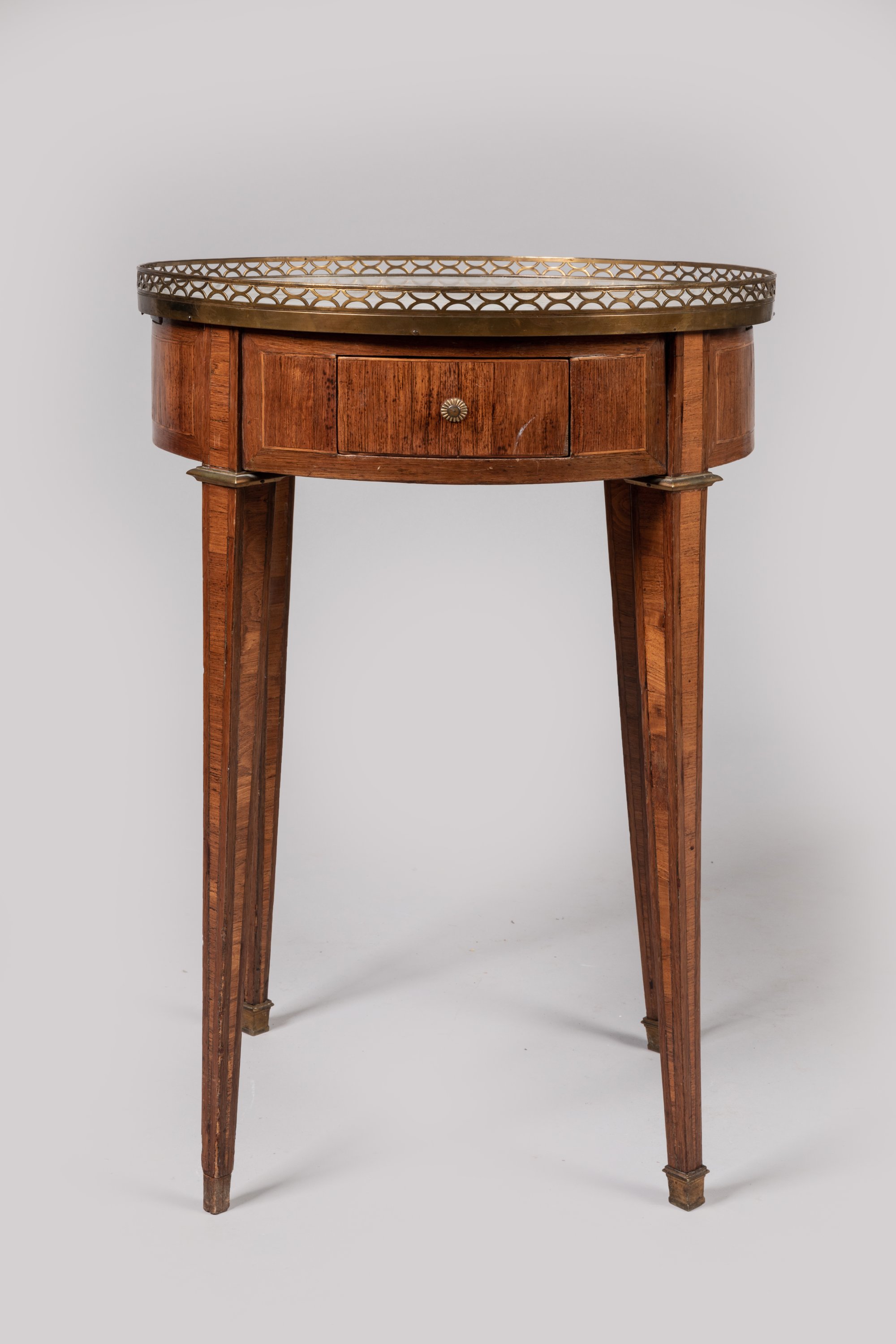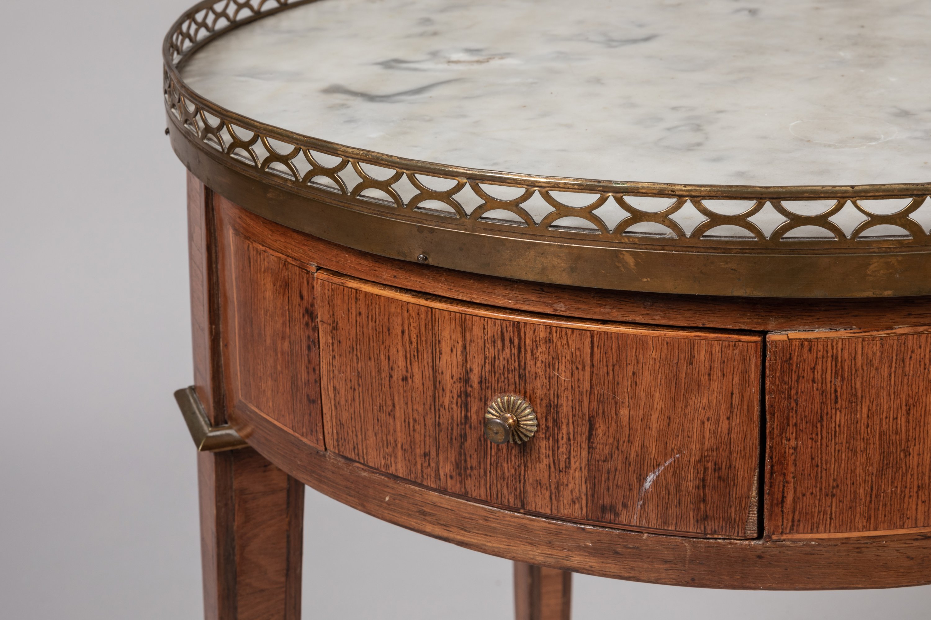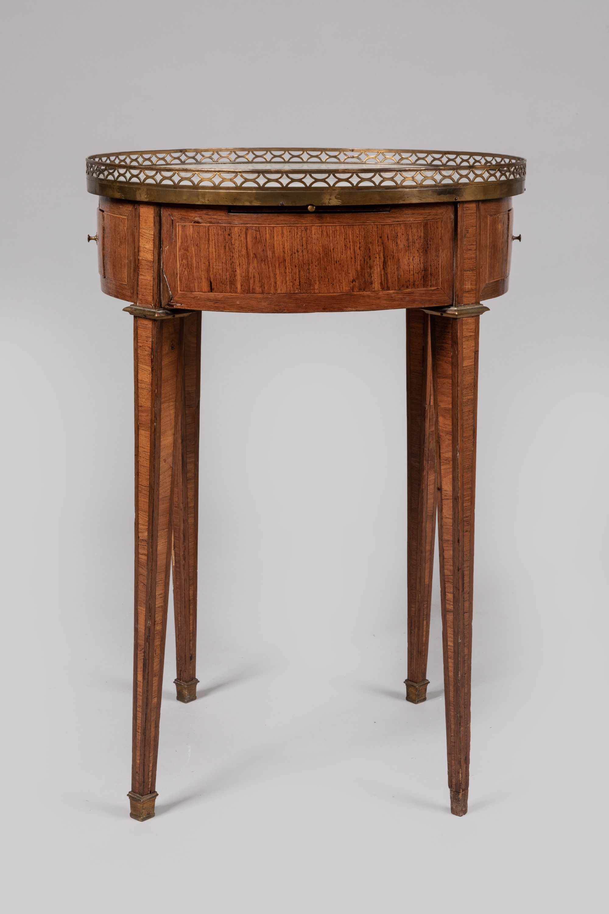 TABLE BOUILLOTTE en placage de bois de rose ouvrant à deux tiroirs et deux tirettes en ceinture et reposant sur des pieds gainés. Marbre blanc à galerie ajourée en bronze.