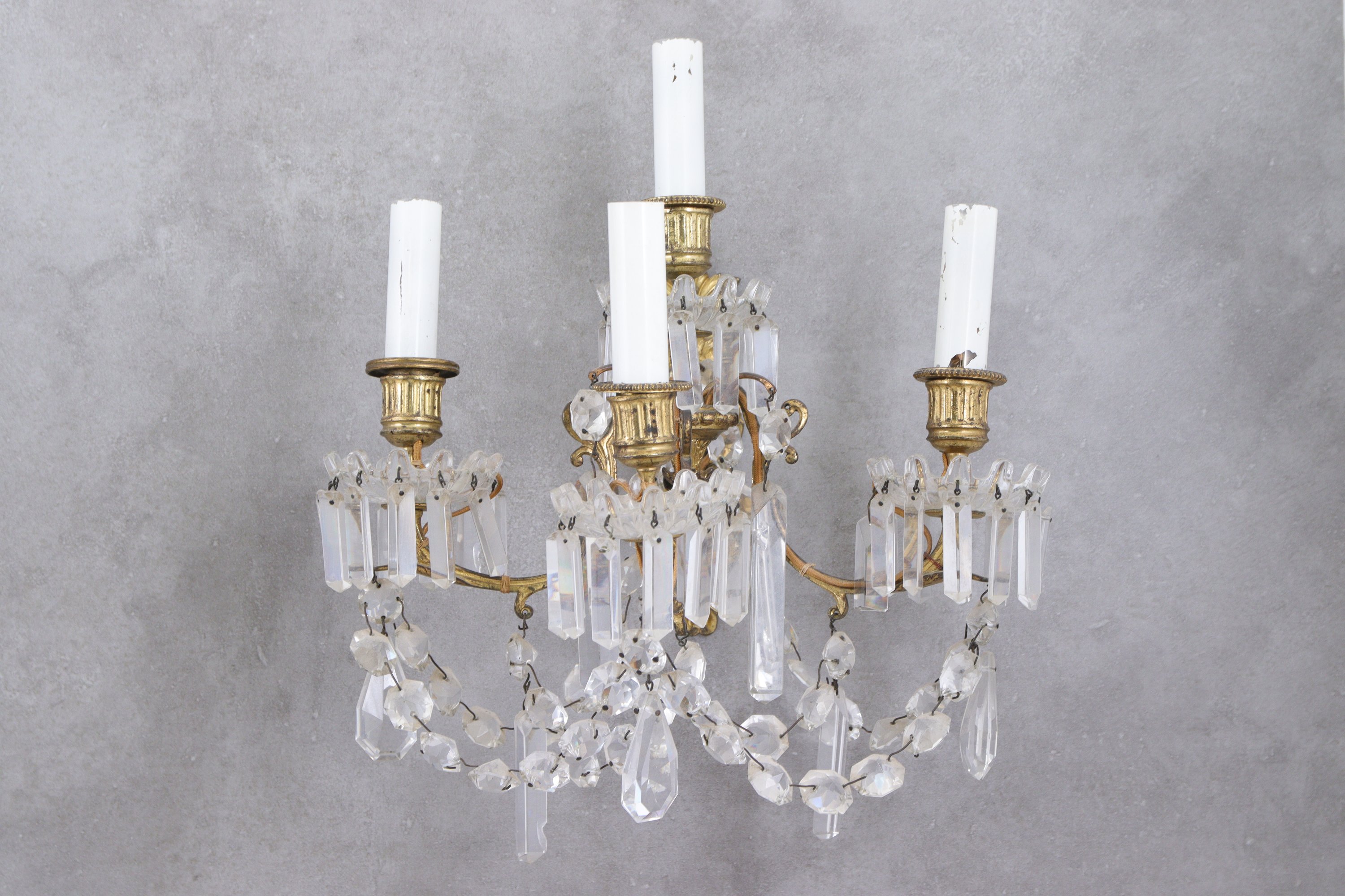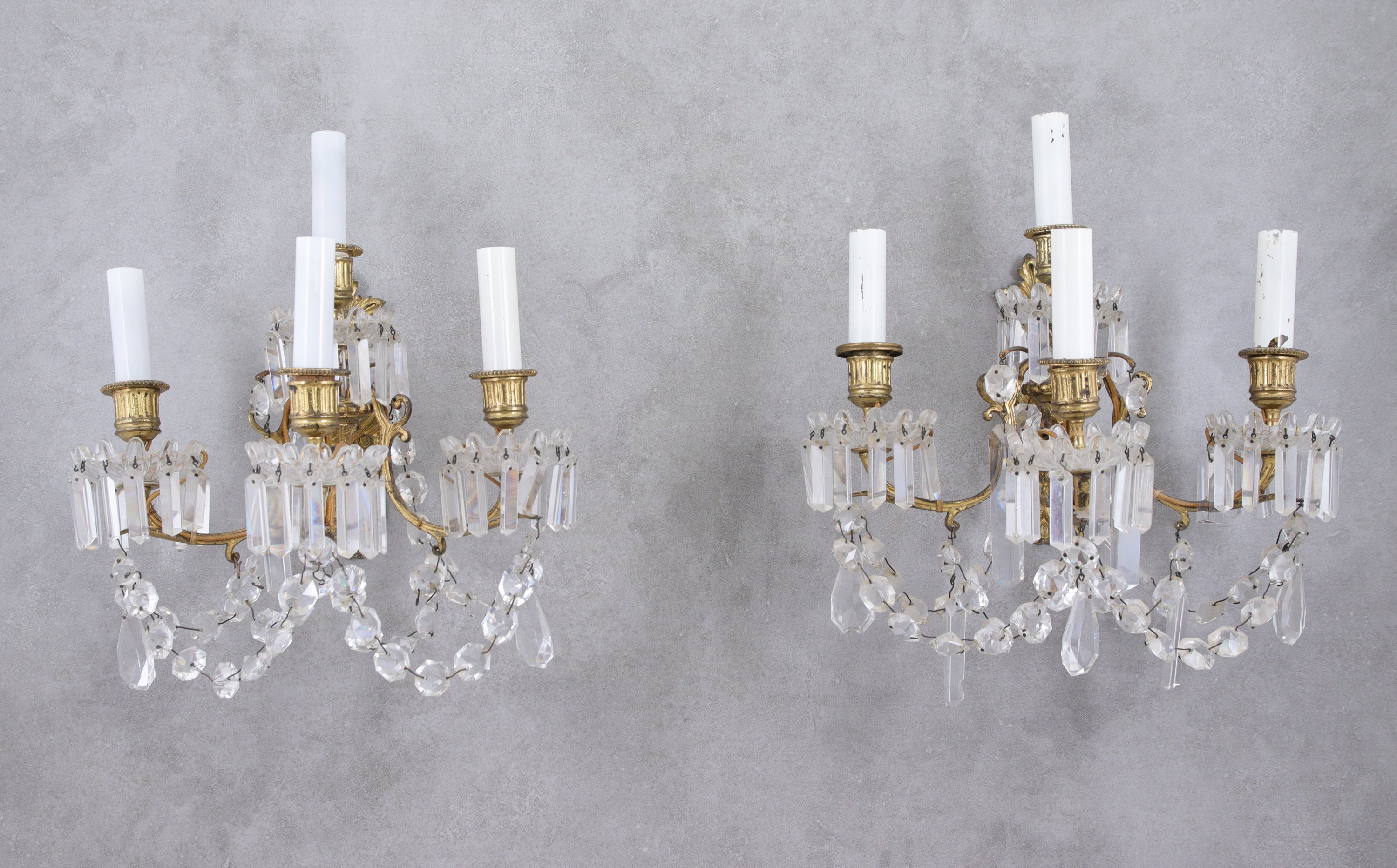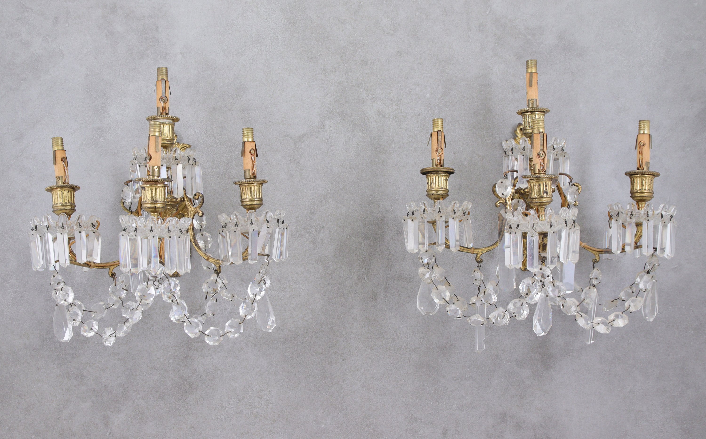 PAIRE d'APPLIQUES EN DEMI GIRANDOLE en bronze doré et cristal à quatre bras de lumières sur deux niveaux. Décor de rinceaux feuillagés pour les bras, de pampilles et de guirlandes de cristal. Les binets à décors guilloche et bobèches à bagues perlées et cannelées.