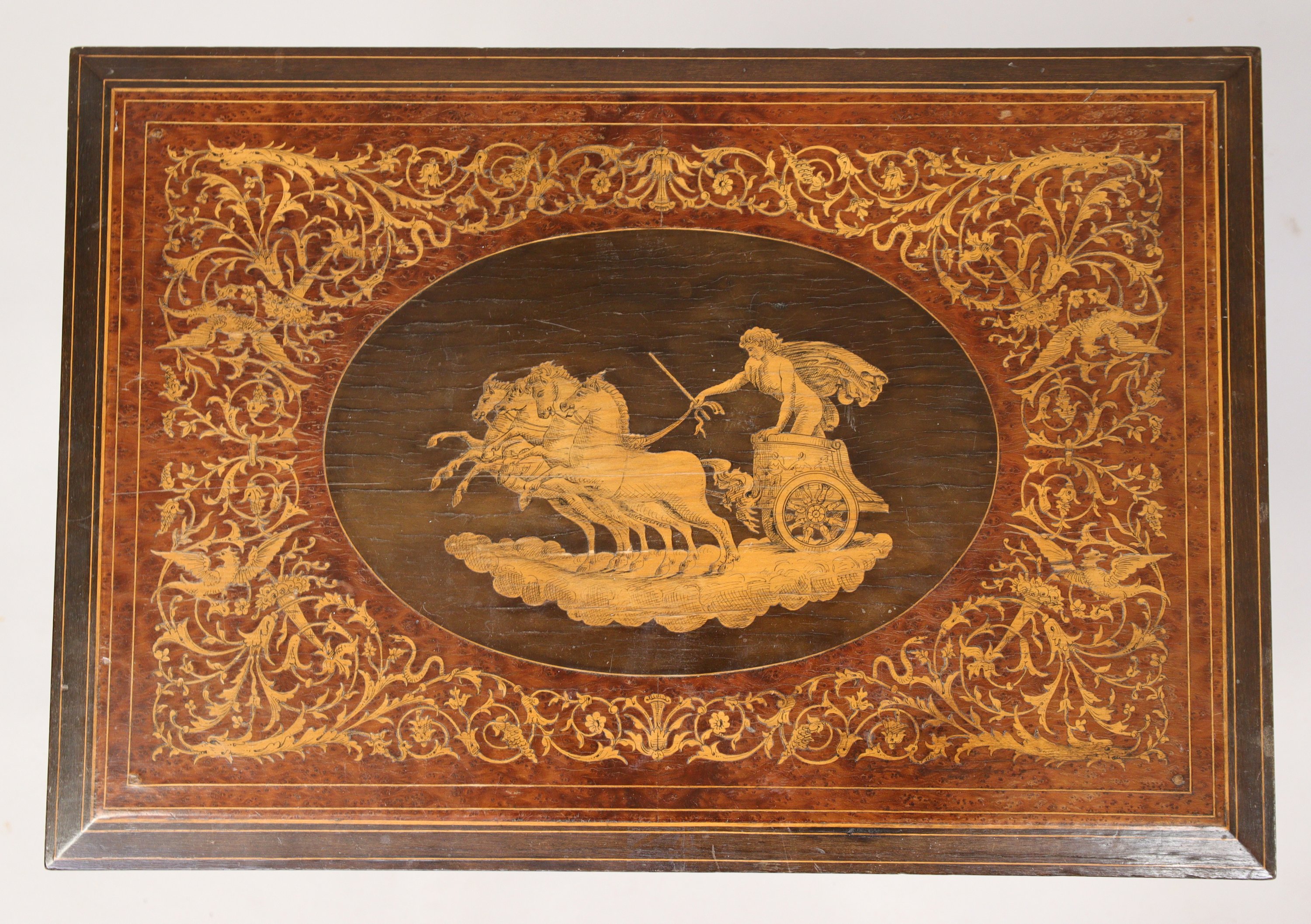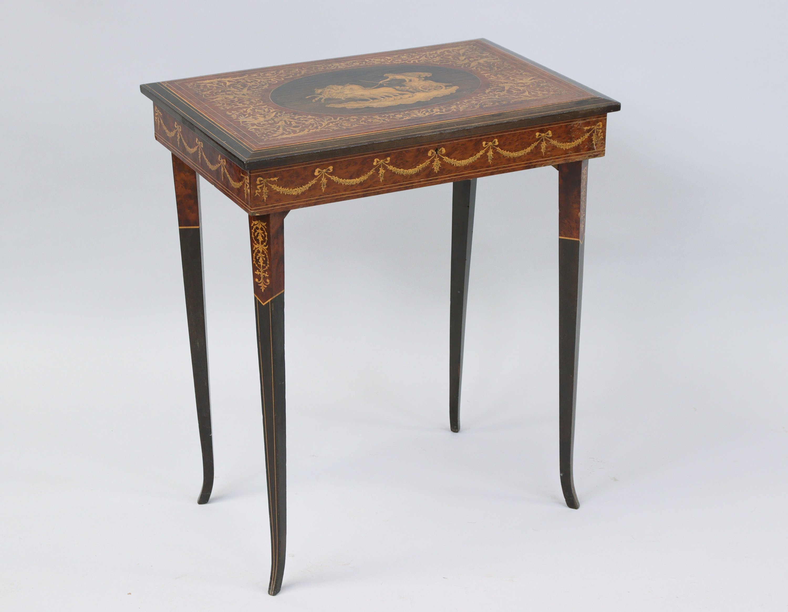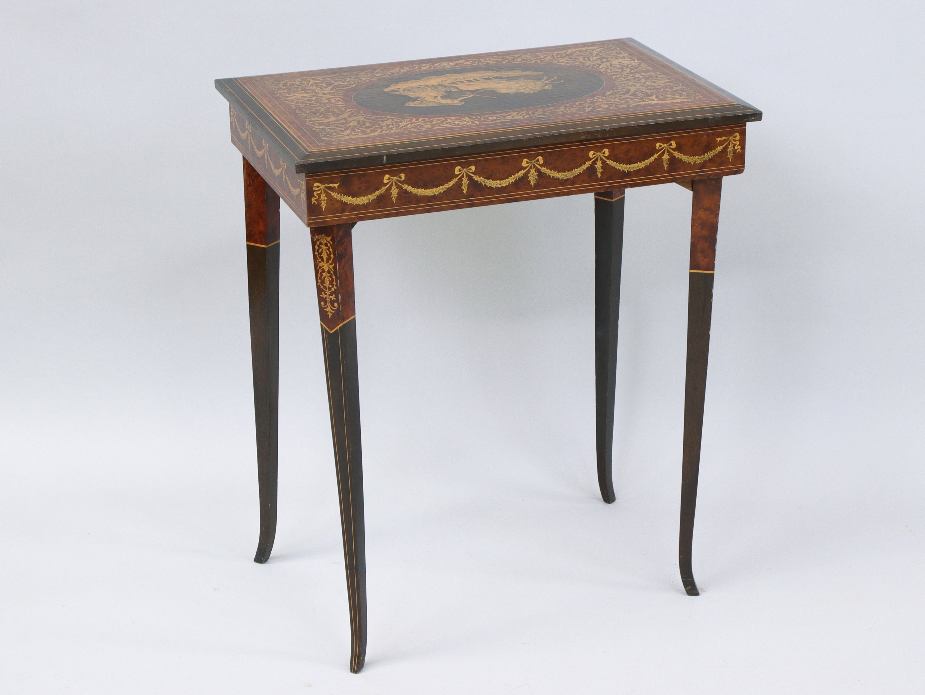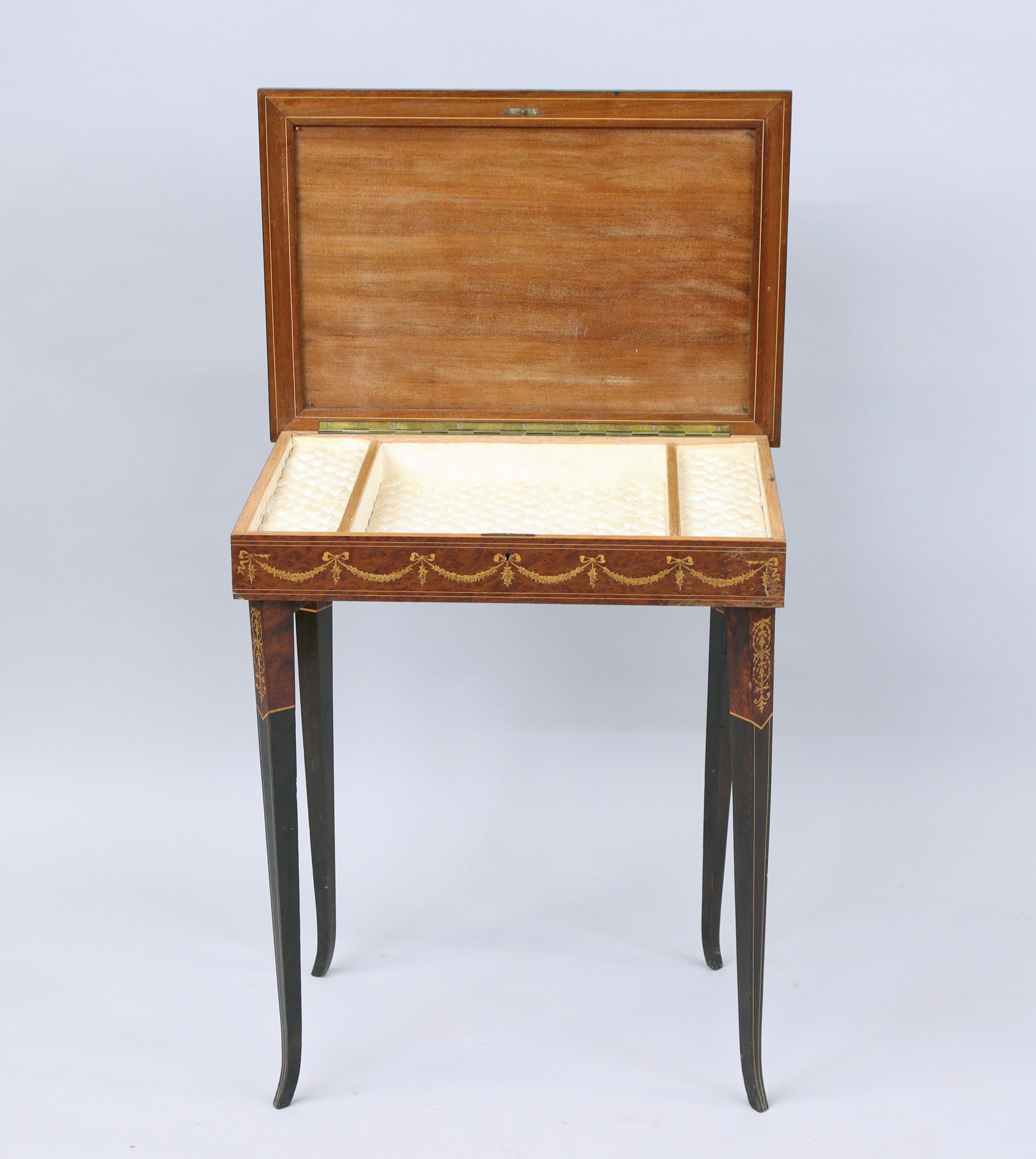 le plateau orné au centre d'un médaillon présentant le char d'Apollon entouré de riches rinceaux. Il découvre trois compartiments garnis de tissu capitonné. Sous l'un deux est hébergé un mécanisme de boîte à musique. Il se remonte par une clé se trouvant sous le plateau. La ceinture est décorée de guirlandes de nuds et végétaux. La table repose sur quatre pieds dont les extrémités sont cambrées.
