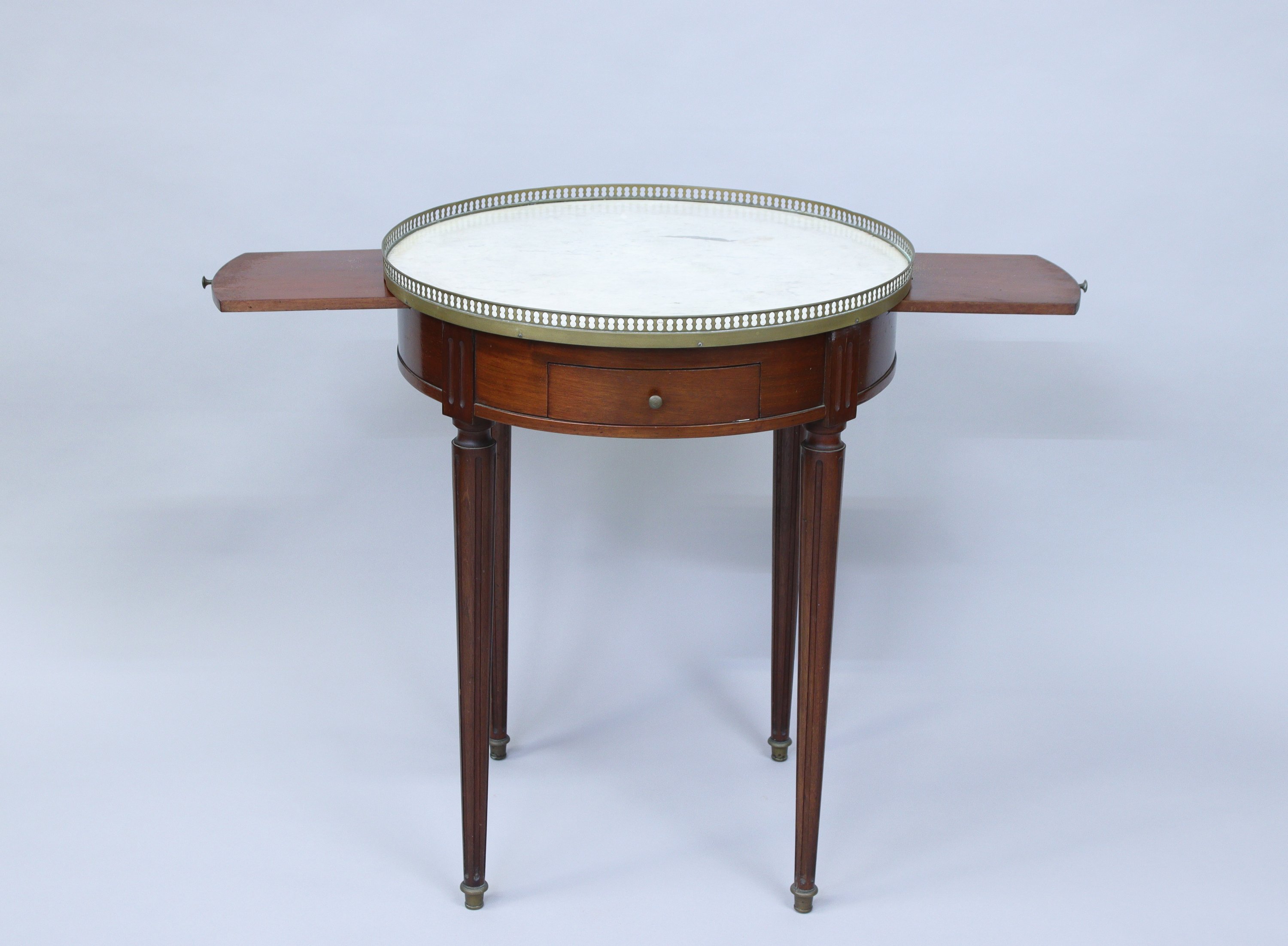 Plateau rond en marbre de Carrare ceint dune galerie en laiton.