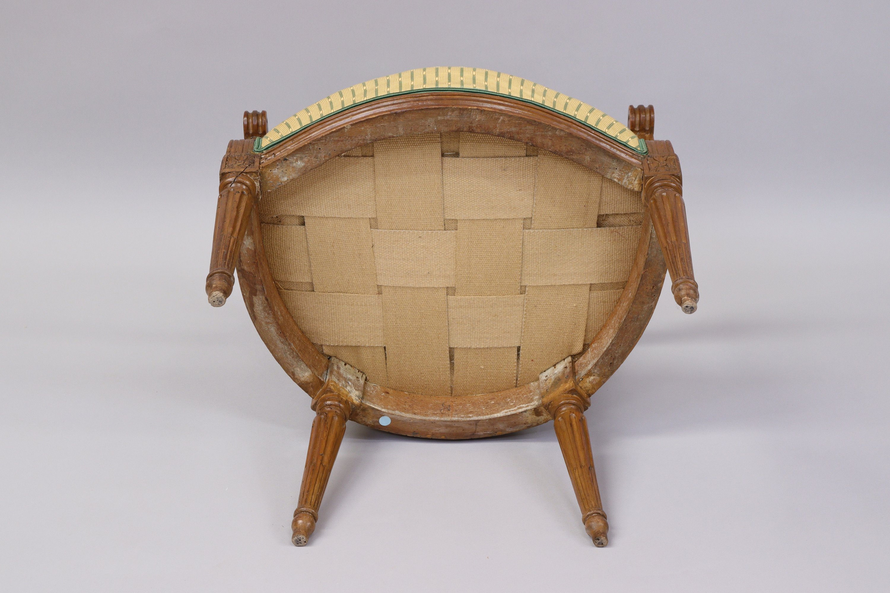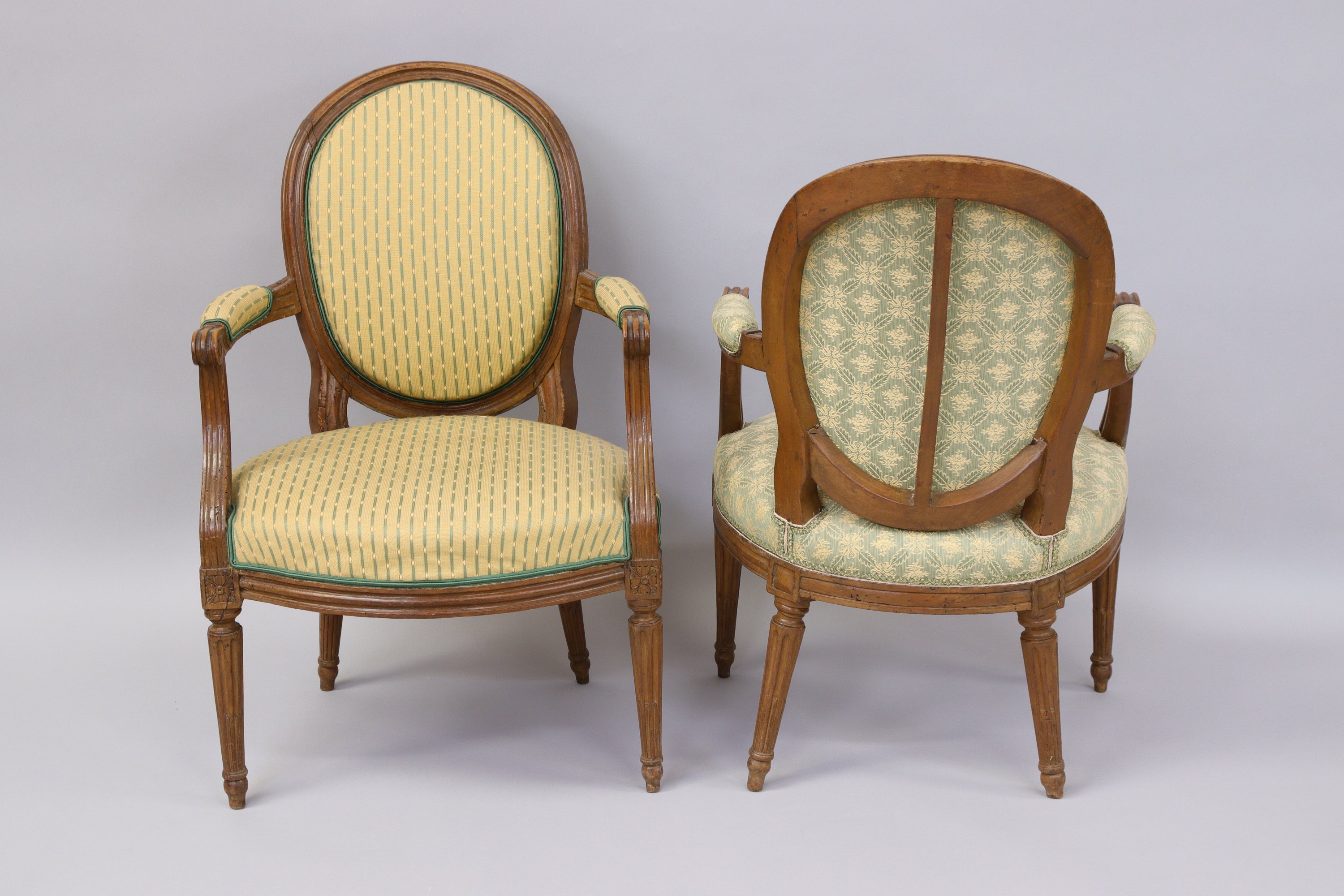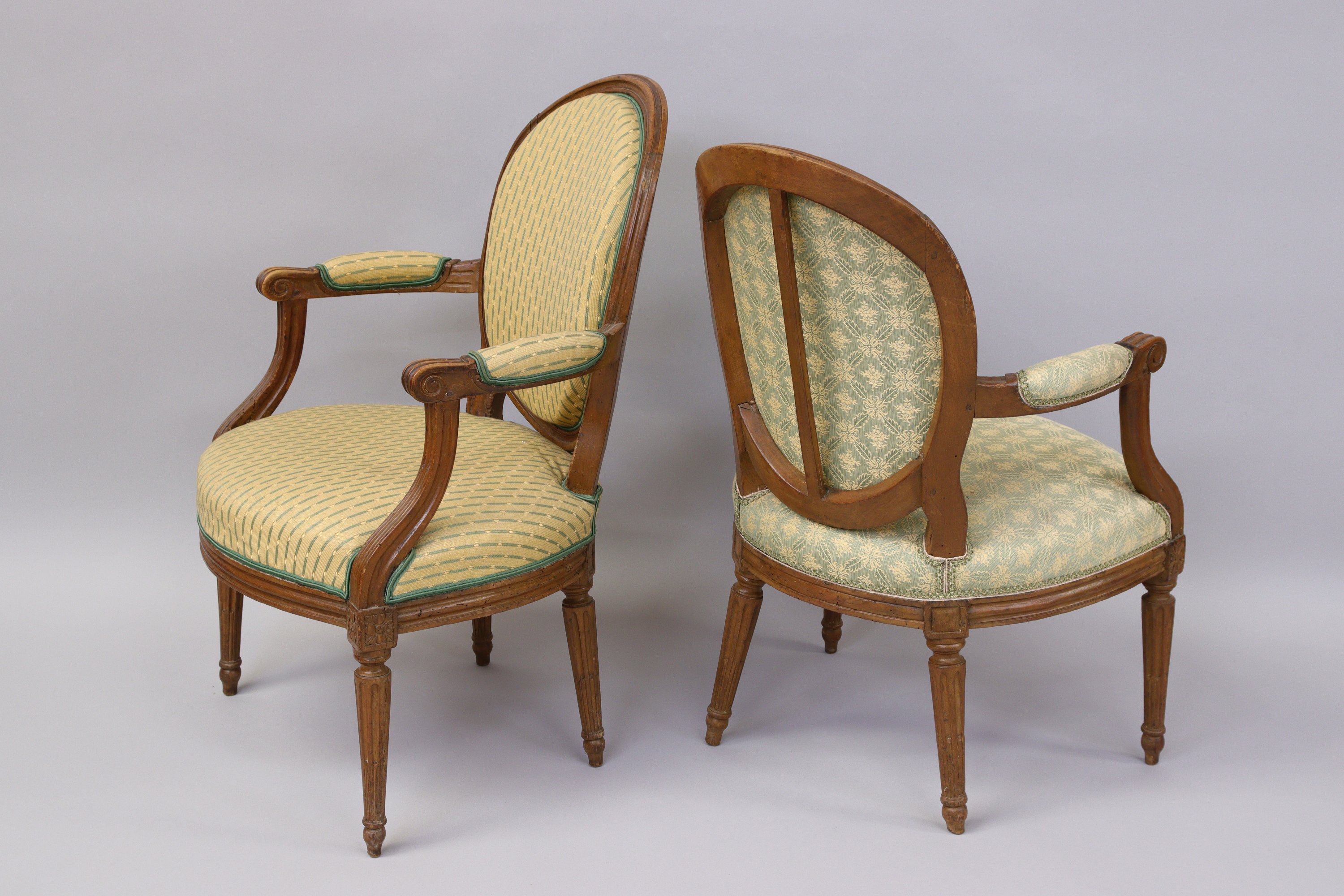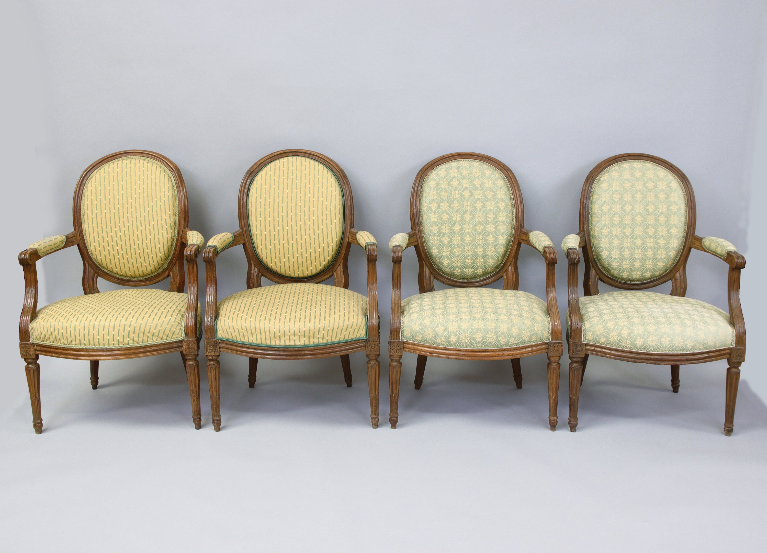 SUITE de QUATRE FAUTEUILS CABRIOLETS à dossier médaillon en hêtre, les accotoirs cannelés en retrait garnis de manchettes. Ils reposent sur quatre pieds fuselés cannelés et rudentés à pointe d'asperge avec une rosace sur chaque dé de raccordement.