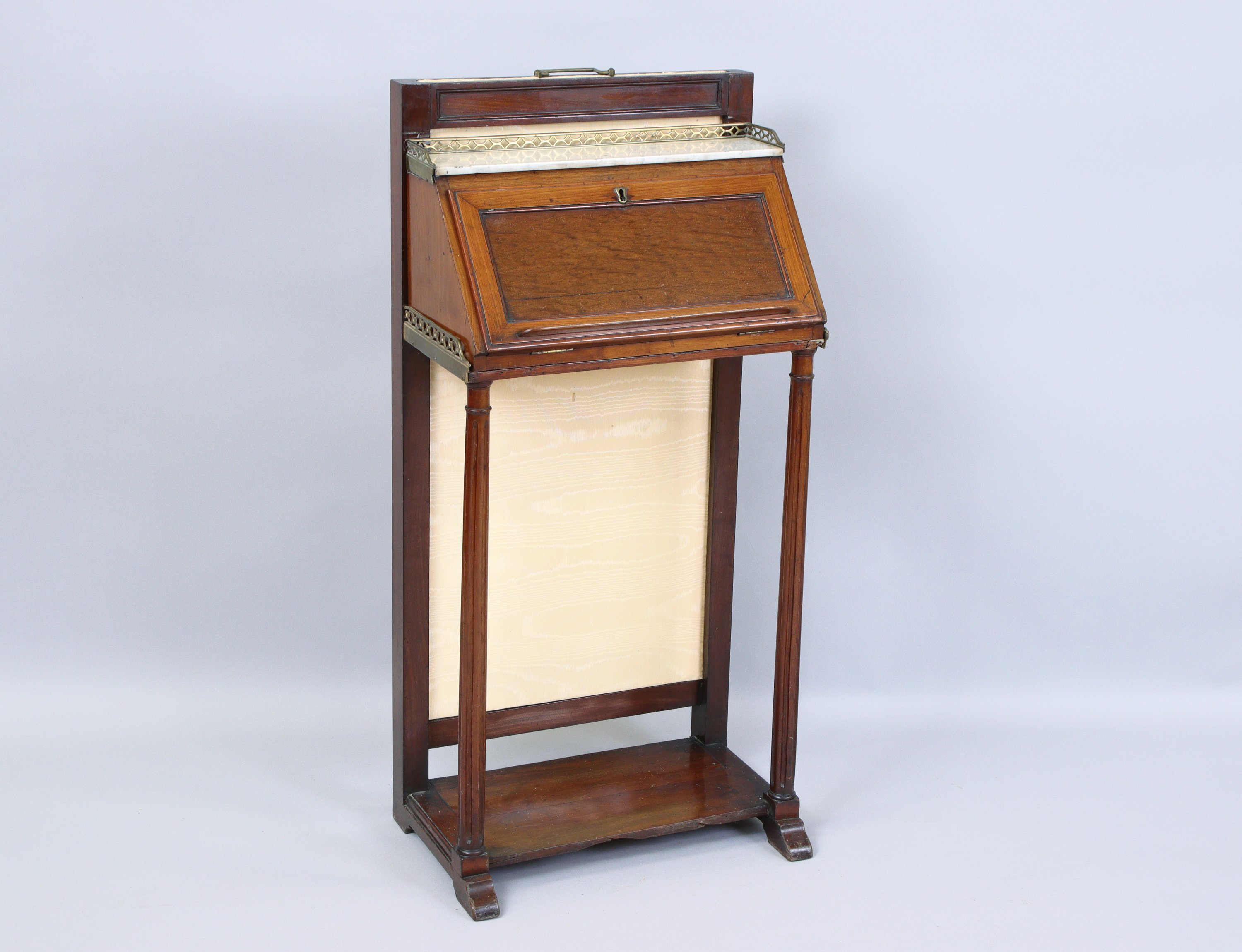 le dessus orné d'un marbre de Carrare blanc veiné ceint d'une galerie de laiton. Le pupitre foncé à l'intérieur d'un cuir noir s'ouvre et dévoile un casier à trois parties ouvrant par deux tiroirs. À l'arrière, un écran en soie moirée coulisse sur la hauteur. Les quatre pieds sont réunis par une tablette d'entretoise. Ornementation en bronze doré.