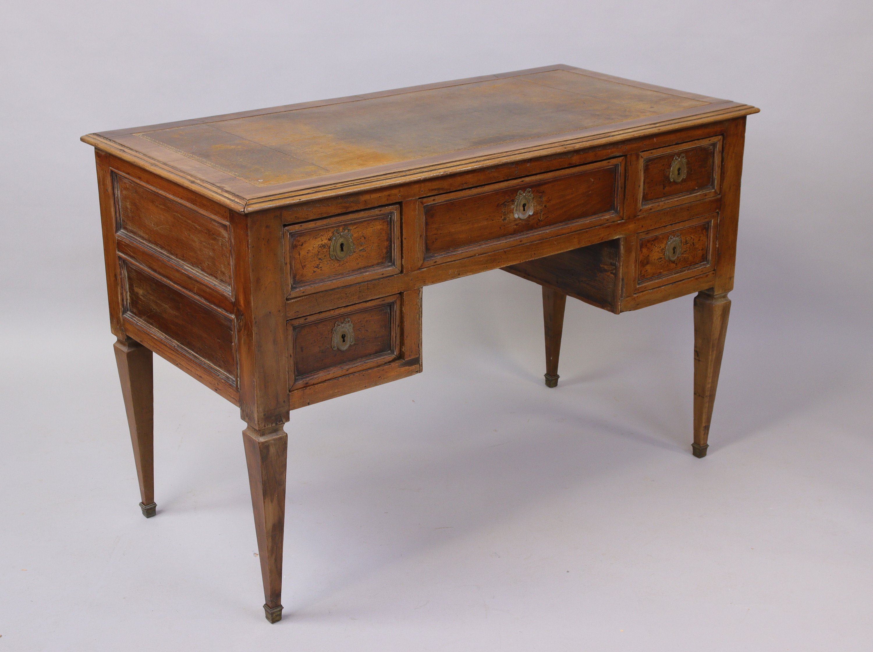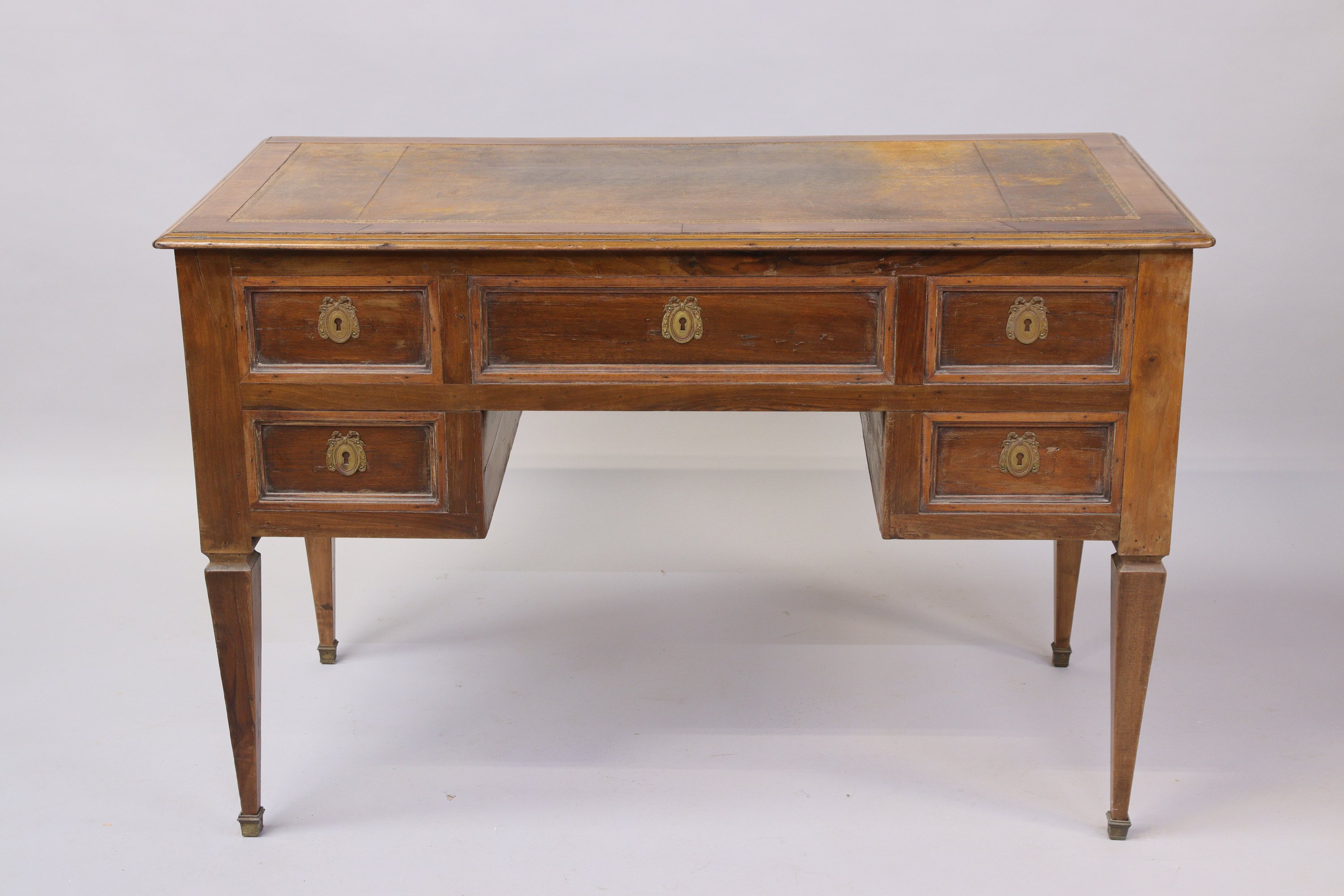 BUREAU PLAT À CAISSONS TOUTES FACES en bois fruitier. Il ouvre tiré en double caisson et avec un tiroir central. Les entrées de serrure sont en laiton ornées de nuds et de rubans. Le piétement est en gaine terminée par des sabots. Le plateau est foncé d'un maroquin.