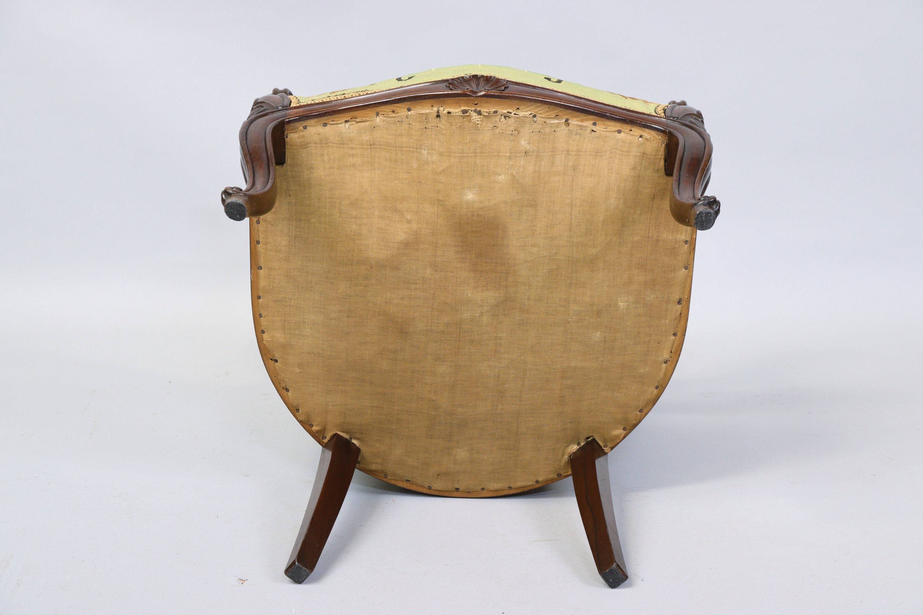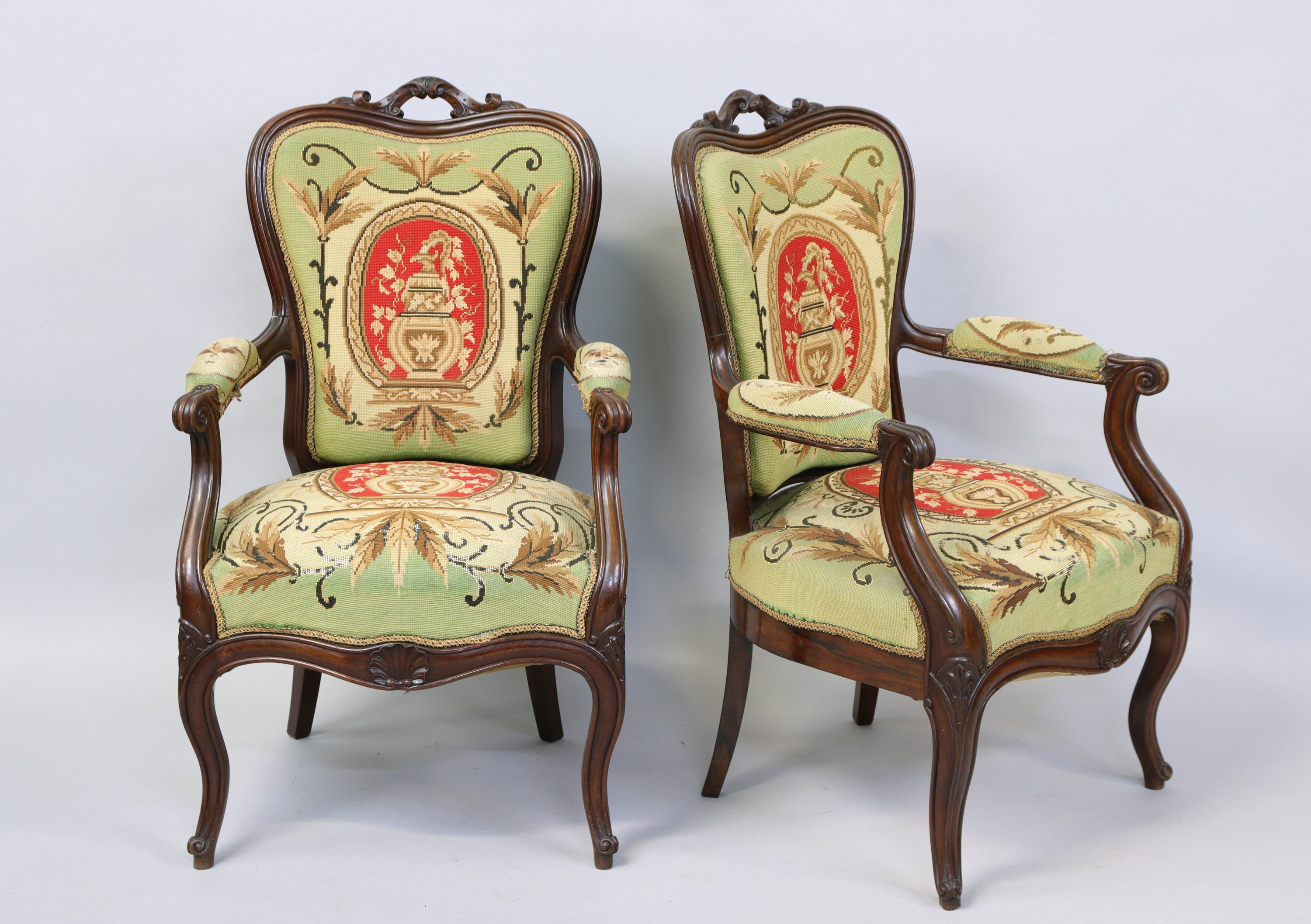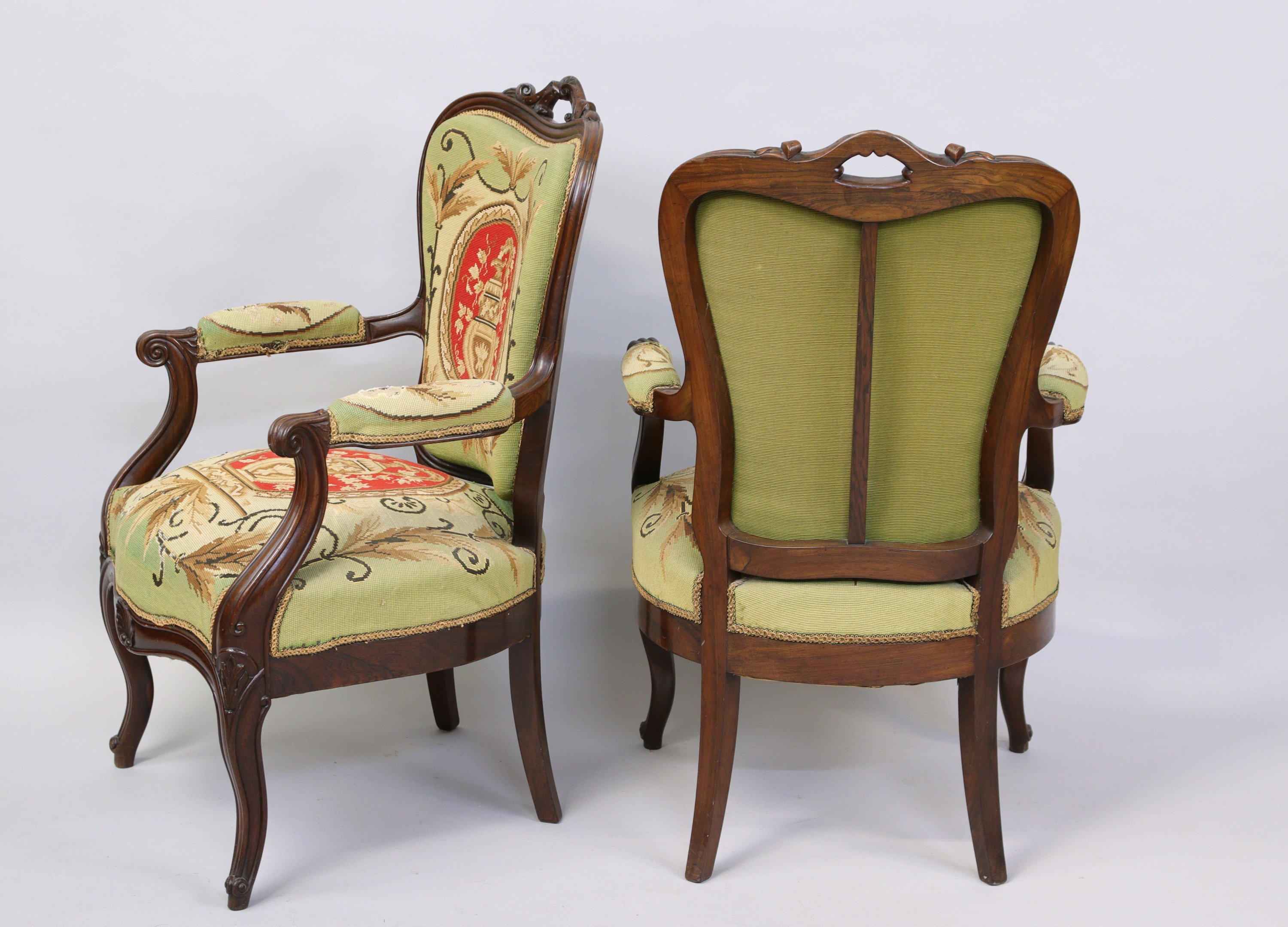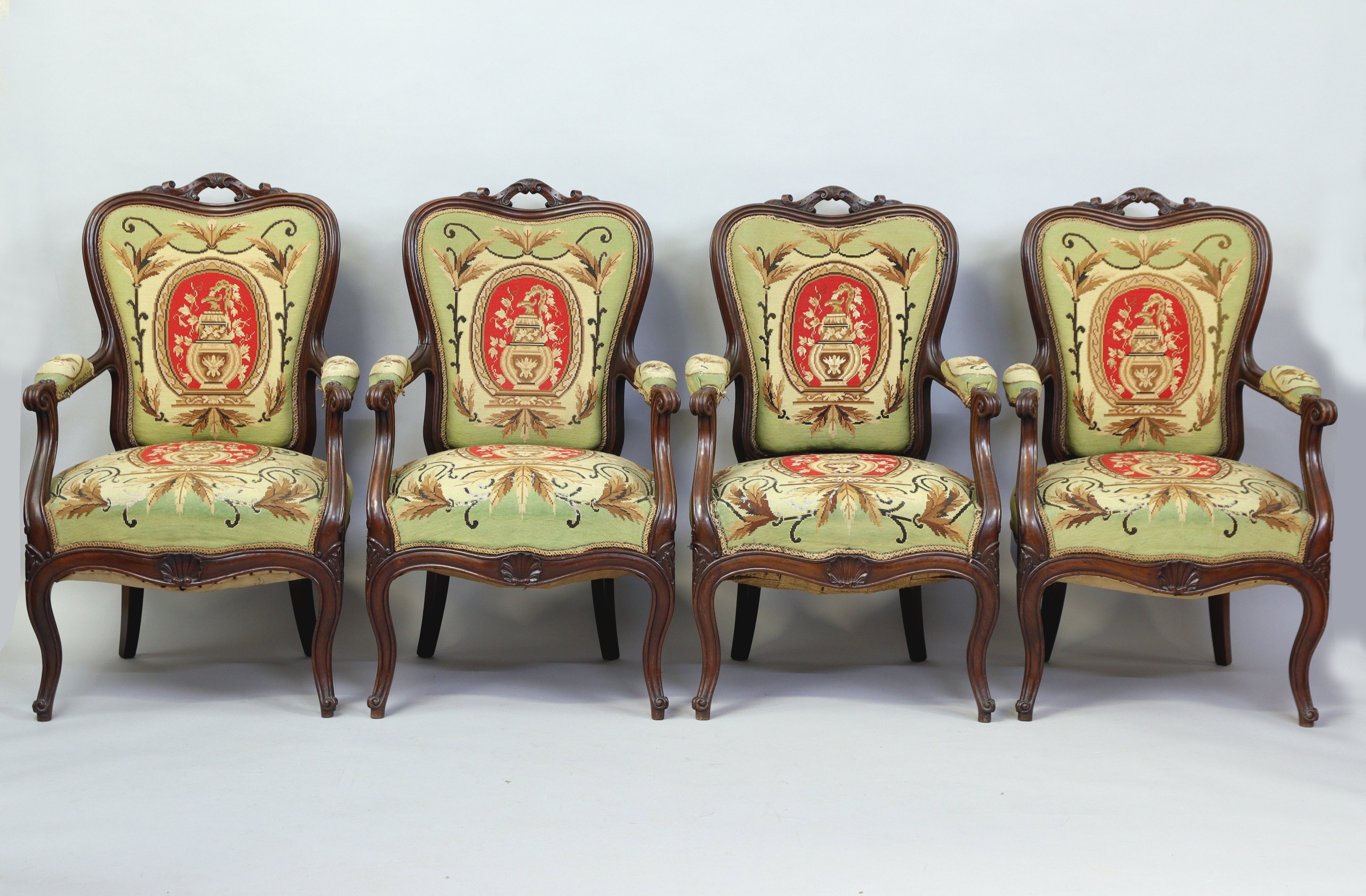 QUATRE FAUTEUILS en acajou et bois exotique avec dossiers chantournés, les accotoirs en retrait, reposant sur des pieds chantournés.