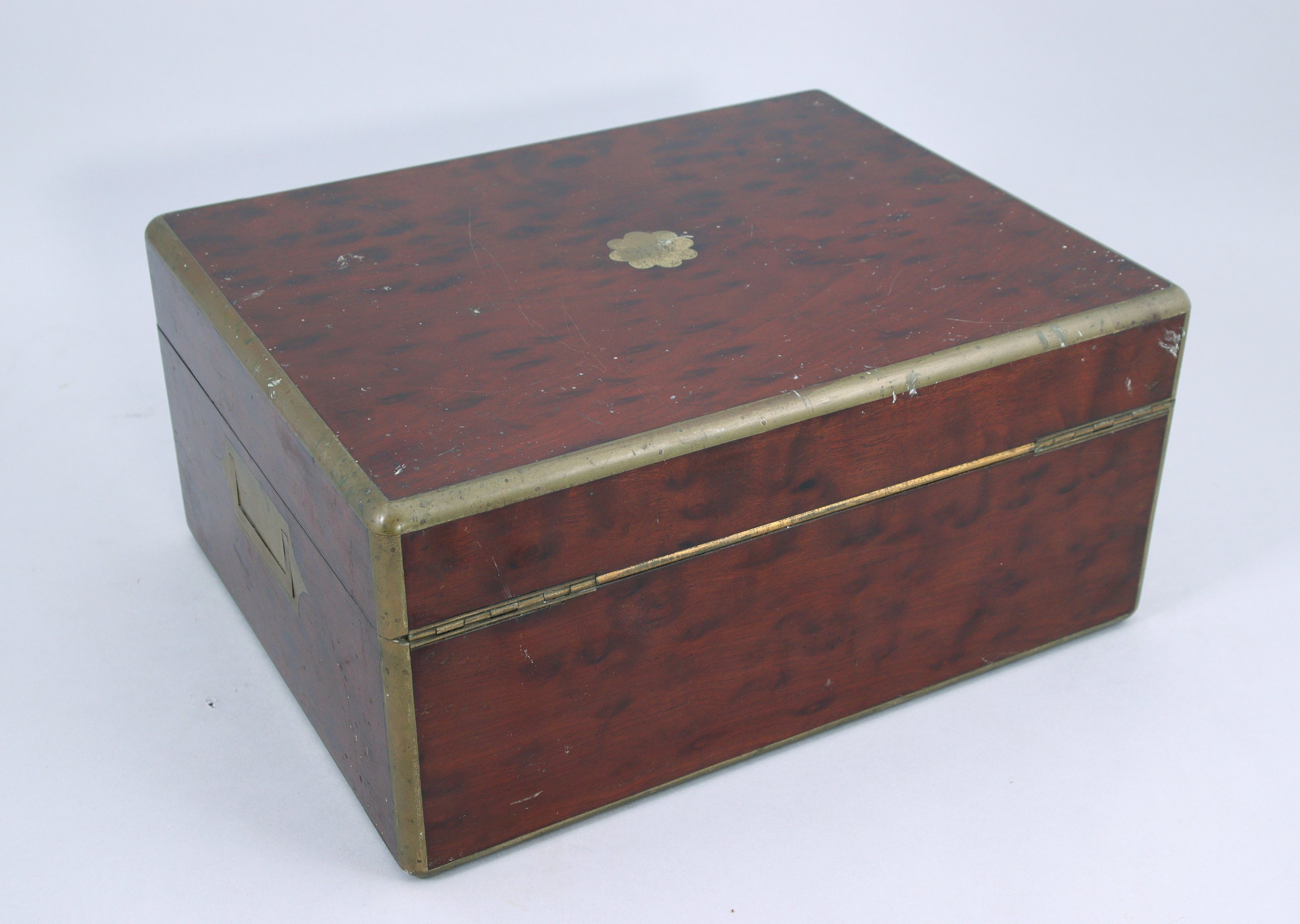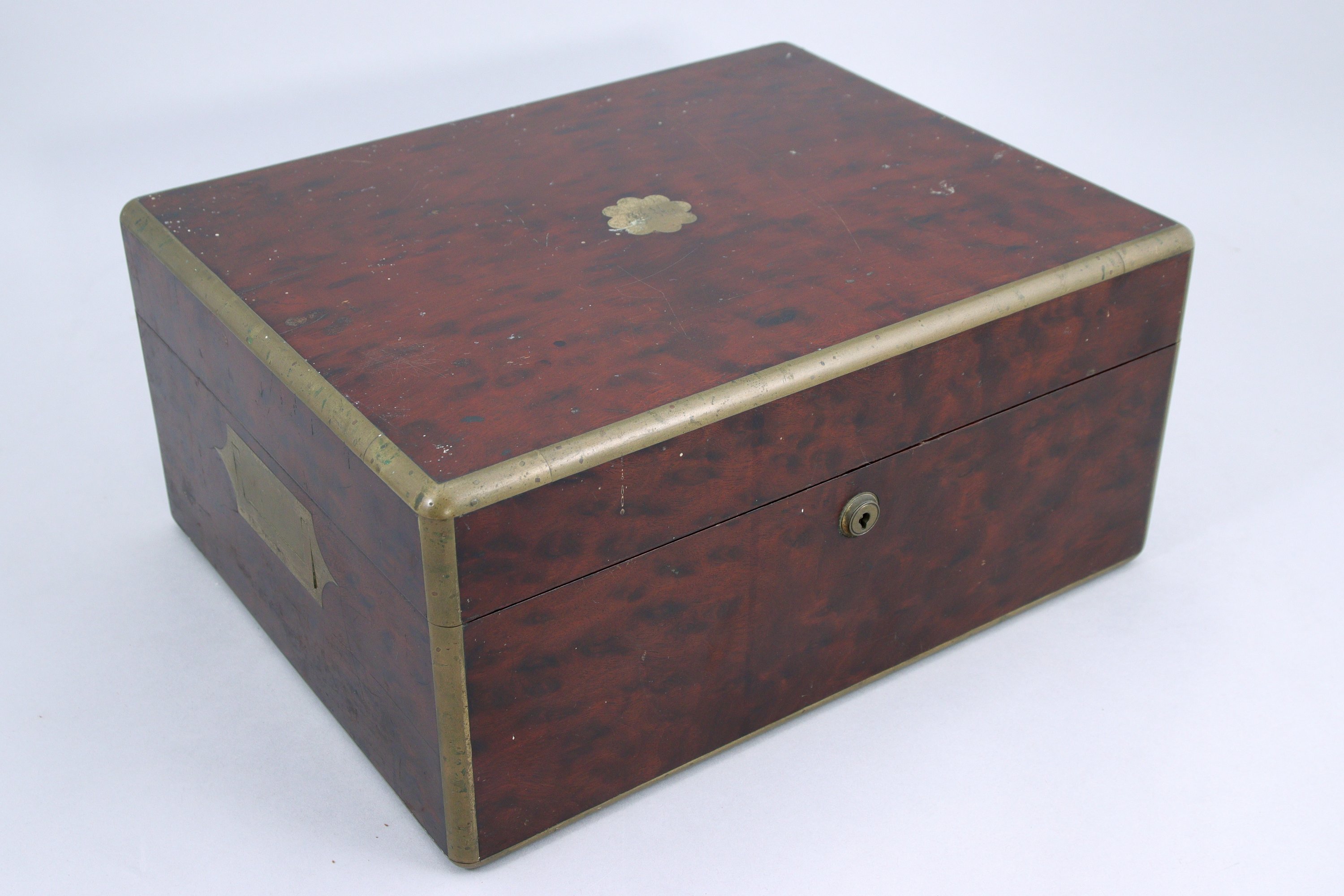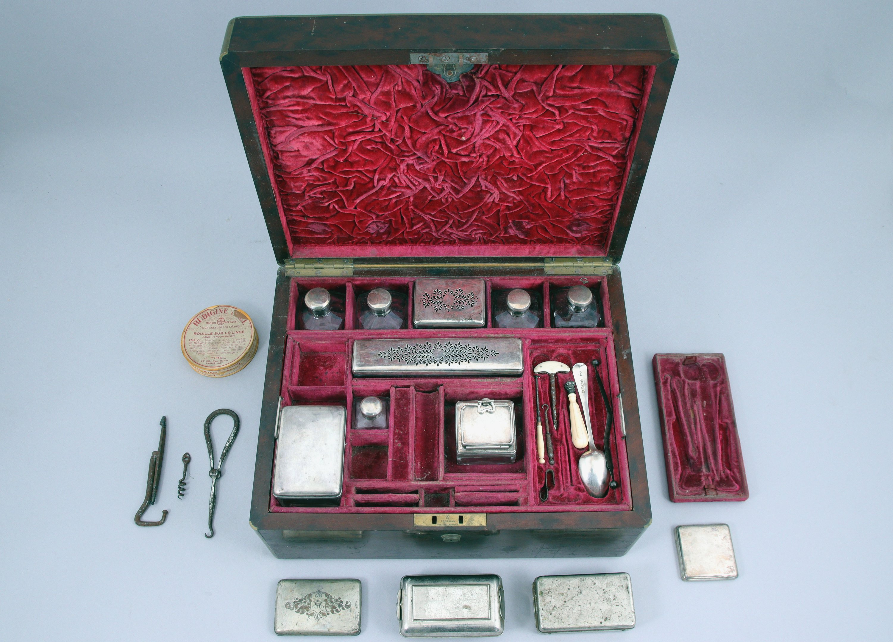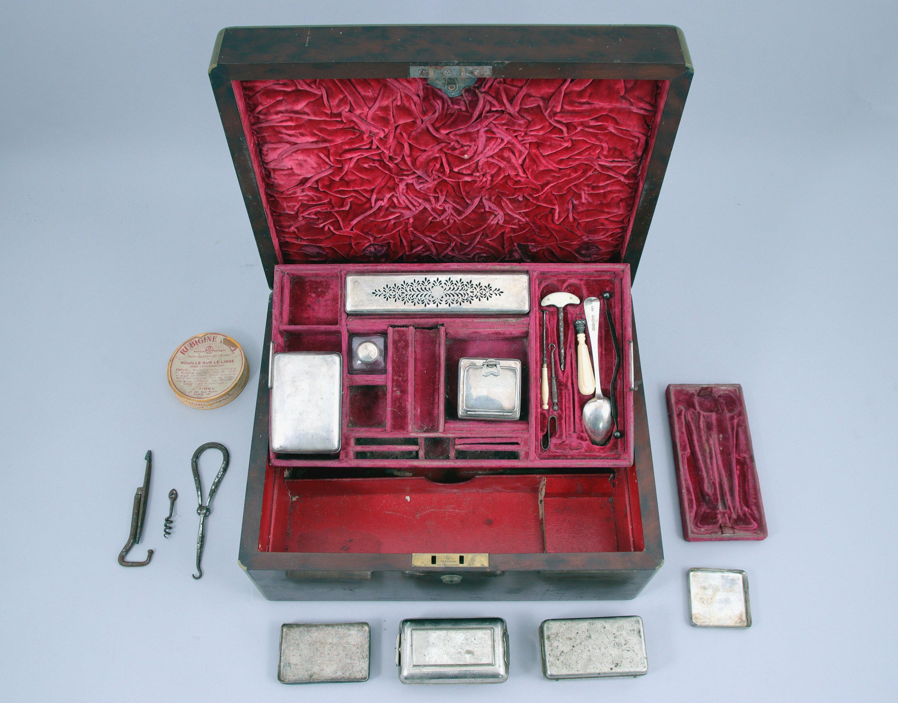 formant un nécessaire de toilette et à écrire. Intérieur violet présentant sur deux niveaux de nombreux instruments de toilette (boites, cirages, flacons, tire-lacet, cuillère en argent, sceau...). Poignets et filets en laiton.