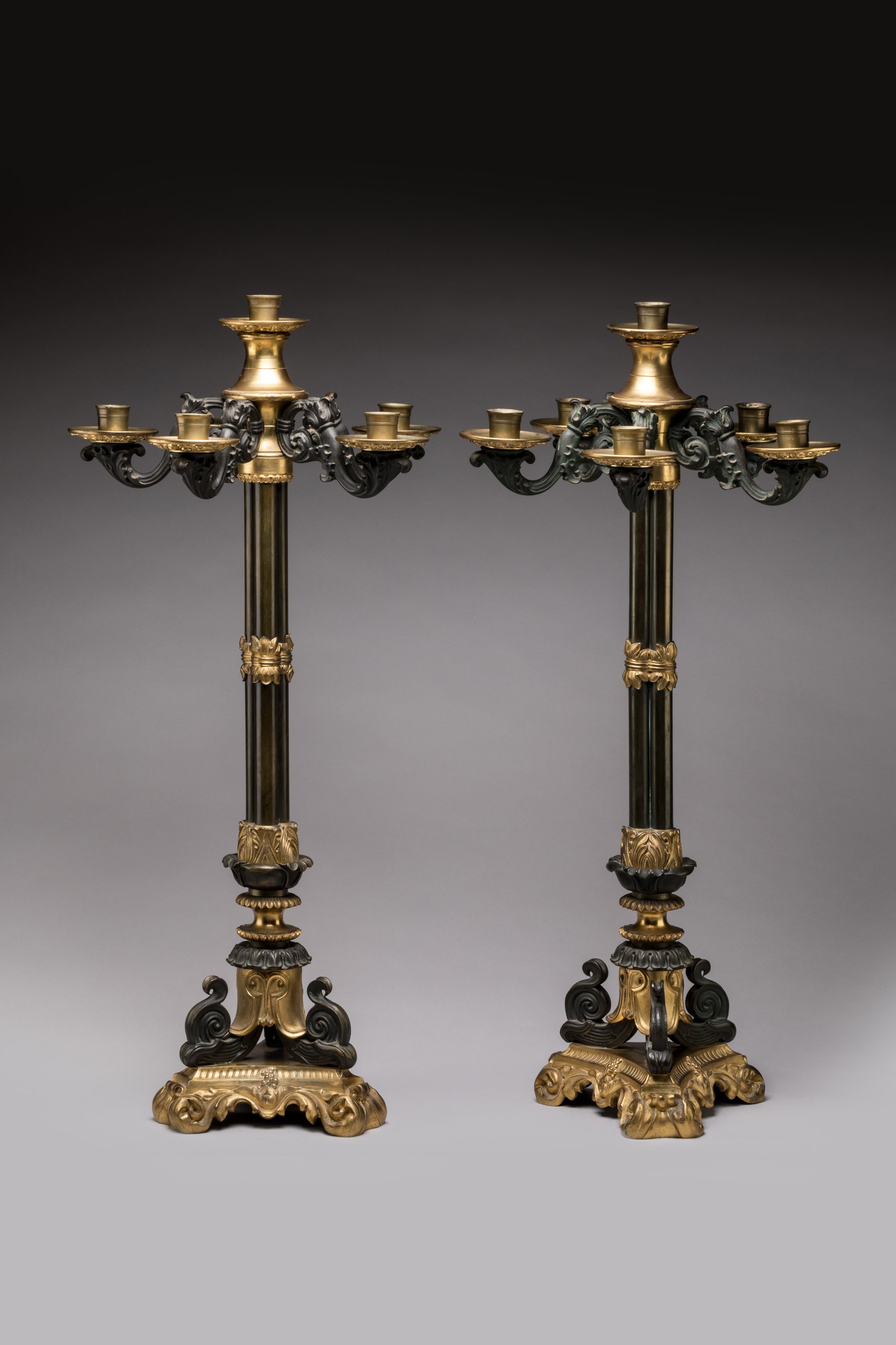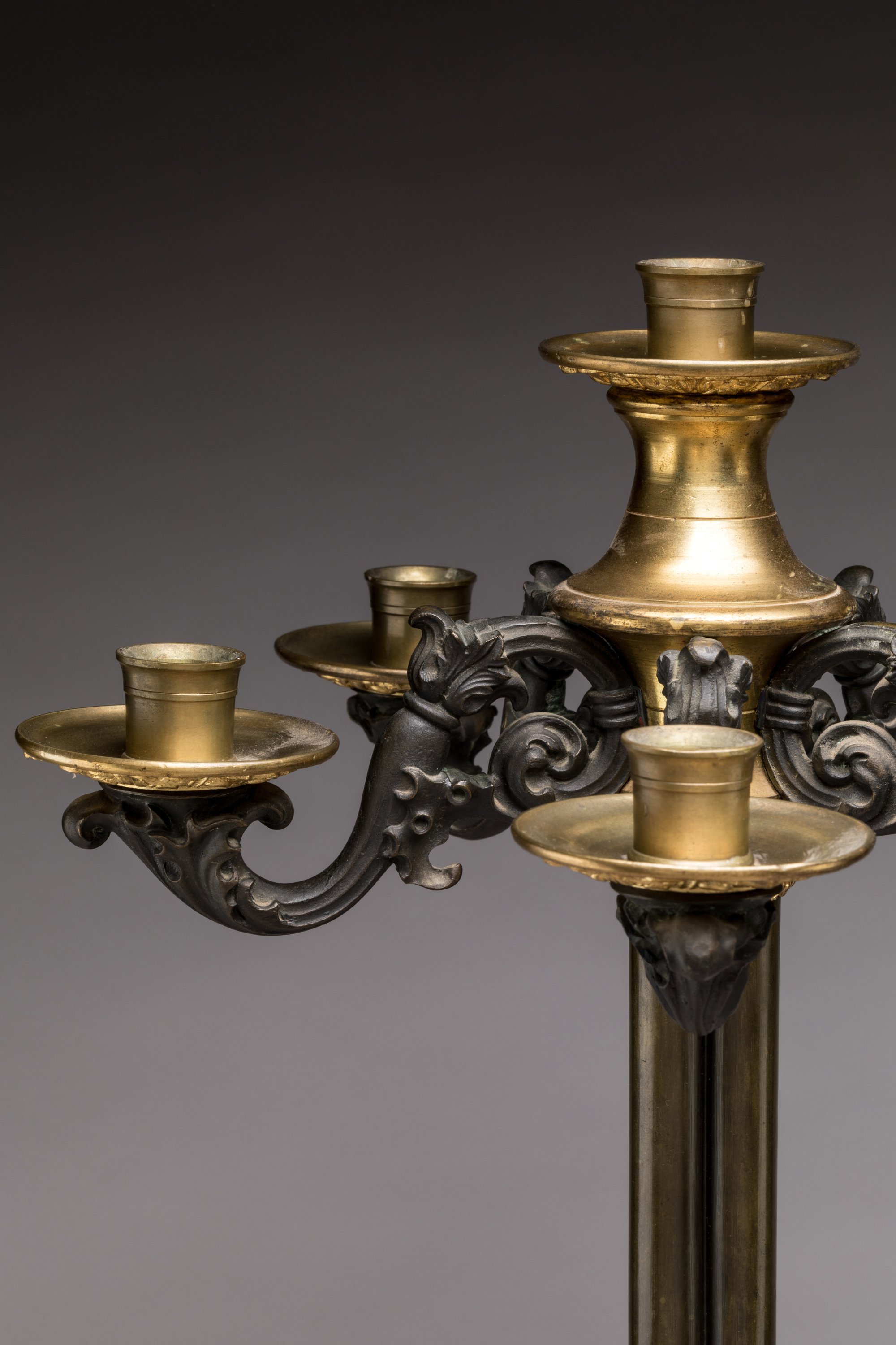 alternant bronze doré et bronze à patine canon de fusil. Les bras de lumière à enroulements feuillagés rayonnant autour d'une toupie reçoivent chacun des bobèches à décor de rinceaux. Elles reposent sur un triple fût réuni par une bague centrale. La base tripode à enroulement sur un piédestal en bronze doré mouvementé.
