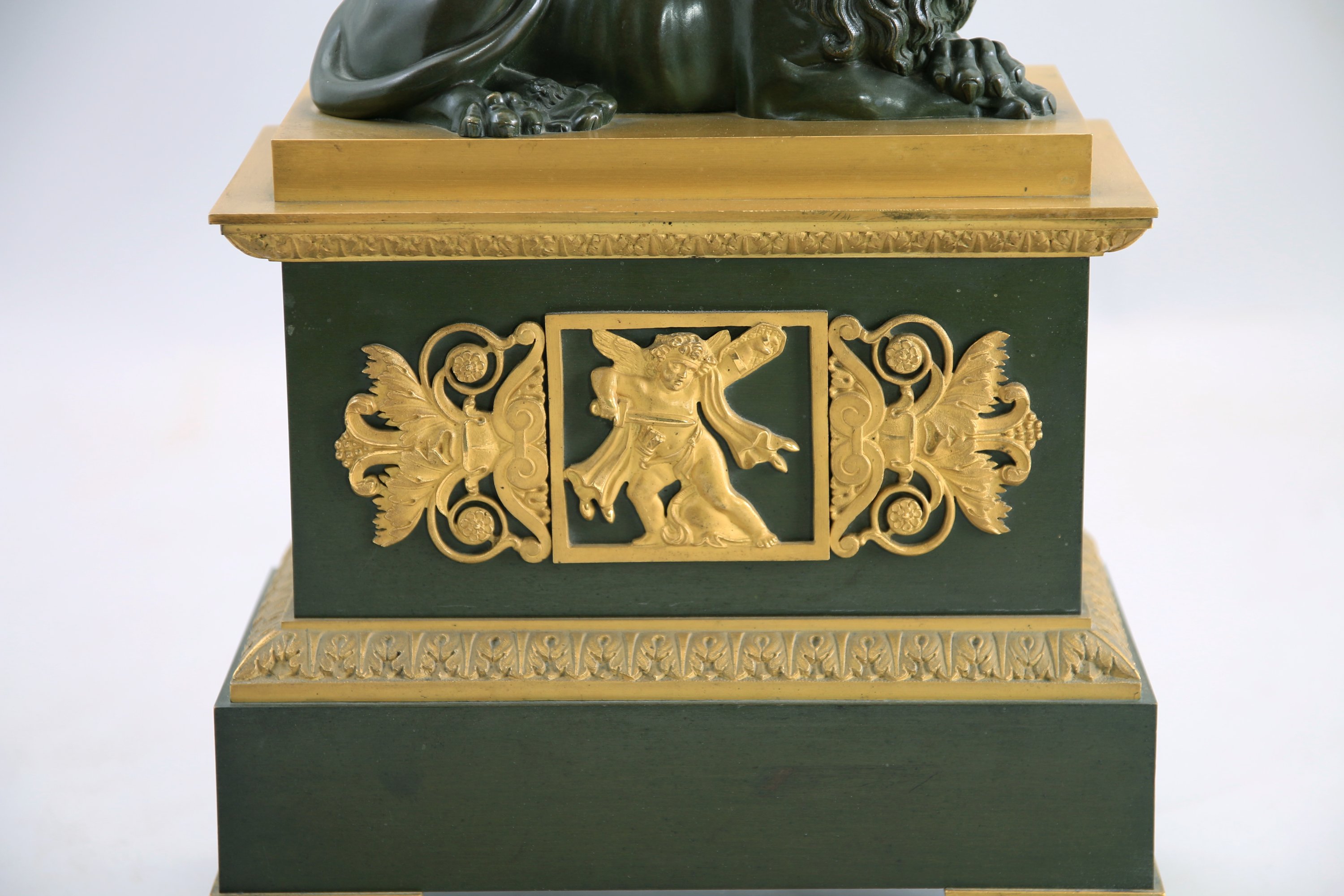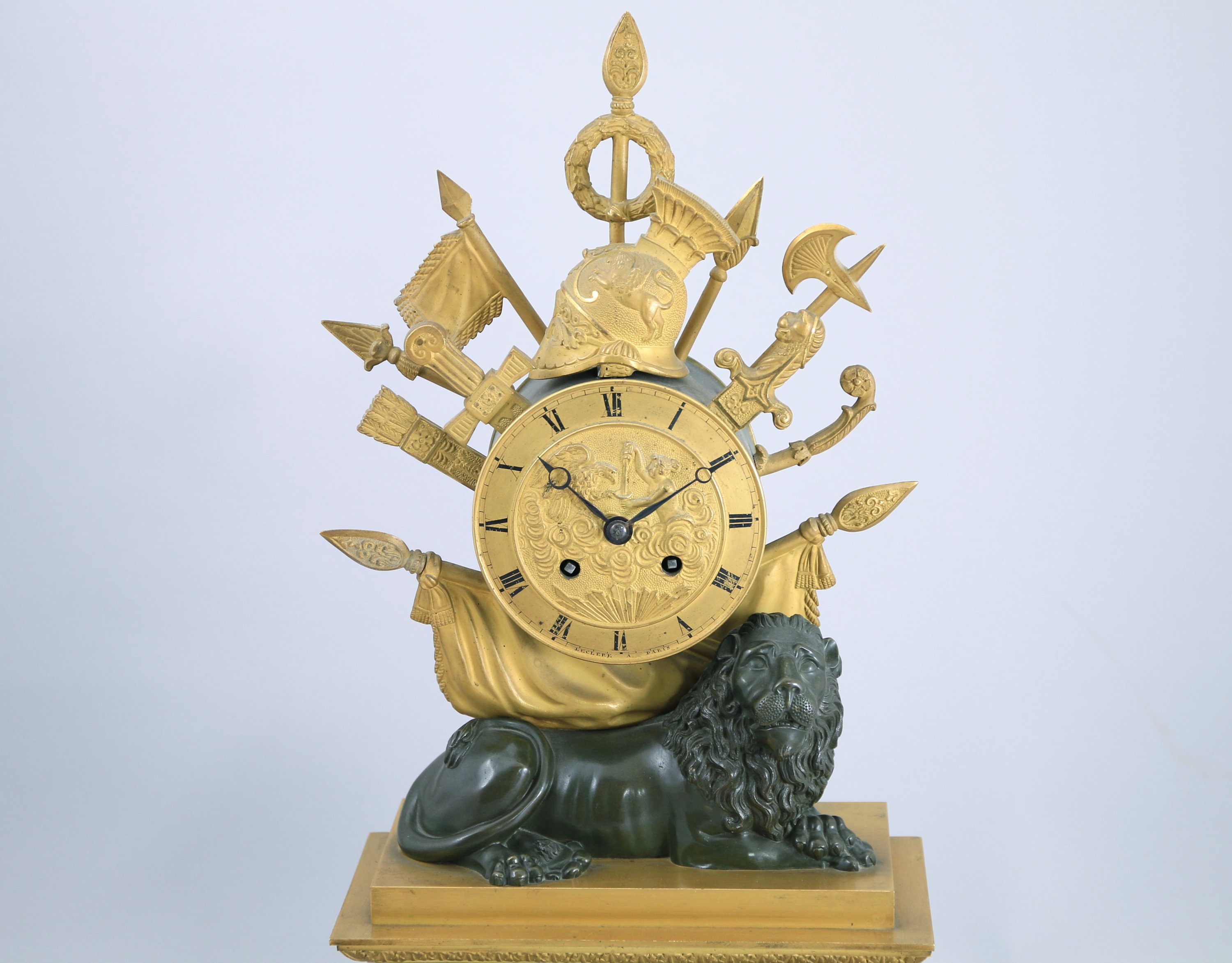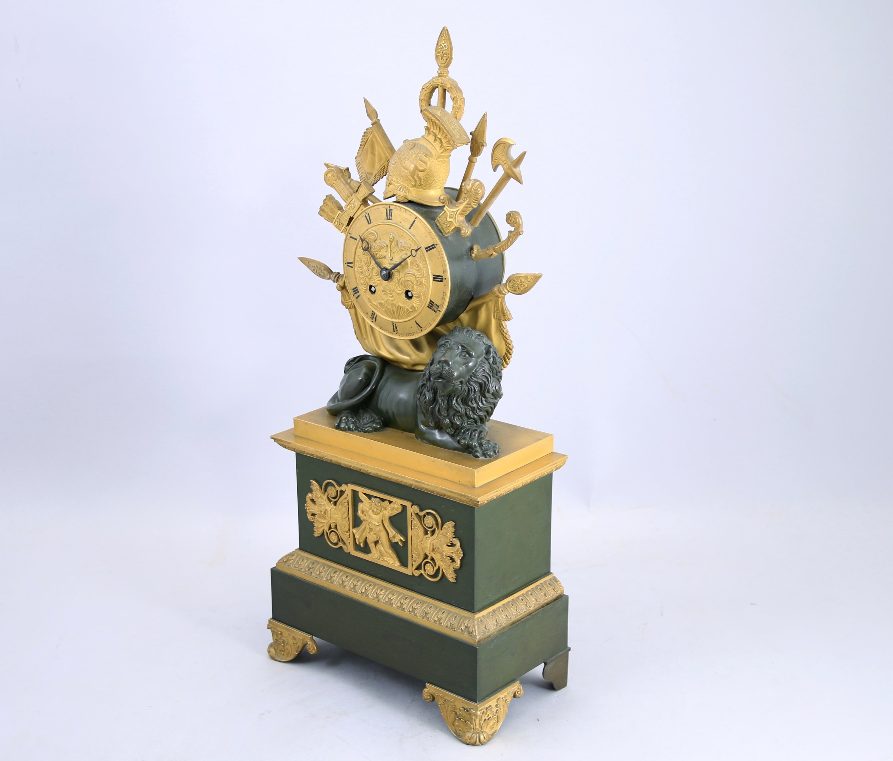 PENDULE AU LION ET TROPHÉES ANTIQUES en bronze doré et bronze à patine verte.