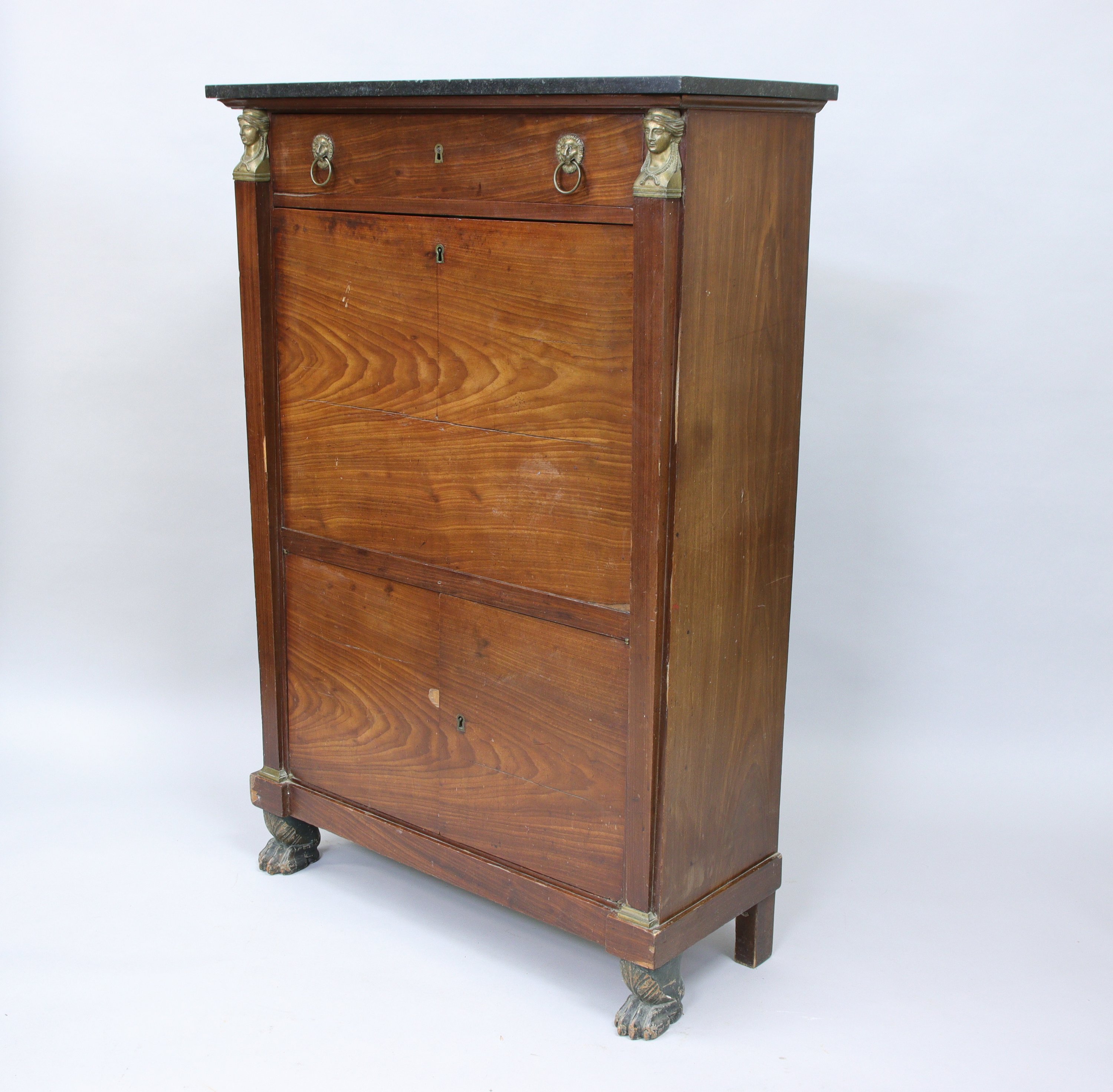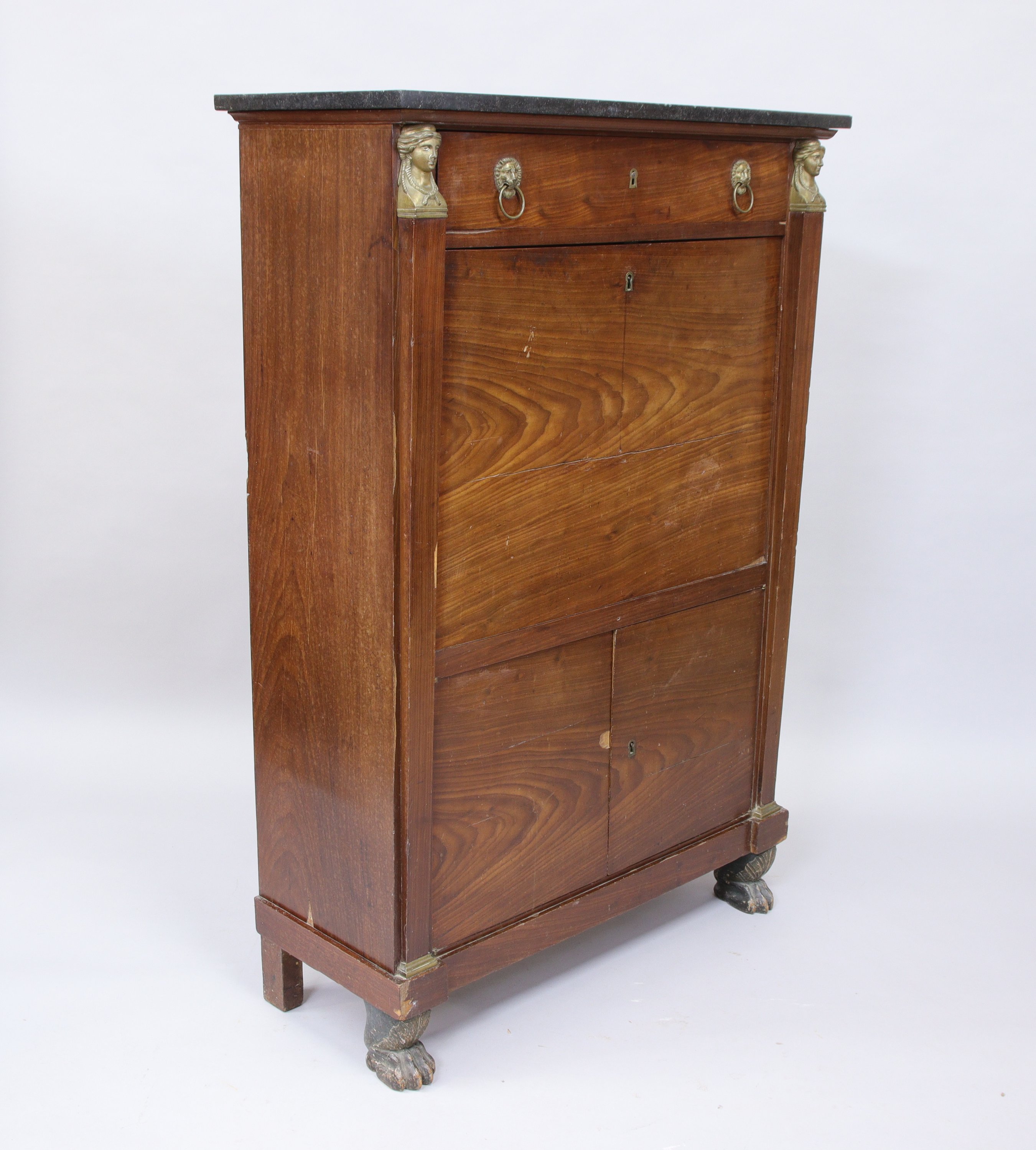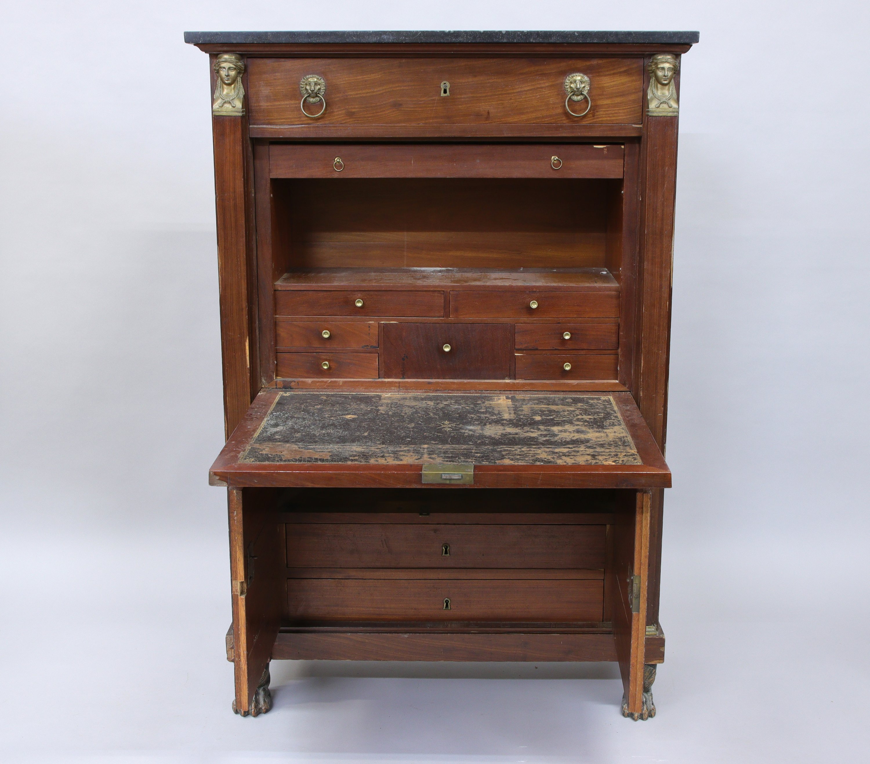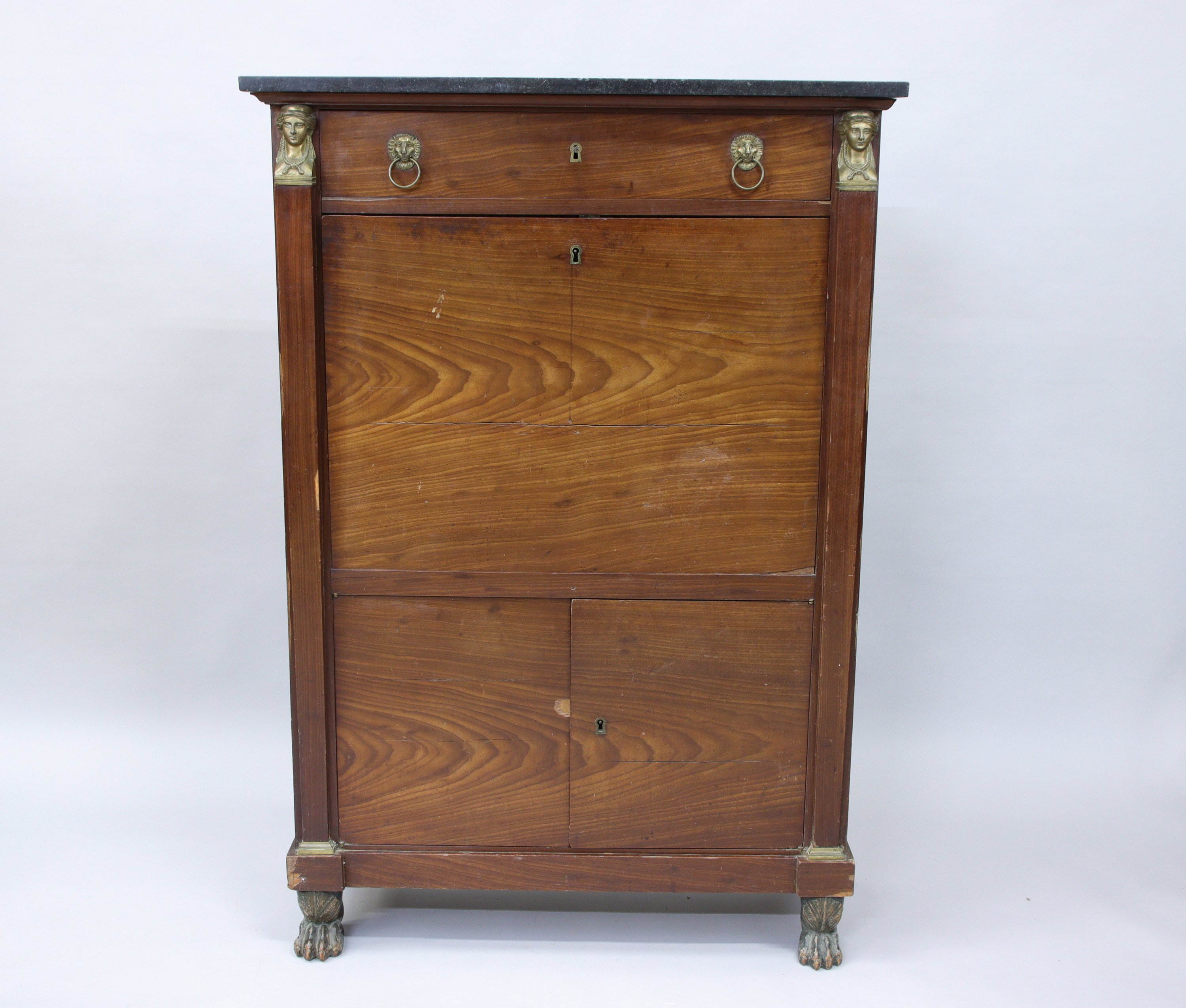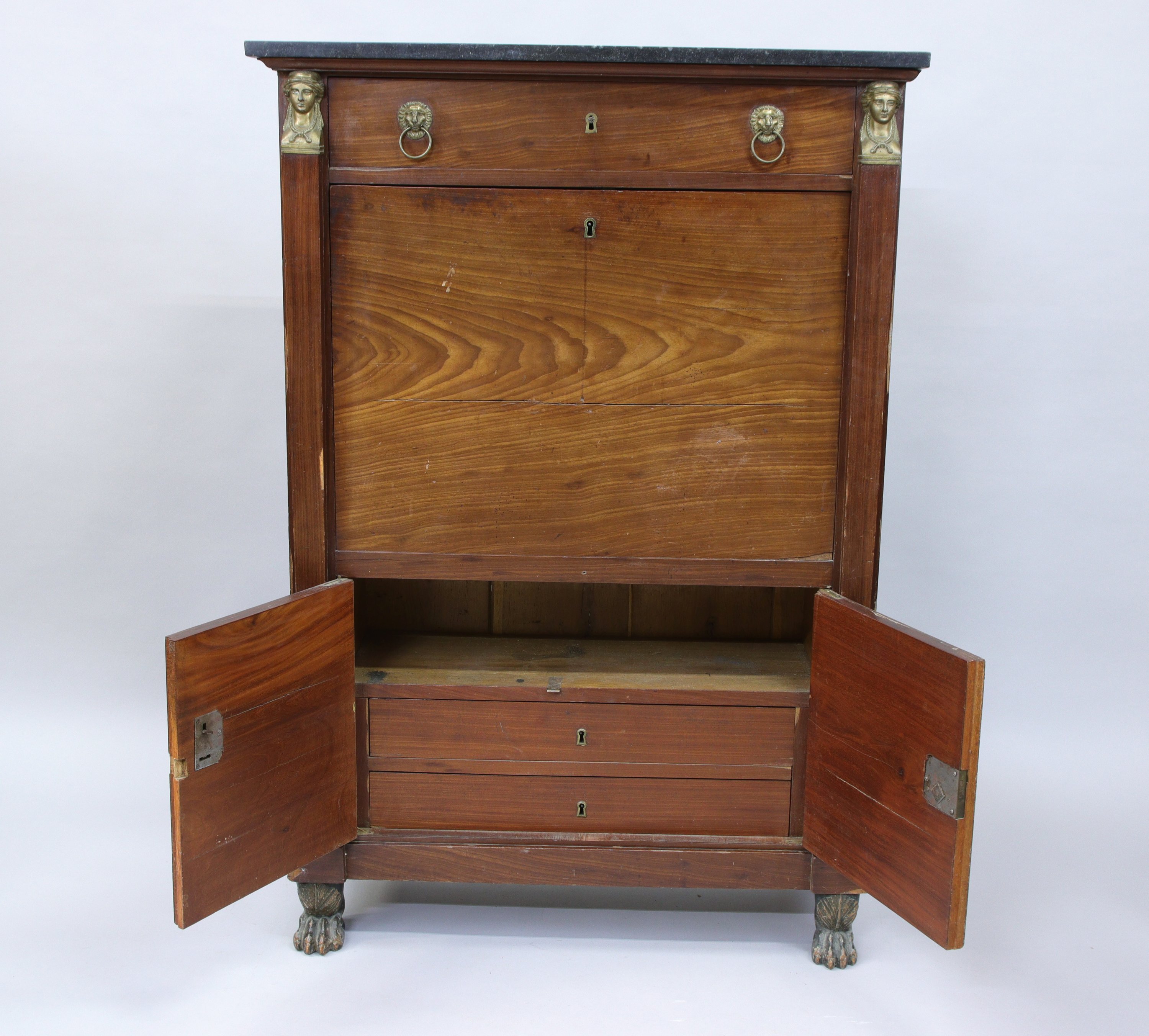 Il s'ouvre par un tiroir et un abattant découvrant huit tiroirs et caissons. En partie basse, deux vantaux découvrent trois compartiments, dont deux tiroirs. Montants droits à bustes féminins, pieds antérieurs en griffes de lion. Anneaux de tirages à mufle de lion.