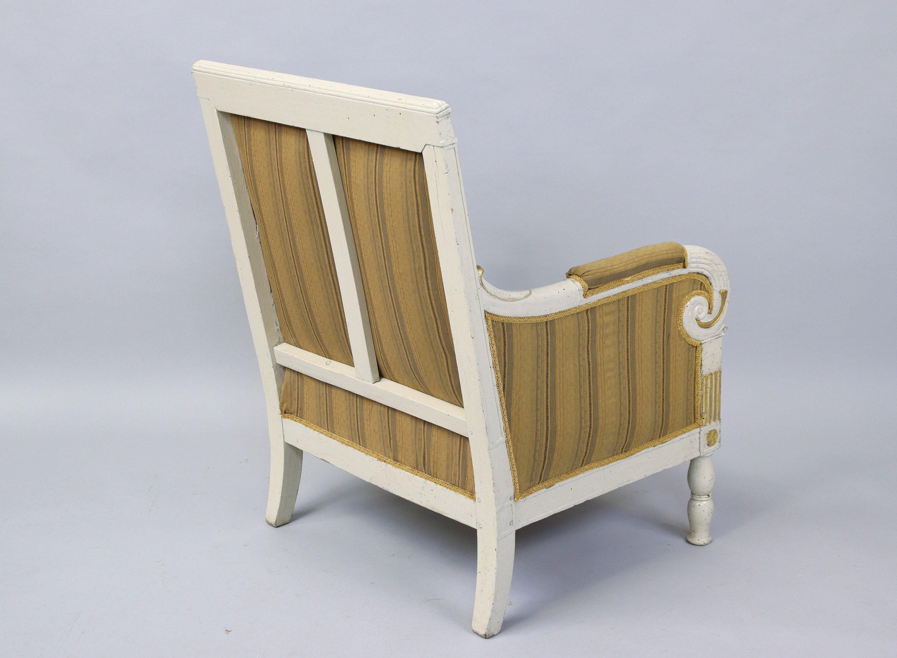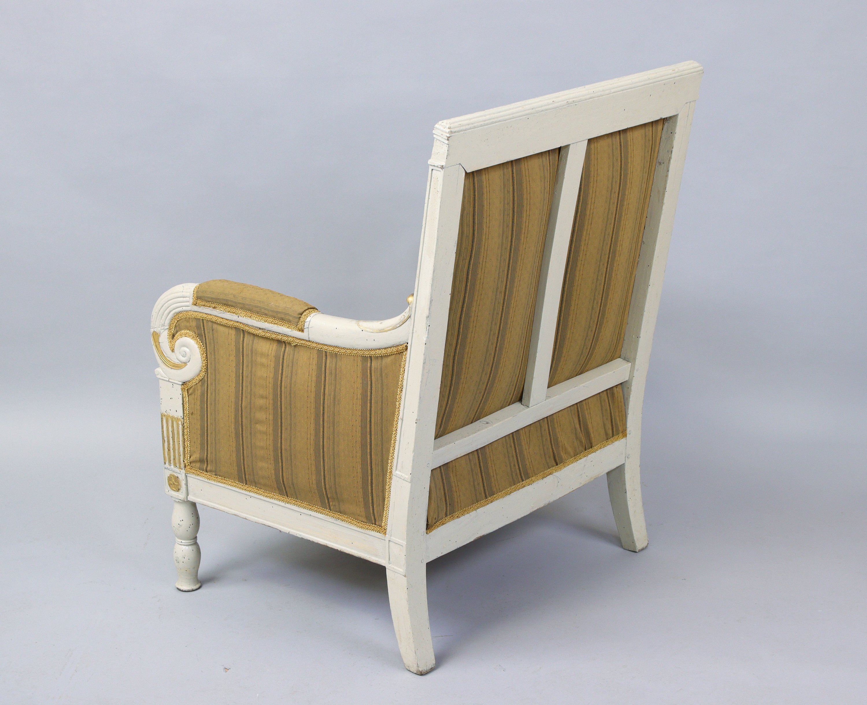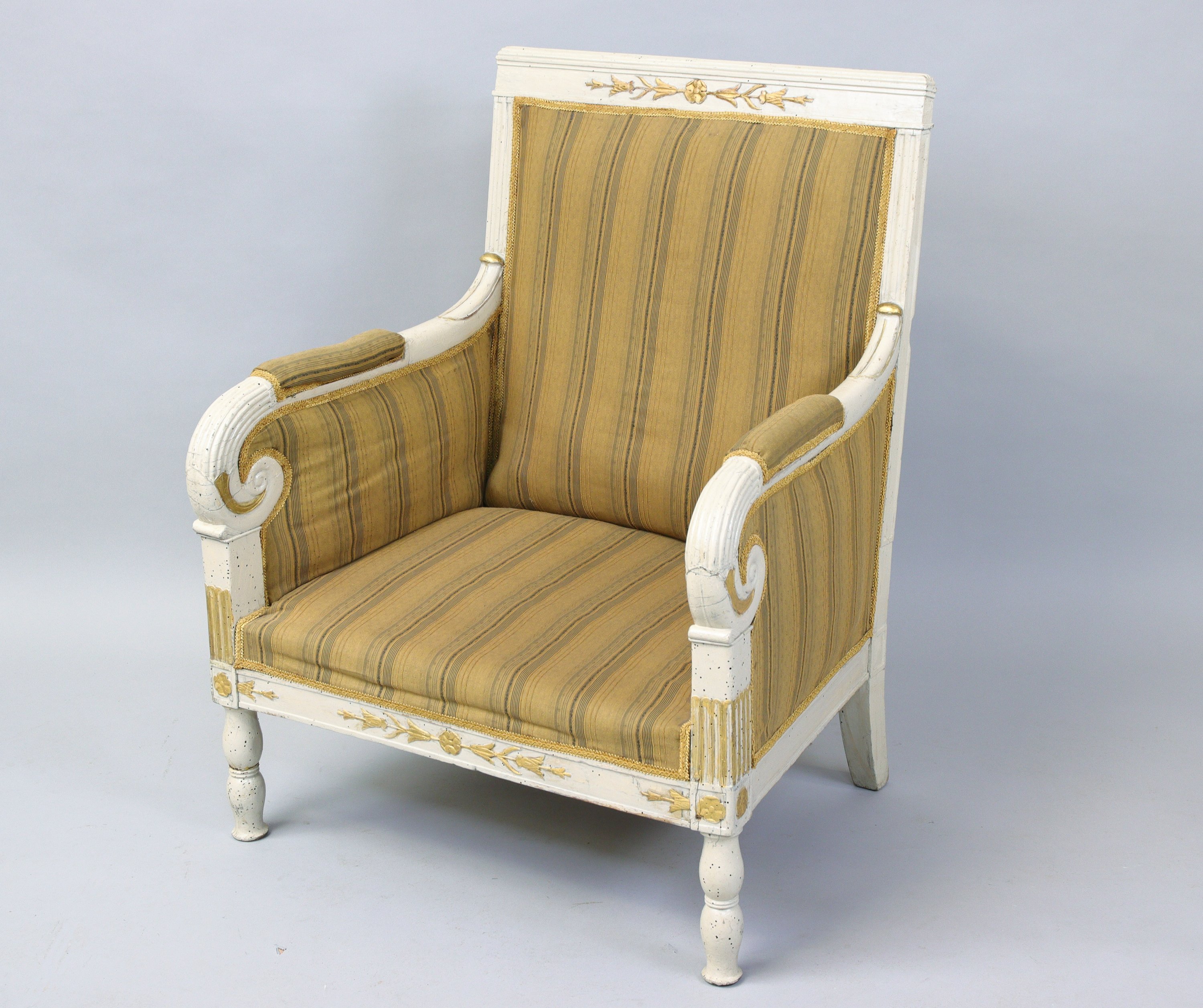 FAUTEUIL à dossier plat en bois laqué mouluré et sculpté, animé en partie haute de fleurettes, accoudoirs à enroulements et pieds arrières en sabre.