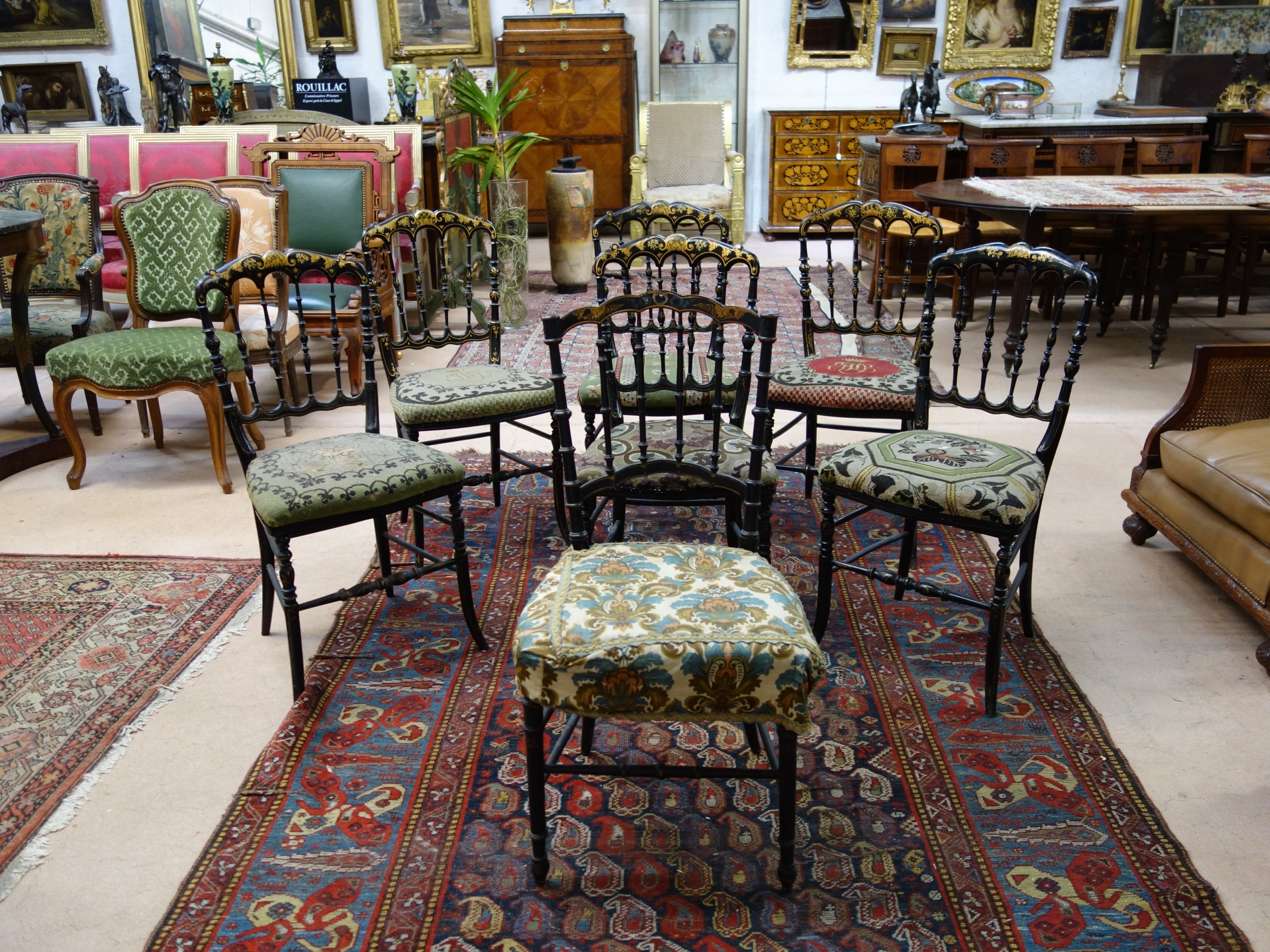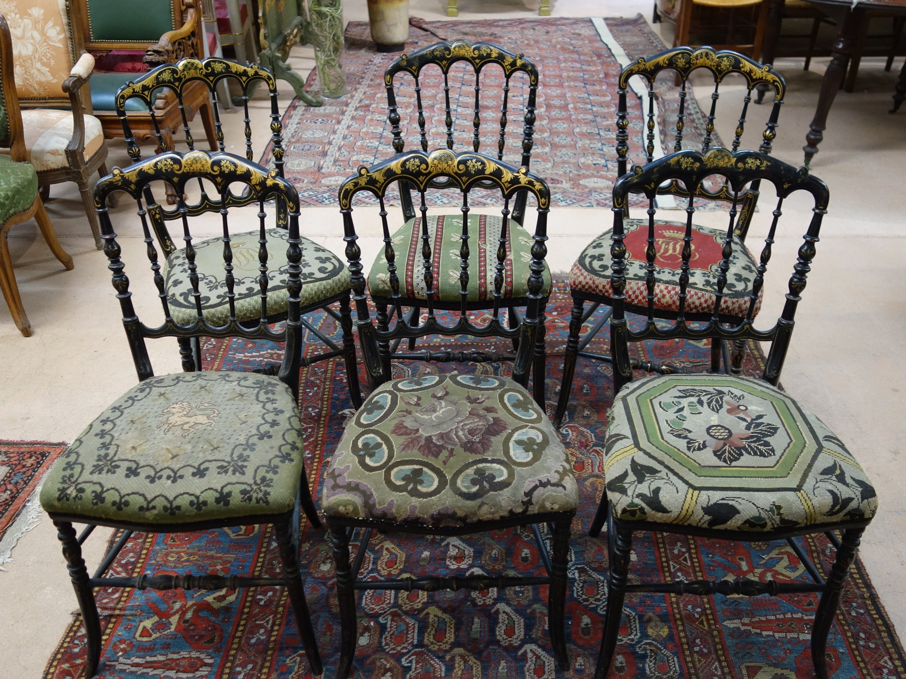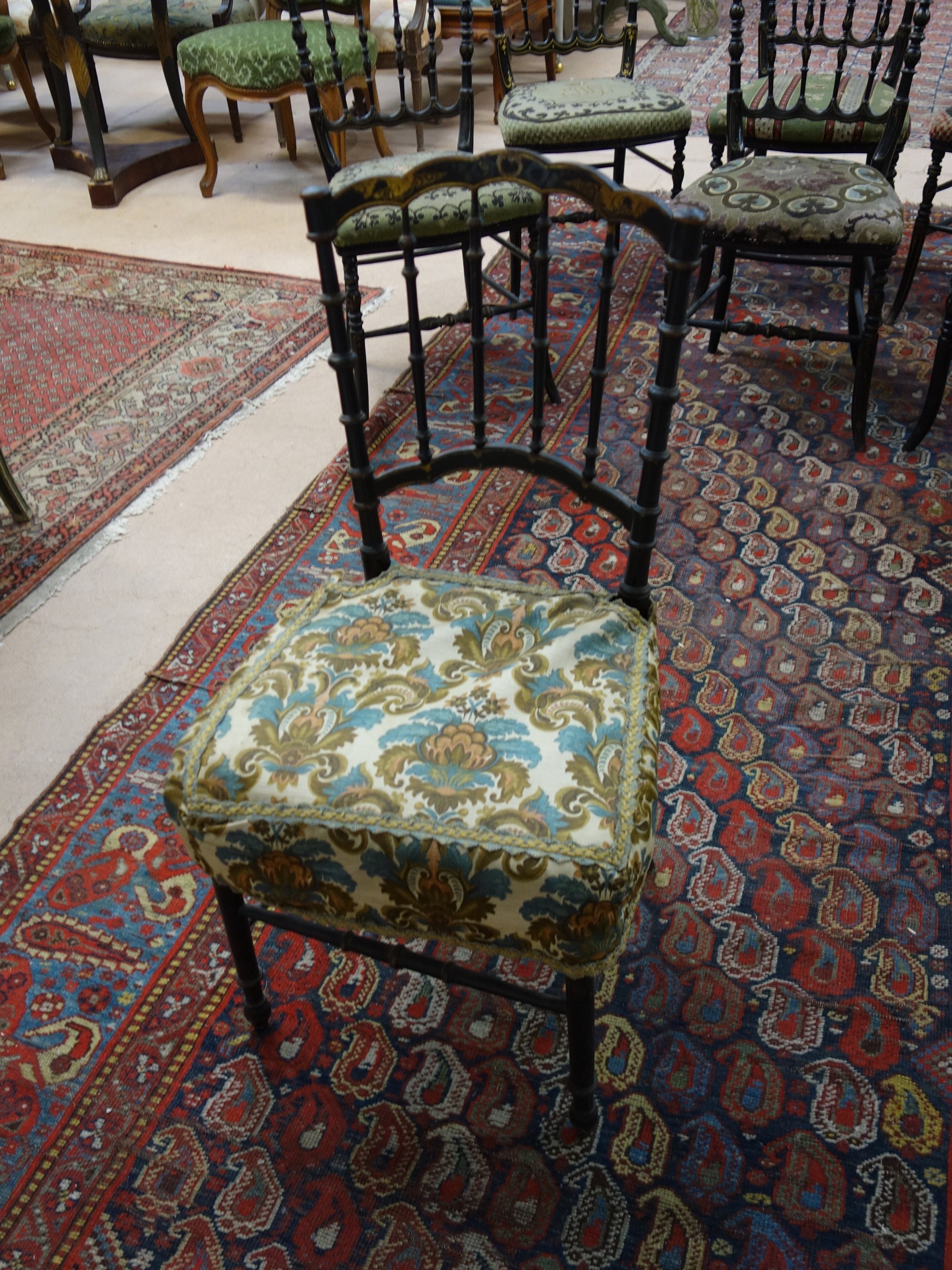 SUITE de SIX CHAISES LÉGÈRES du même modèle et une autre en bois peint noir et application dorée. Dossiers à colonnettes en fuseau.