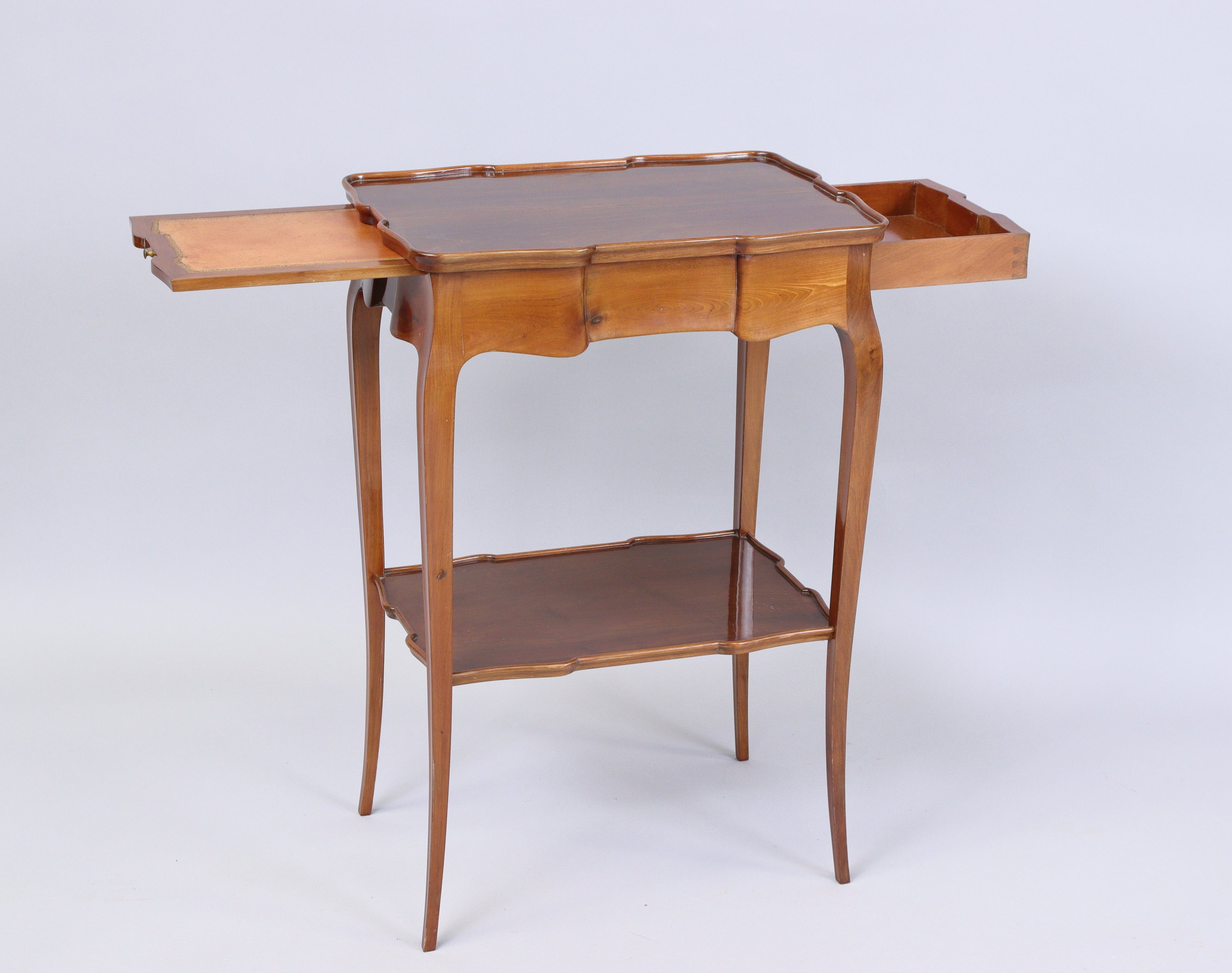 TABLE DE MILIEU en bois exotique vernis, le plateau à ressauts à bord saillant, elle ouvre sur les côtés par un tiroir et une tablette.