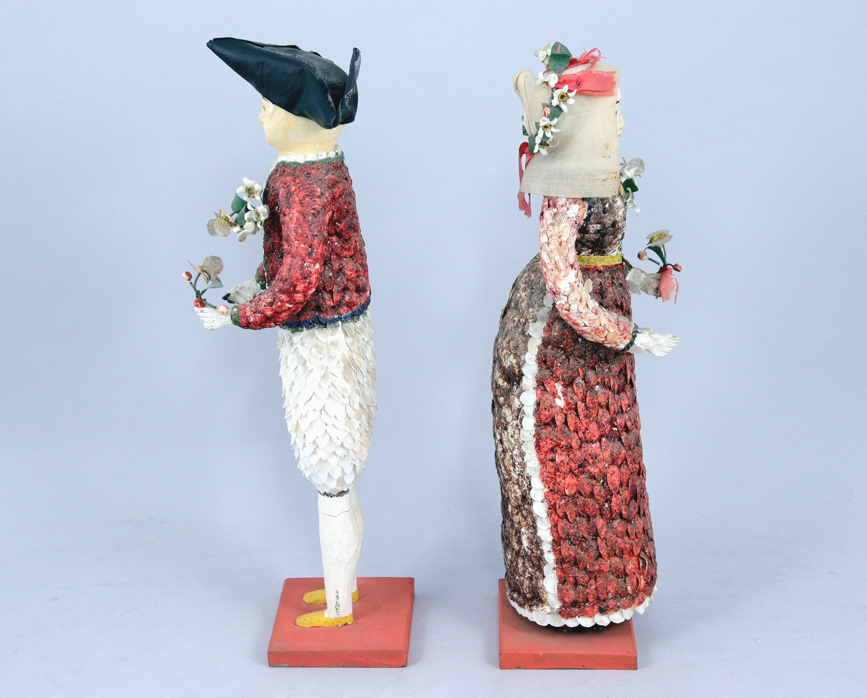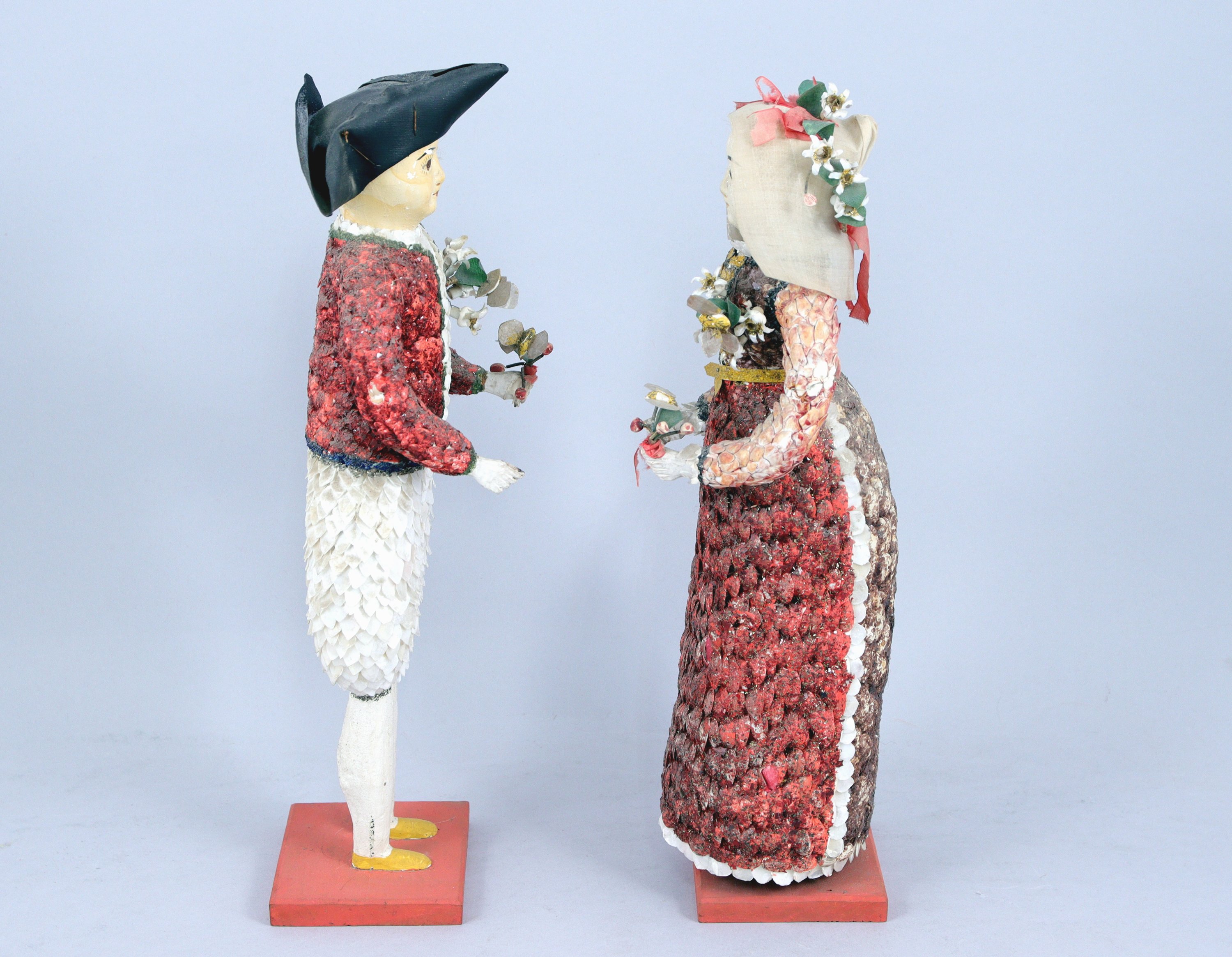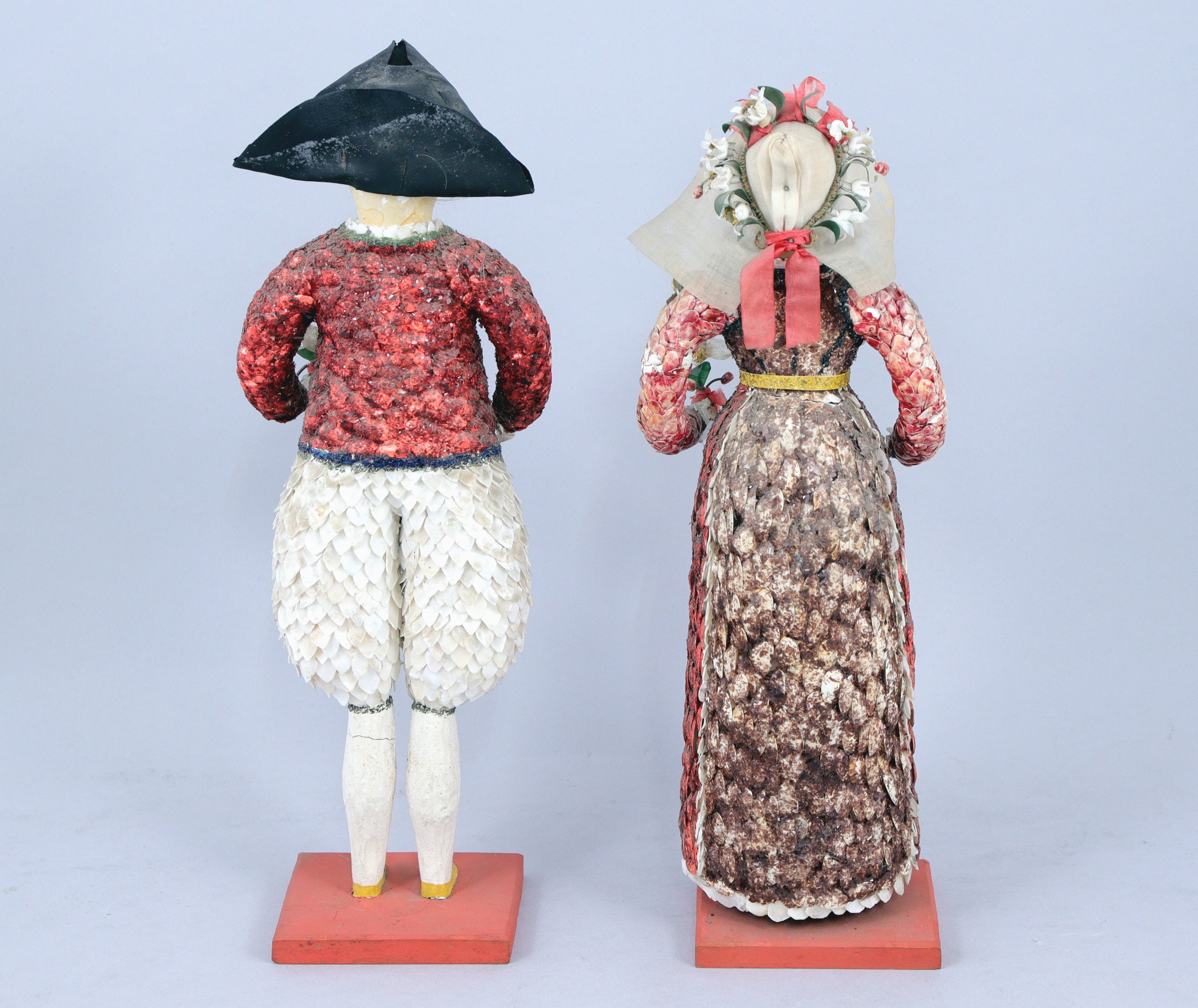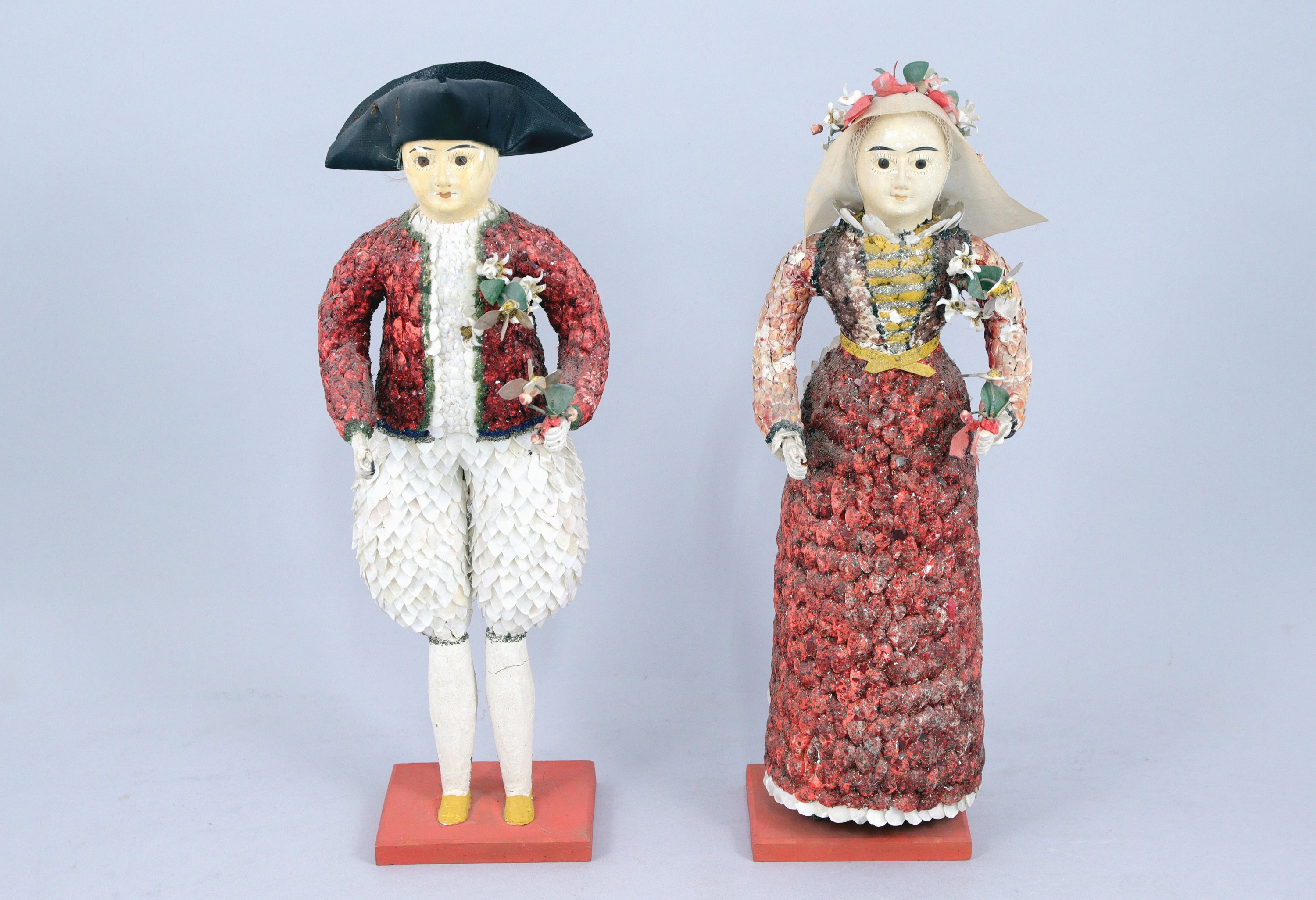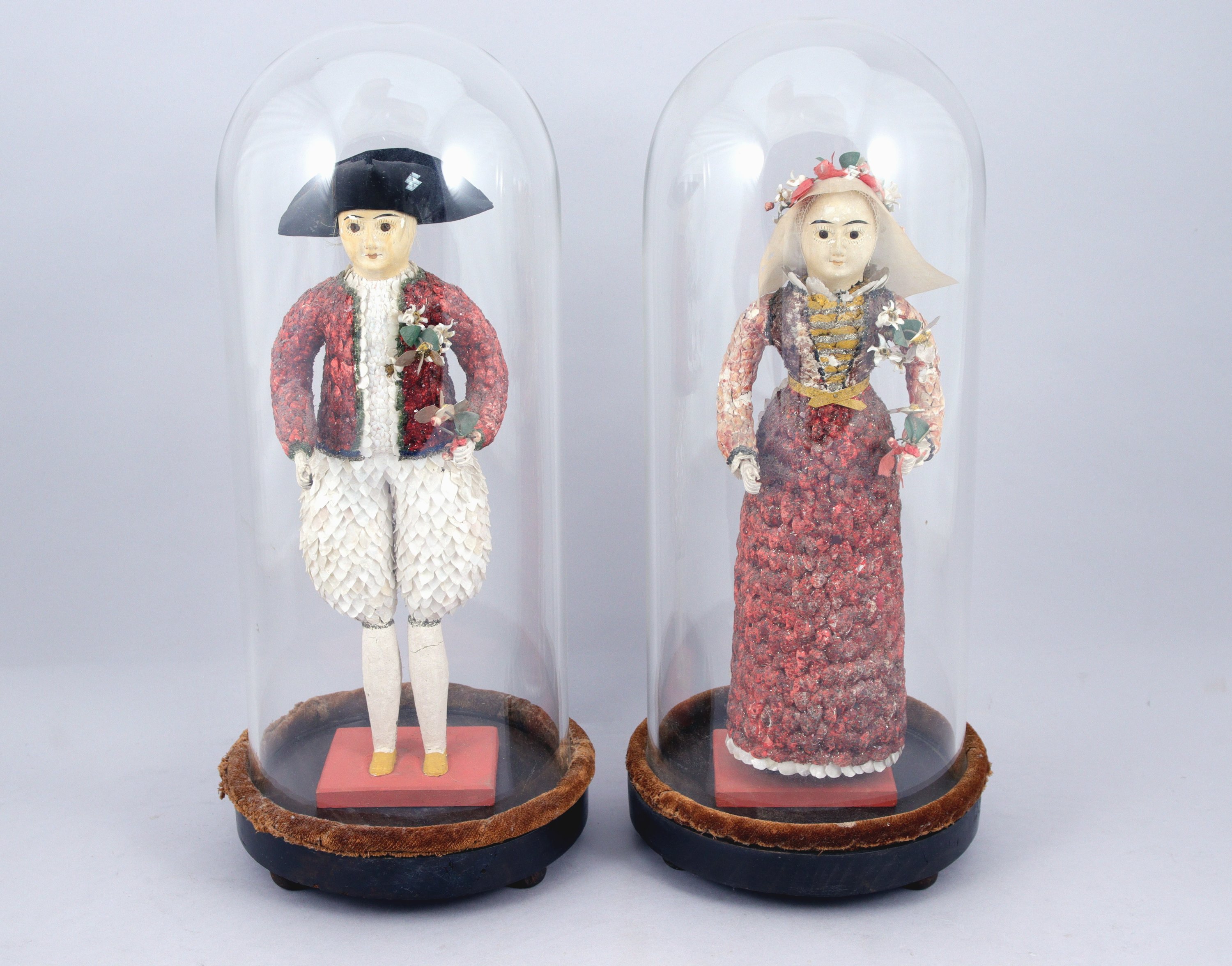 COUPLE de POUPÉES de BOURG-DE-BATZ, en âme de bois habillée de plâtre, de coquillages, d'écailles de poissons, de tissu et rehaussée de peinture. Les deux personnages en costume traditionnel breton portent des bouquets de fleurs formés par des disques de nacre montés sur ressorts. Les poupées sont conservées chacune sous un globe en verre.