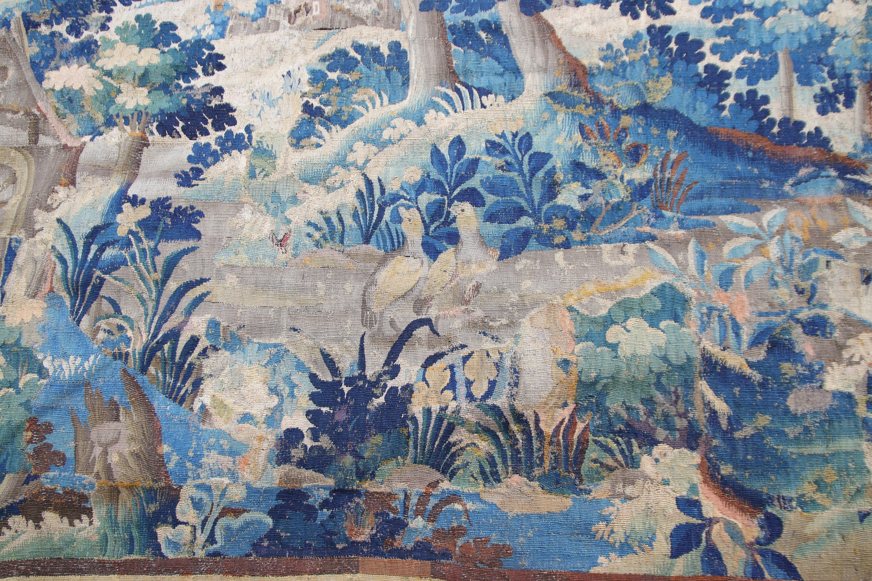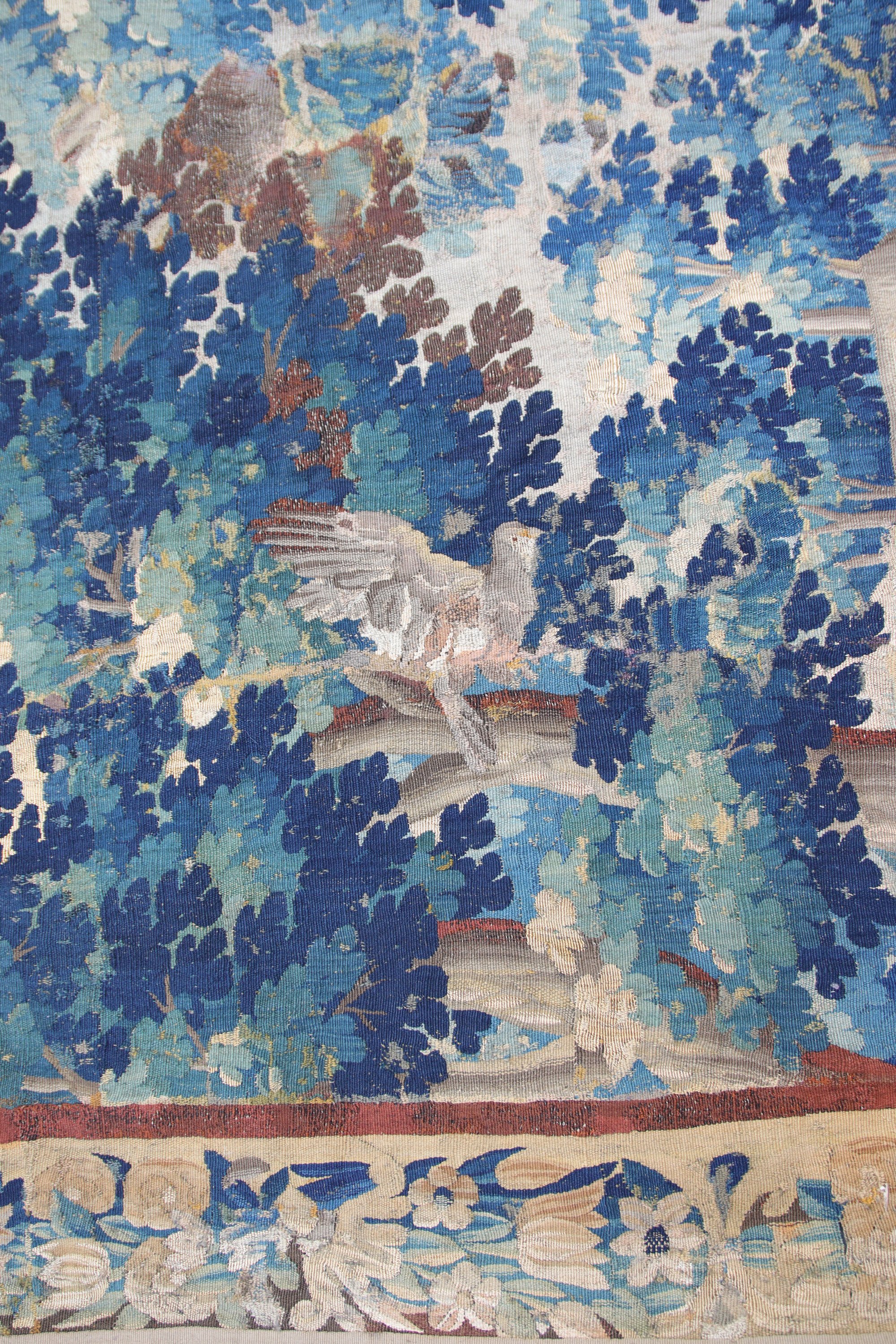 Tapisserie en laine à décor de volatiles dans paysage boisé découvrant un moulin. Bordure à fond jaune et décor de guirlandes de fleurs rapportées.