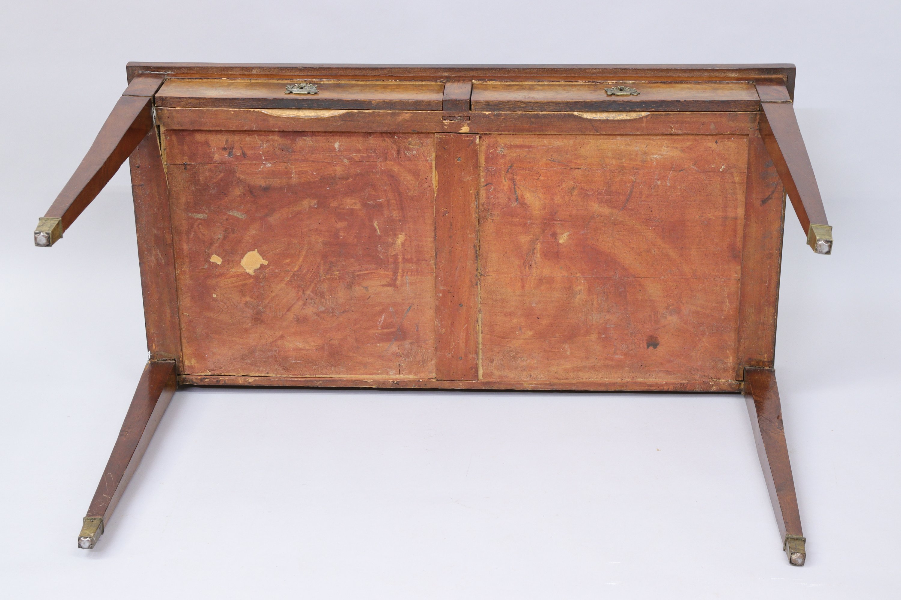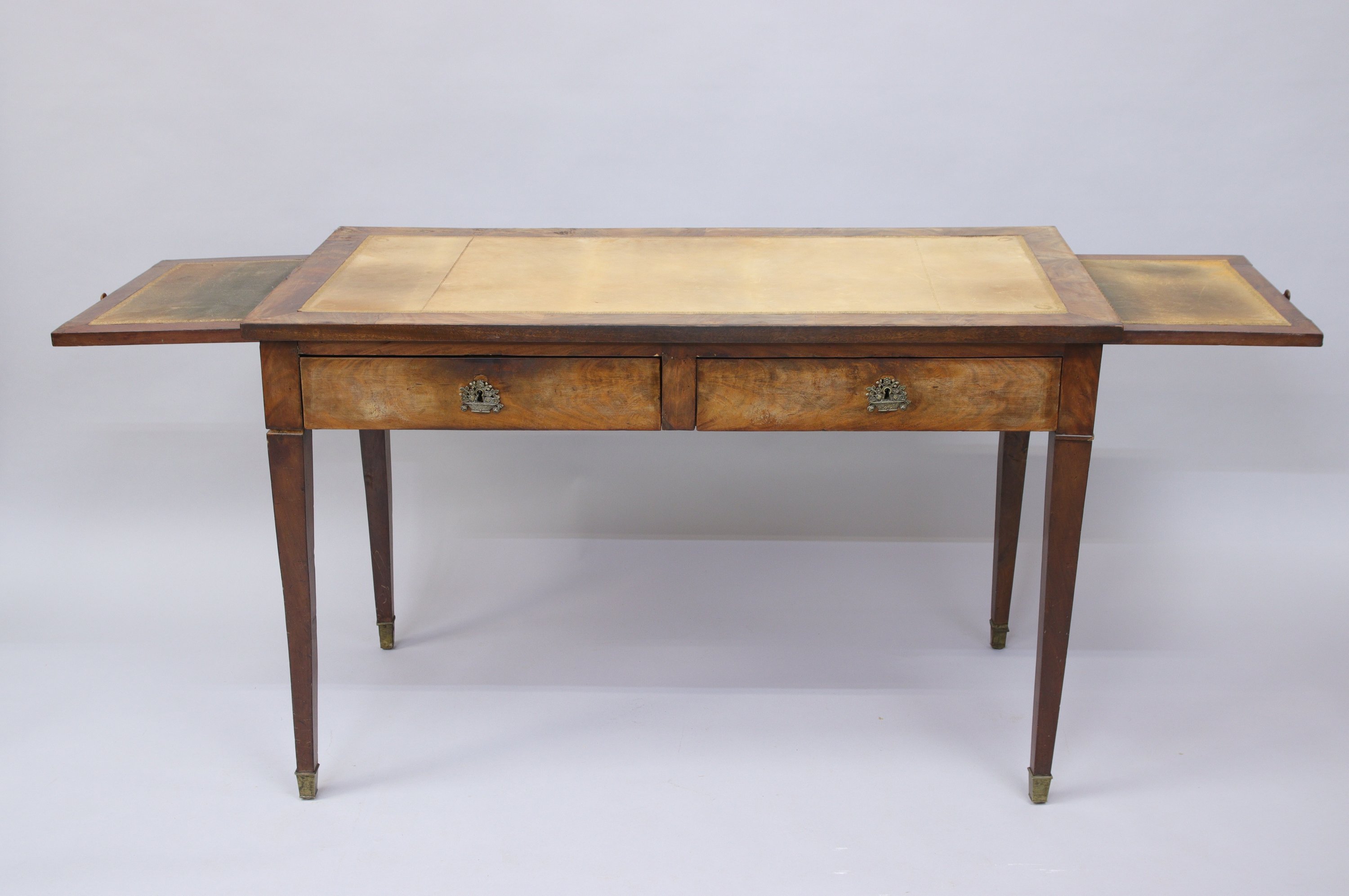 ouvrant par deux tiroirs en façade et deux tablettes coulissantes sur les côtés. Il repose sur quatre pieds gaines à sabots.