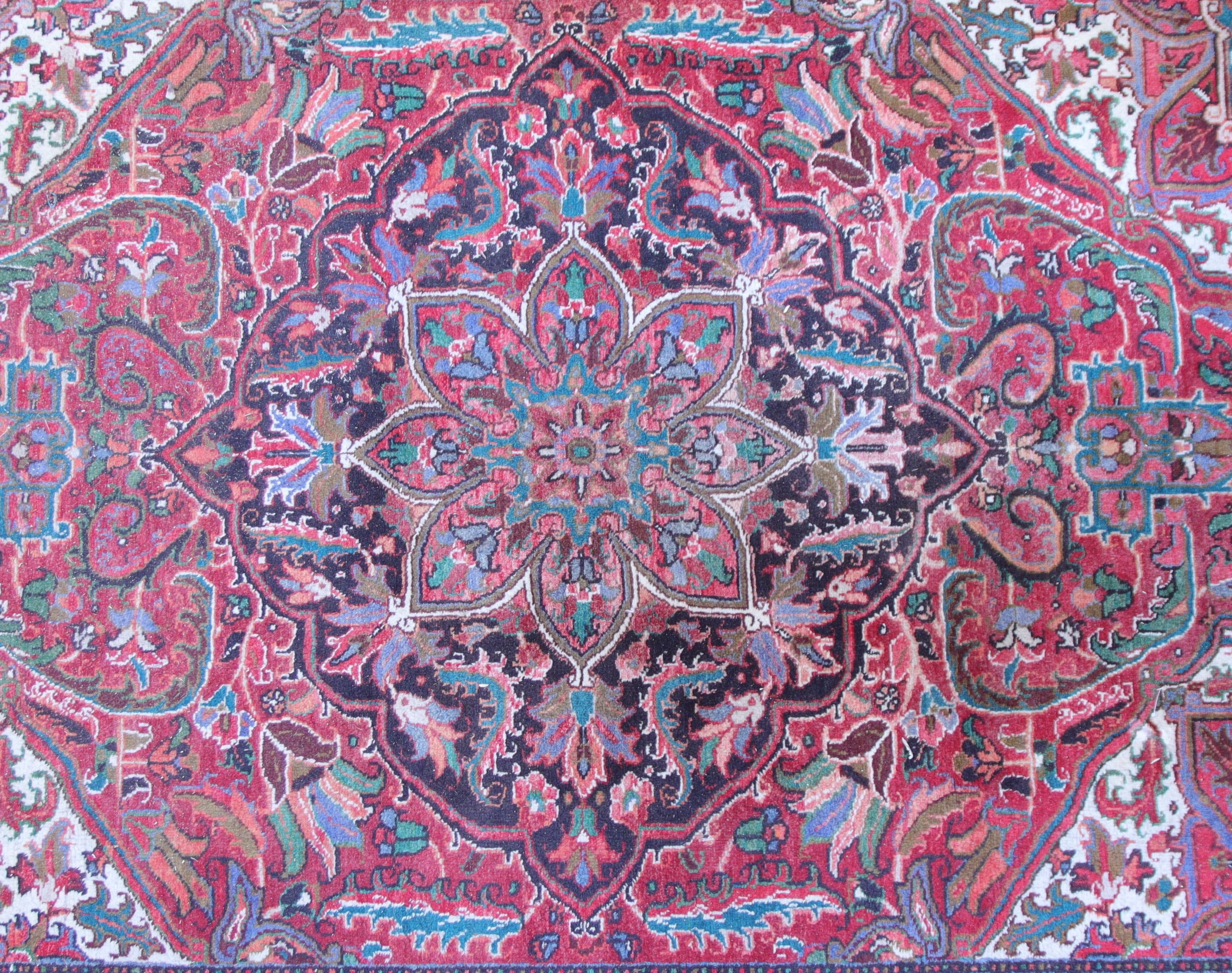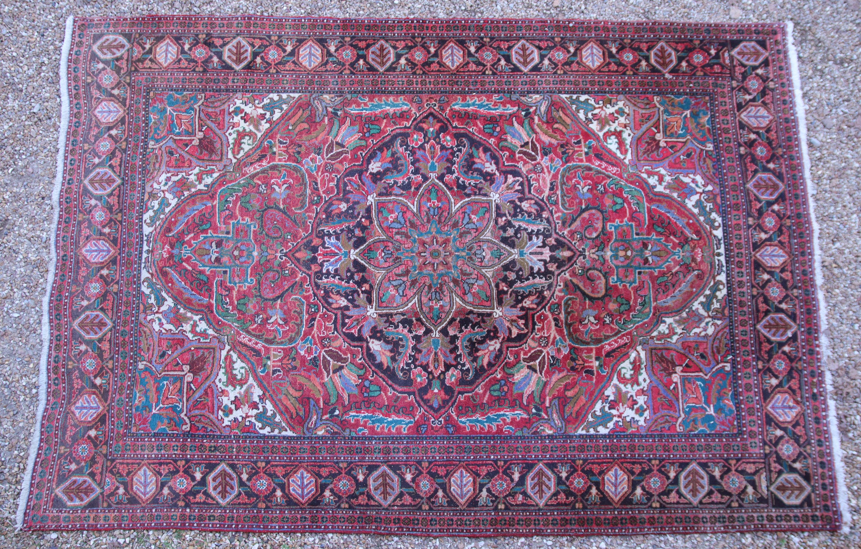 TAPIS d'ORIENT en laine à fond rouge à motif d'un grand médaillon central centré d'une rosace. Bordure principale à fond marron ornée d'une frise feuillagée.