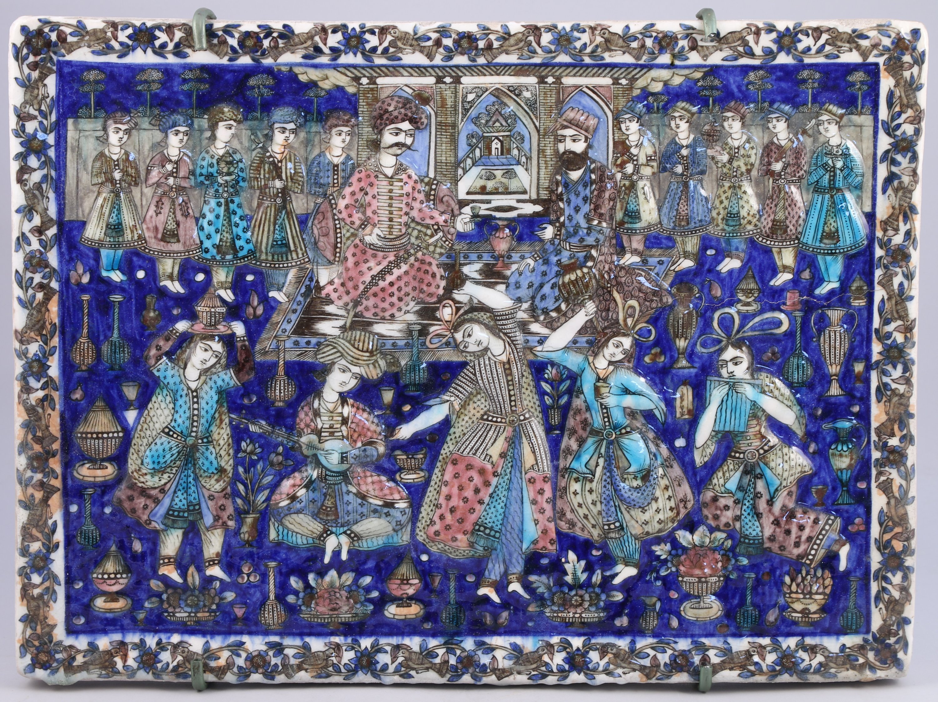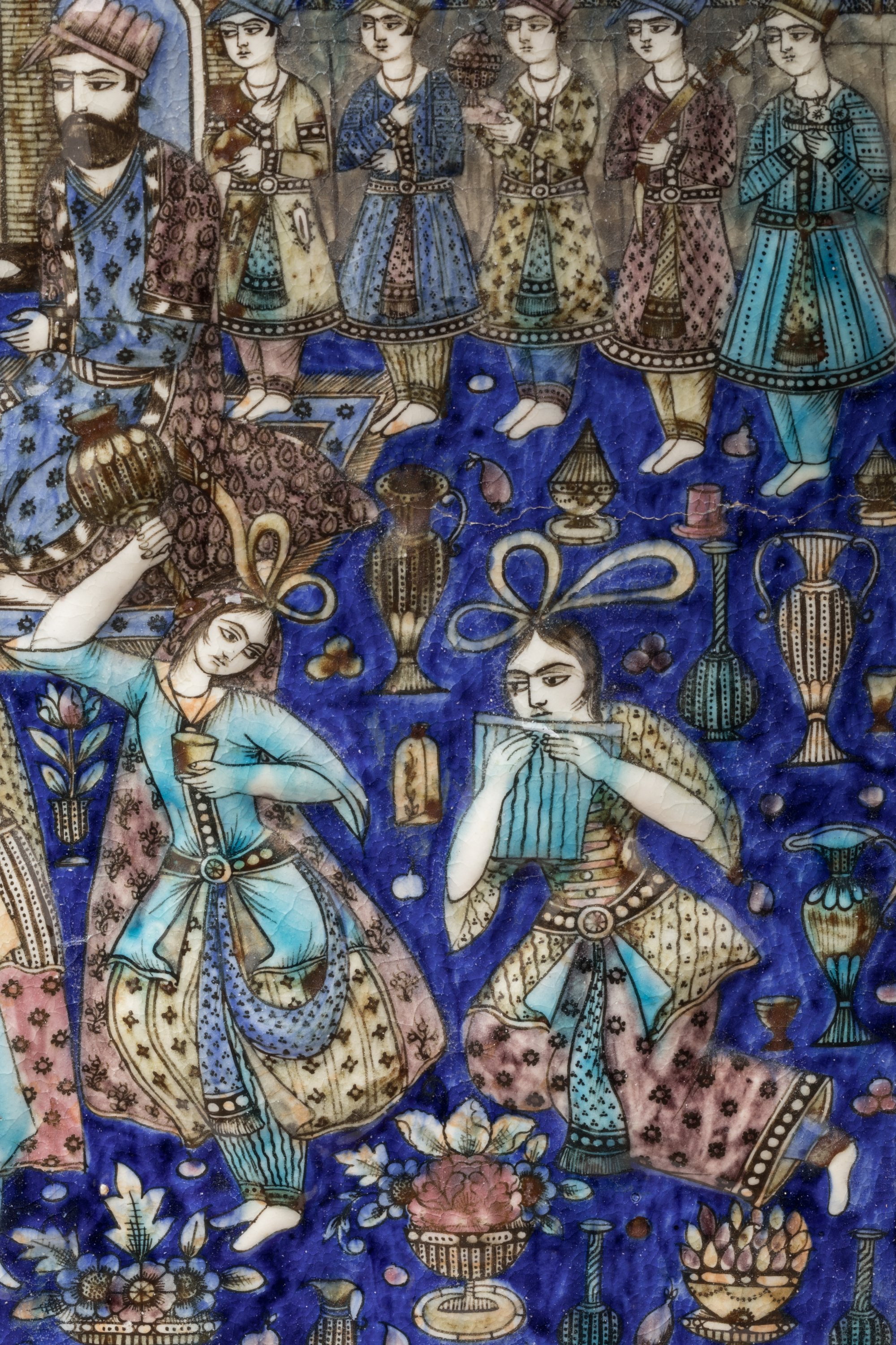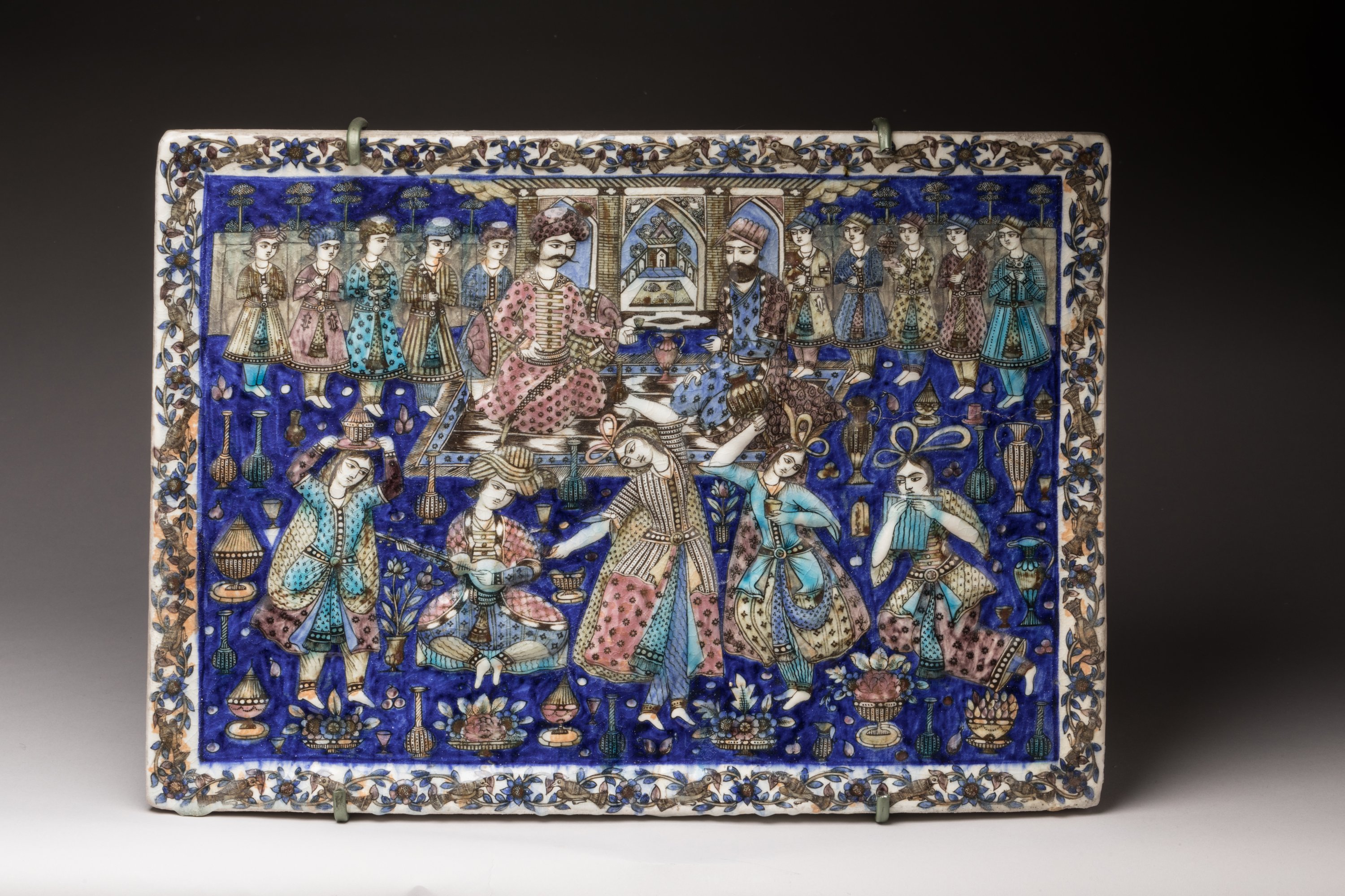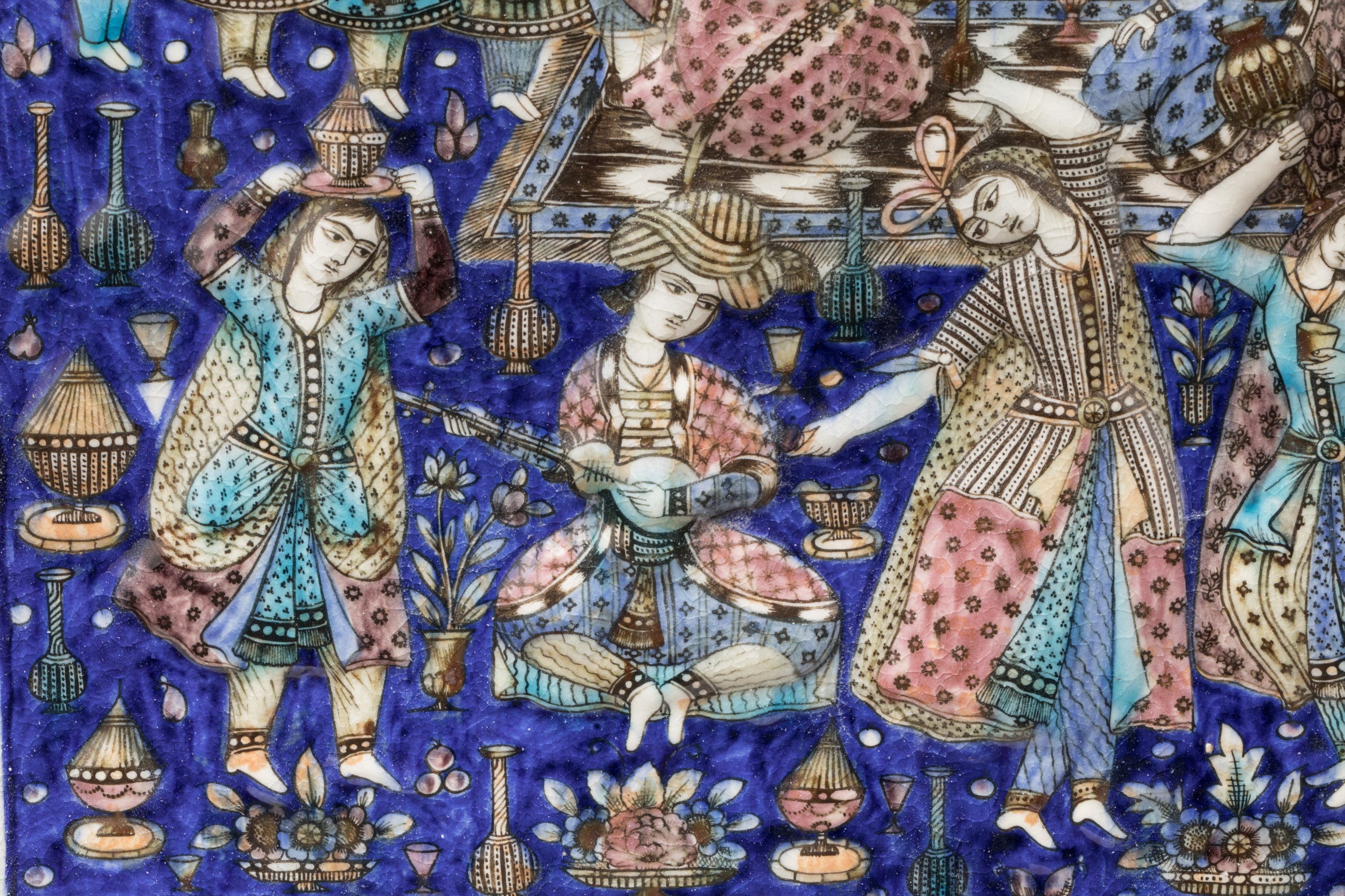 Grand CARREAU de revêtement d'un divertissement royal. Céramique à décor moulé peint en polychromie sur fond bleu. Bordure de guirlande végétale sur fond blanc. Un roi reçoit un dignitaire en regardant des musiciennes et danseuses dans son palais.