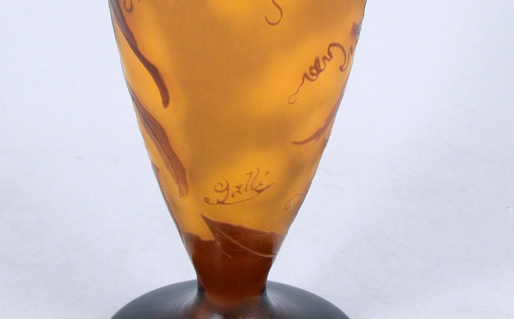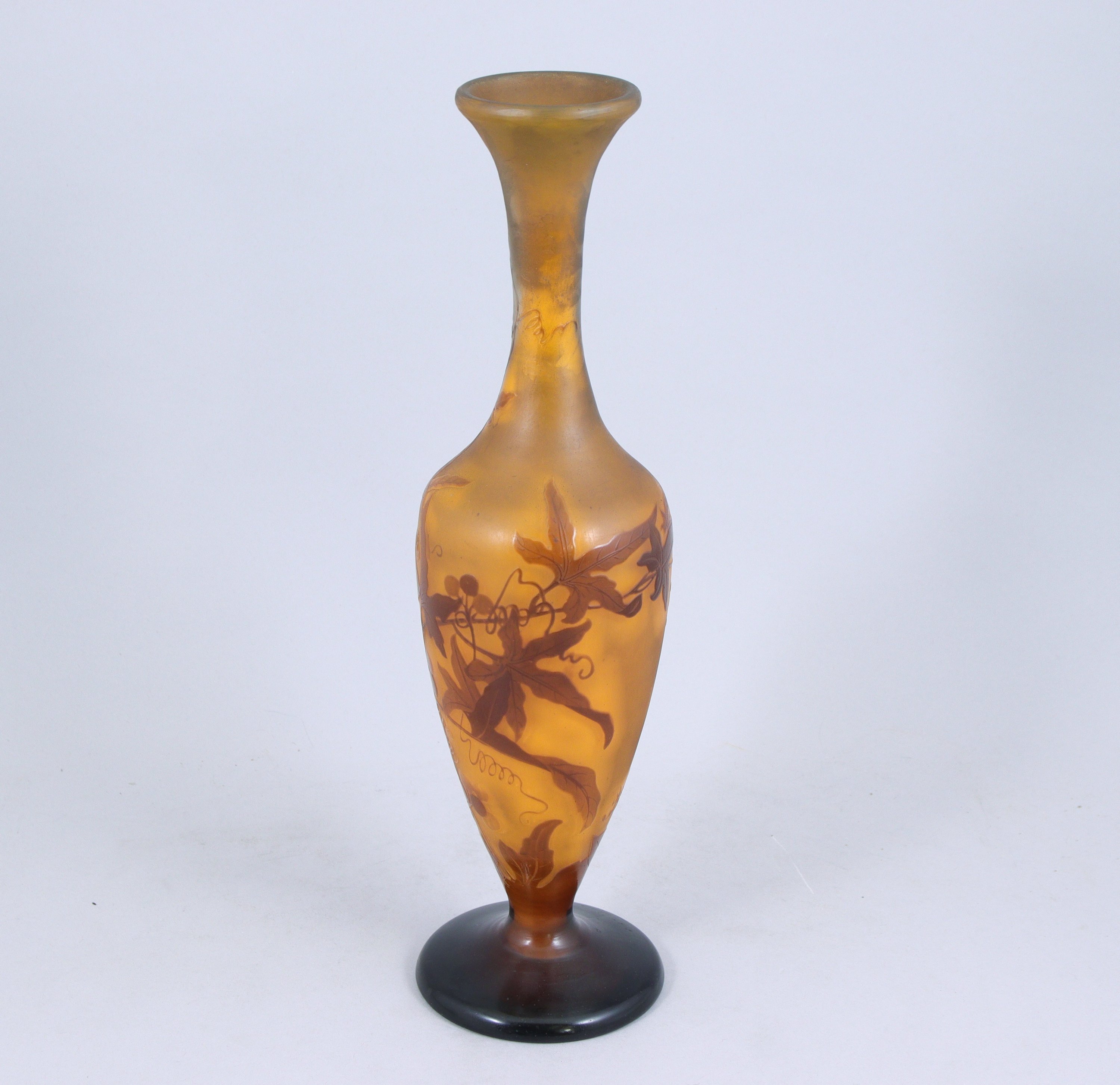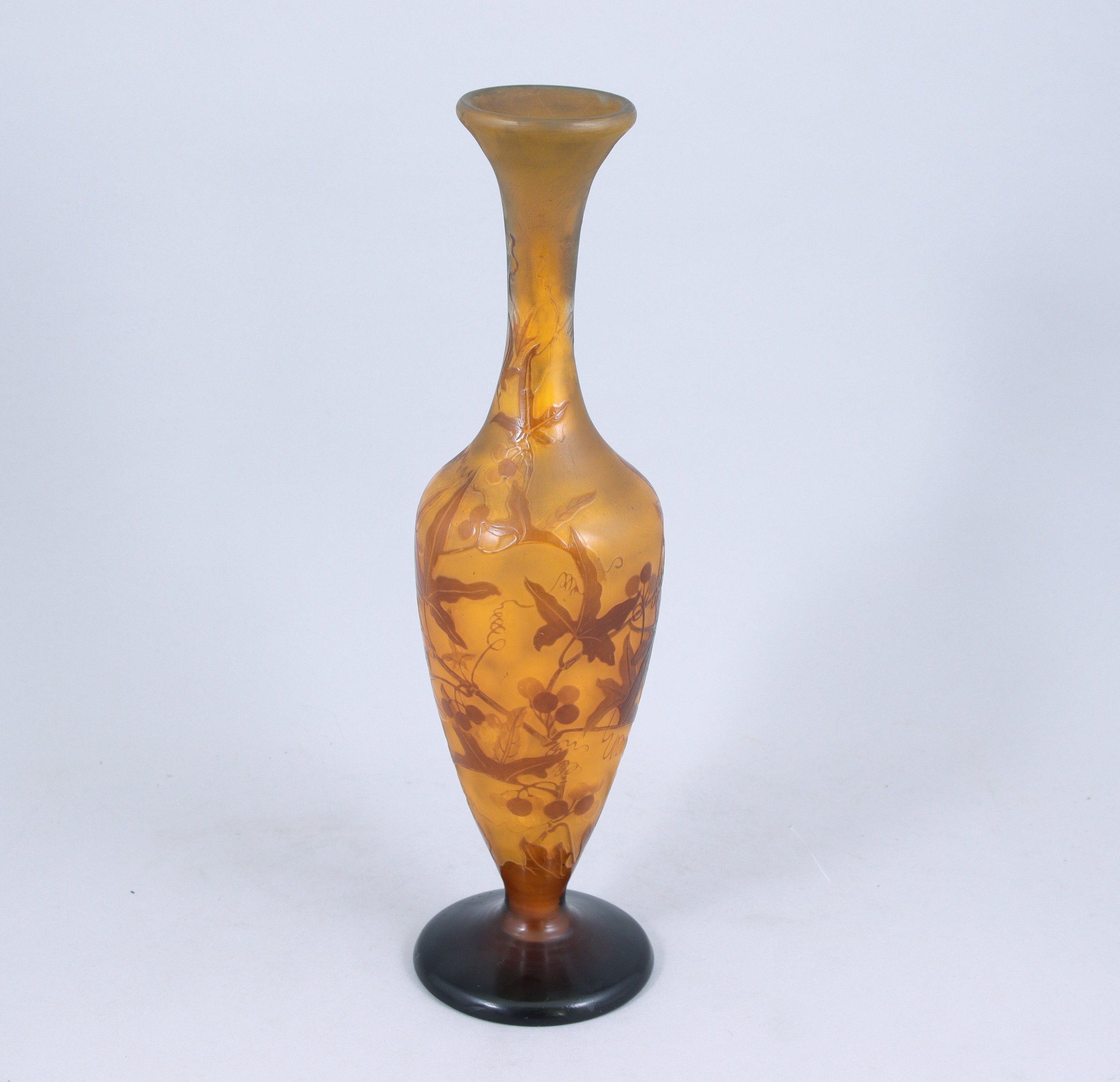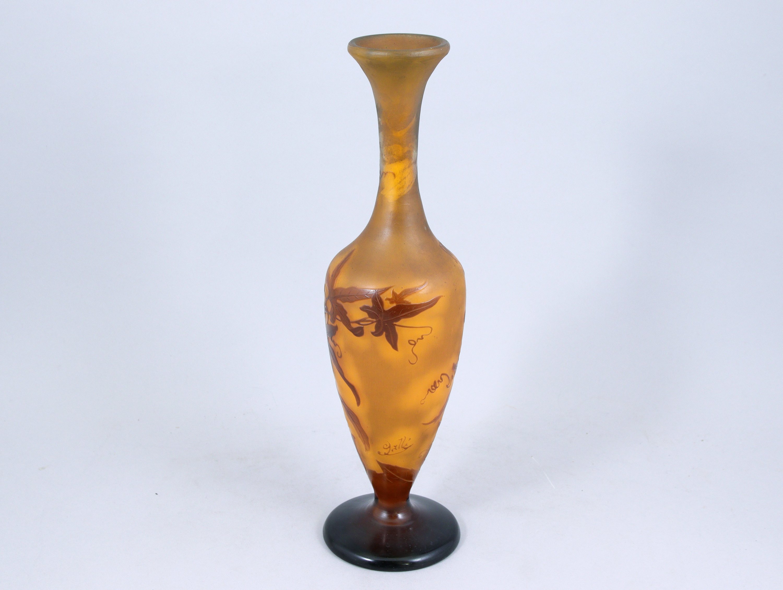 en verre multicolore, gravé à l'acide. Décor d'érable du Japon (?) mauve sur fond orangé.