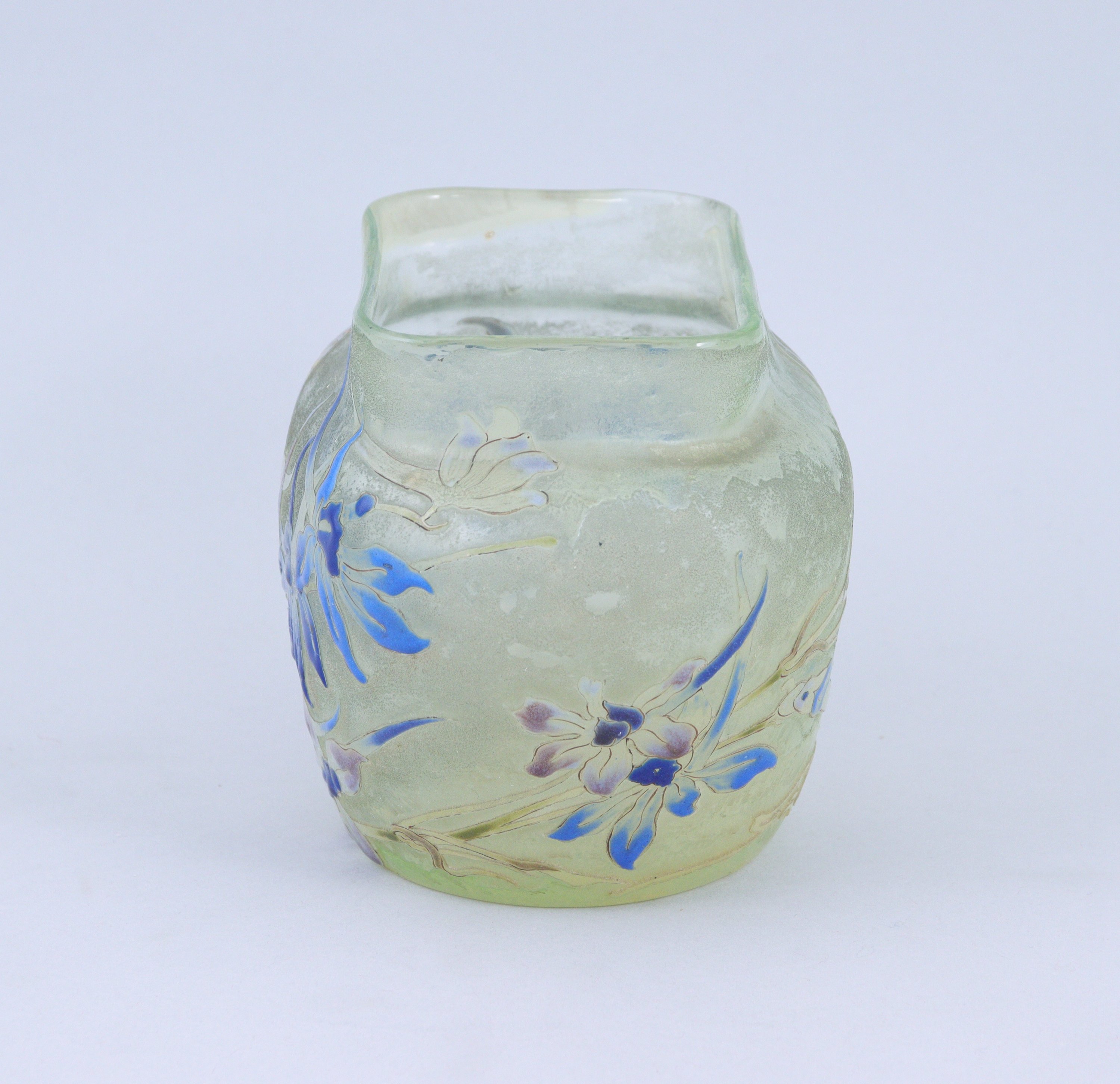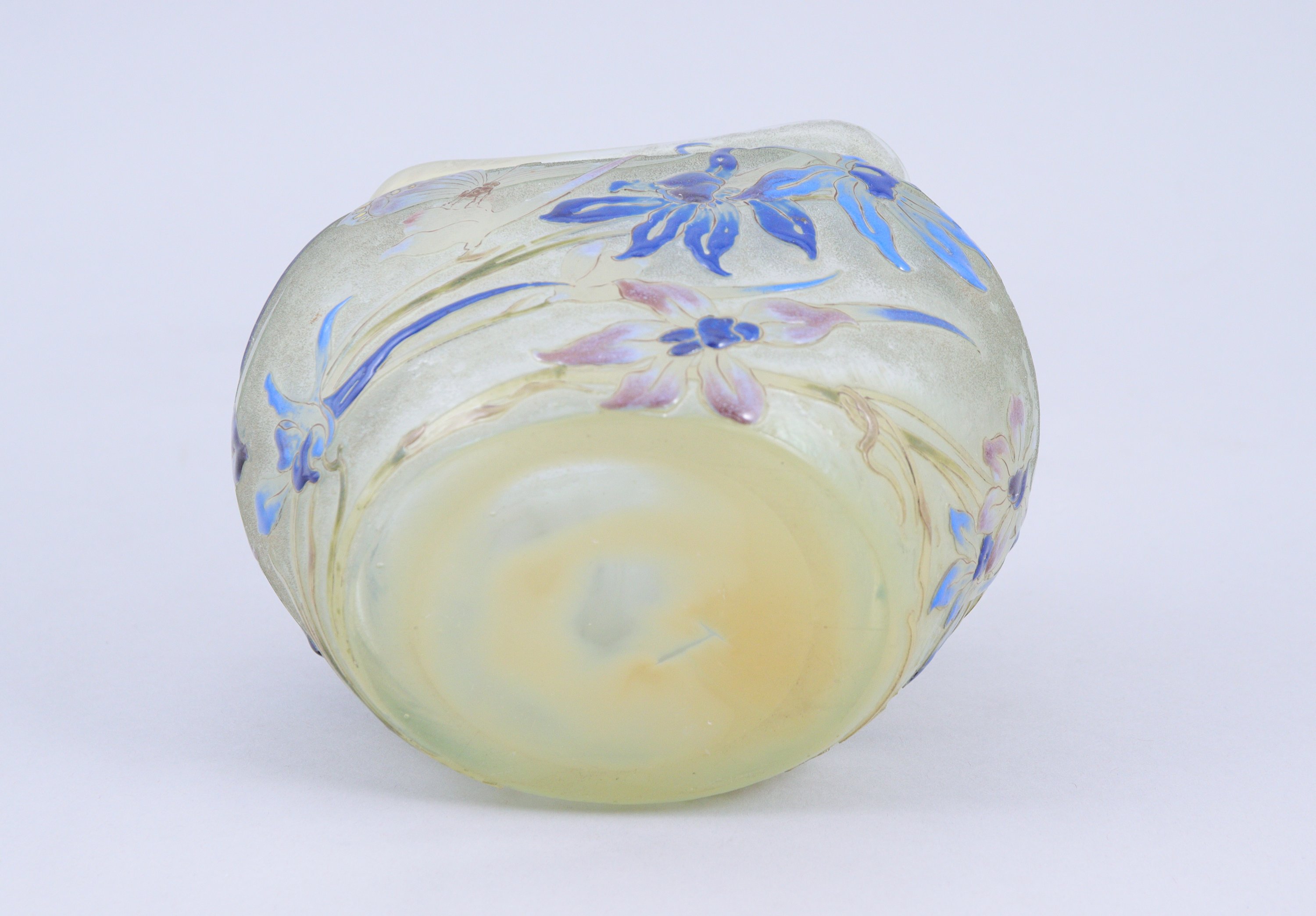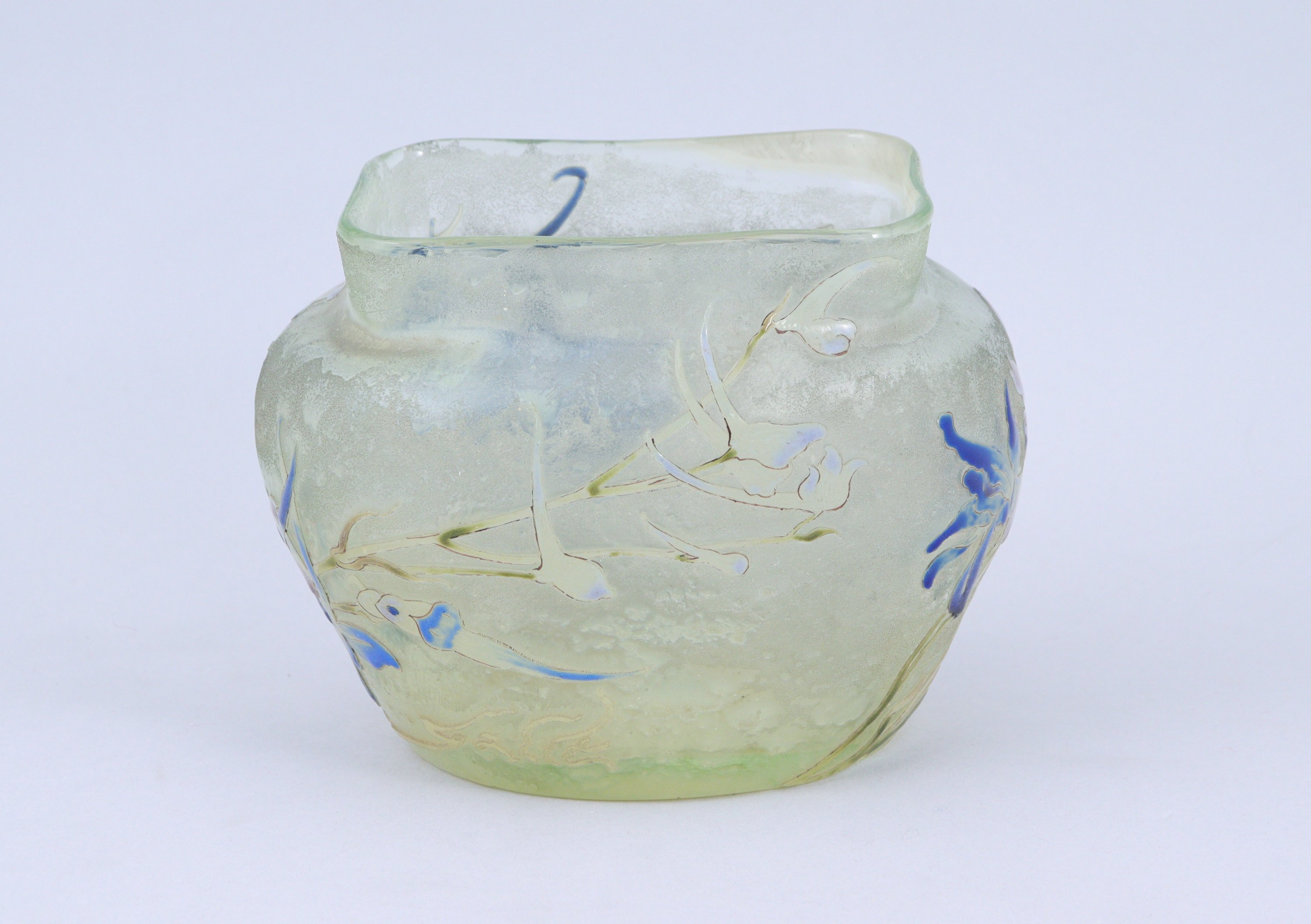 de forme pansue avec un col rectangulaire en verre translucide au fond givré, au décor dégagé à la roue ou à l'acide avec des rehaut d'émaux.