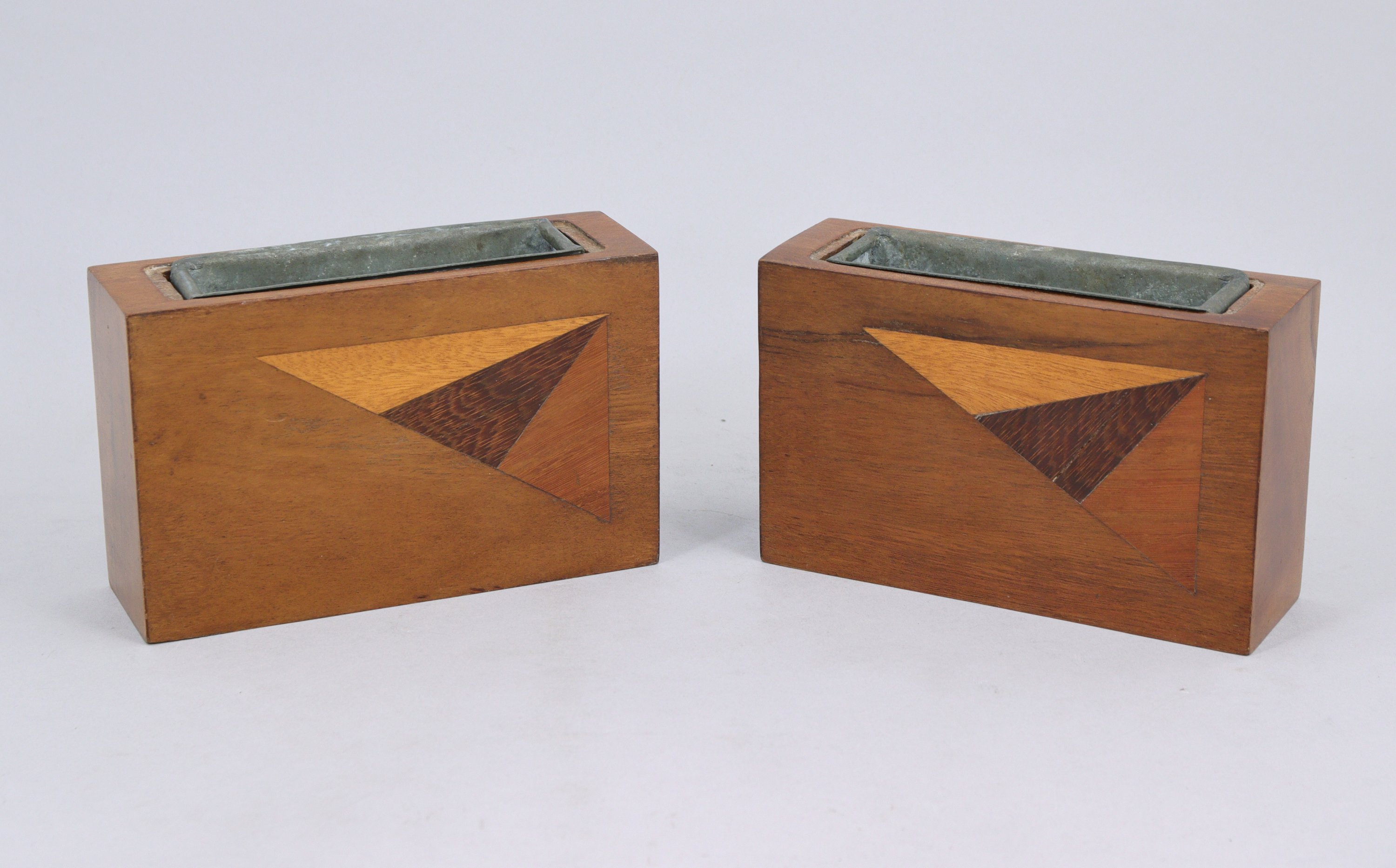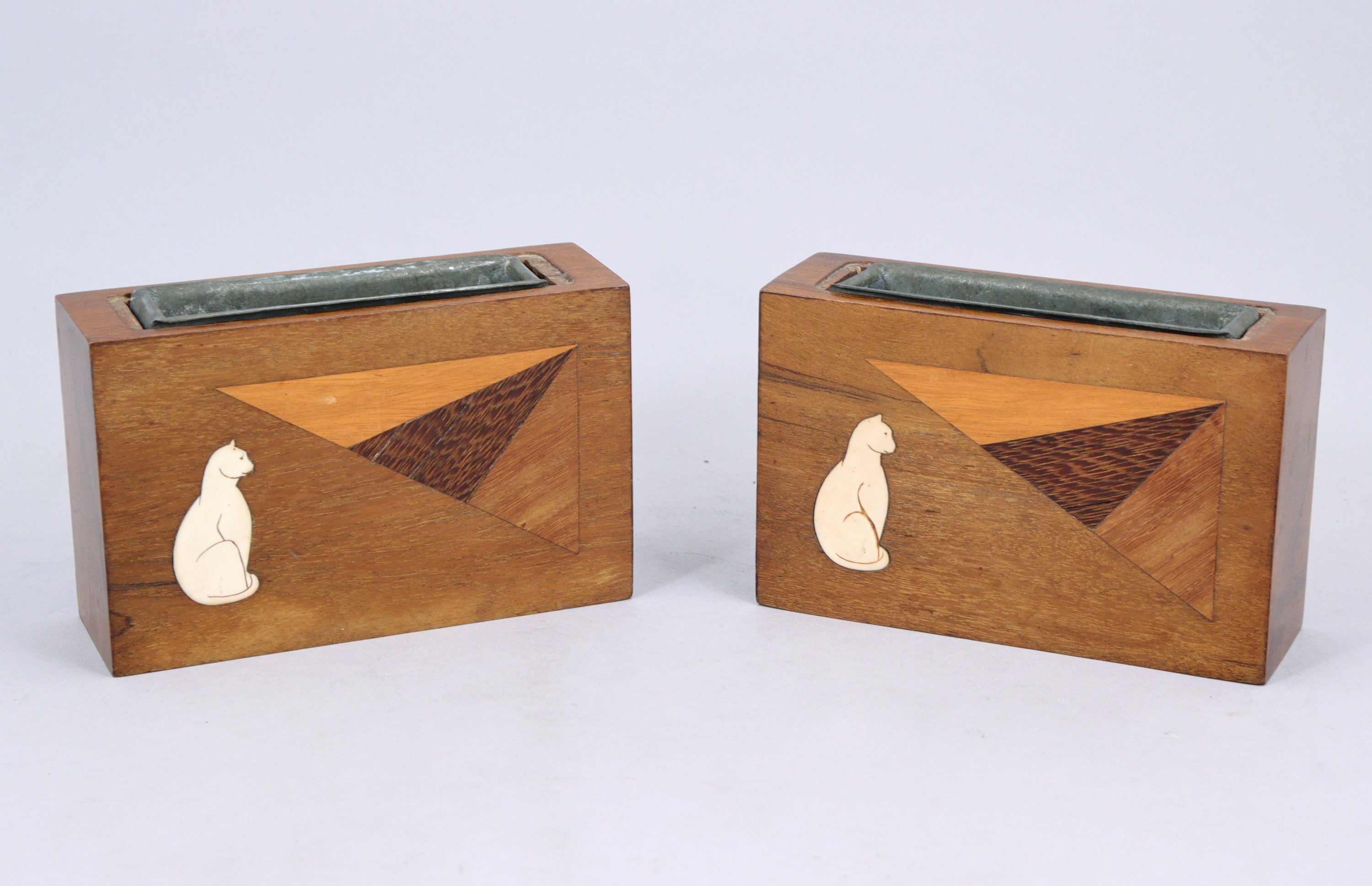 de forme rectangulaire, ornées d'un chat et de motifs géométriques. Garnies de récipients en étain.