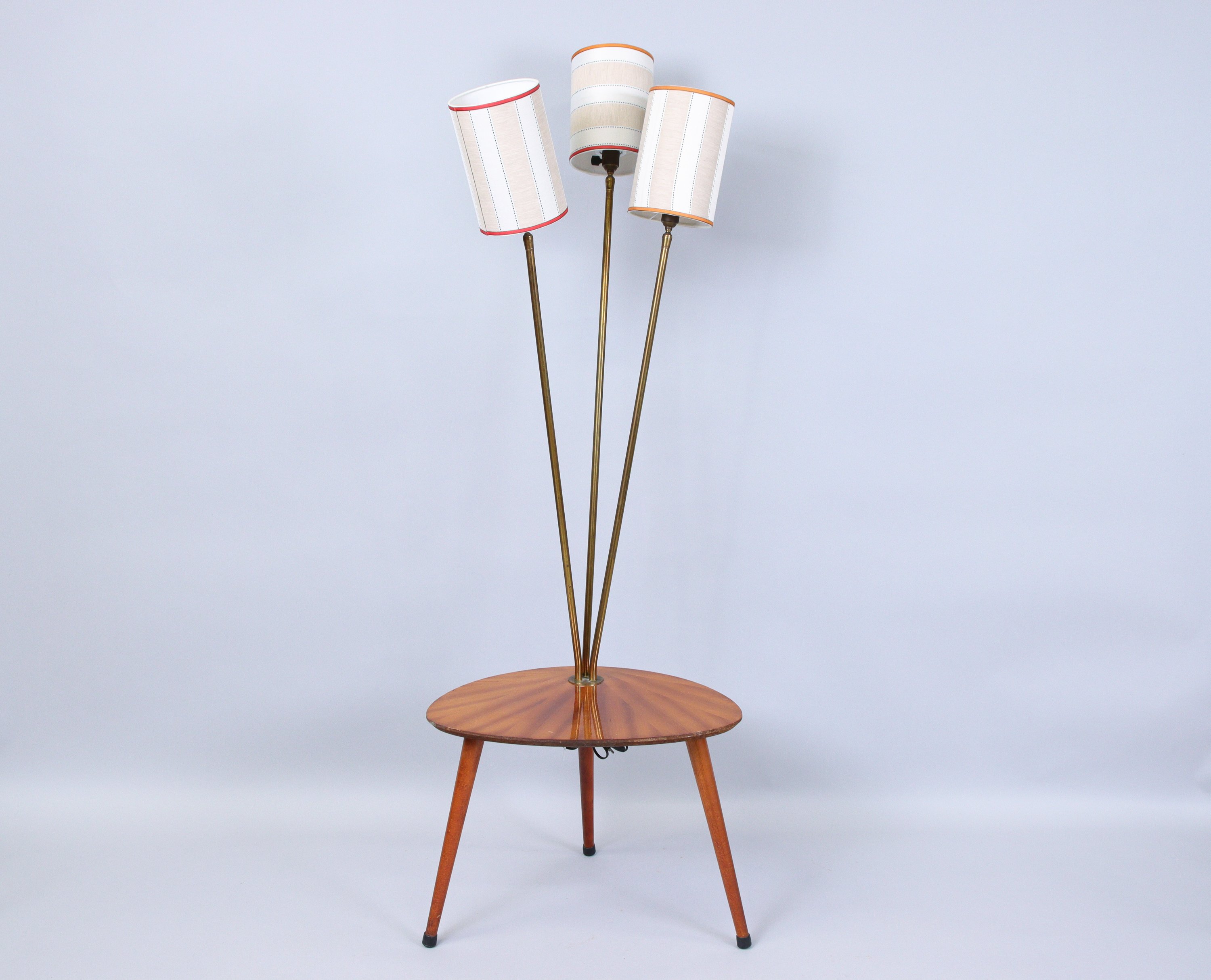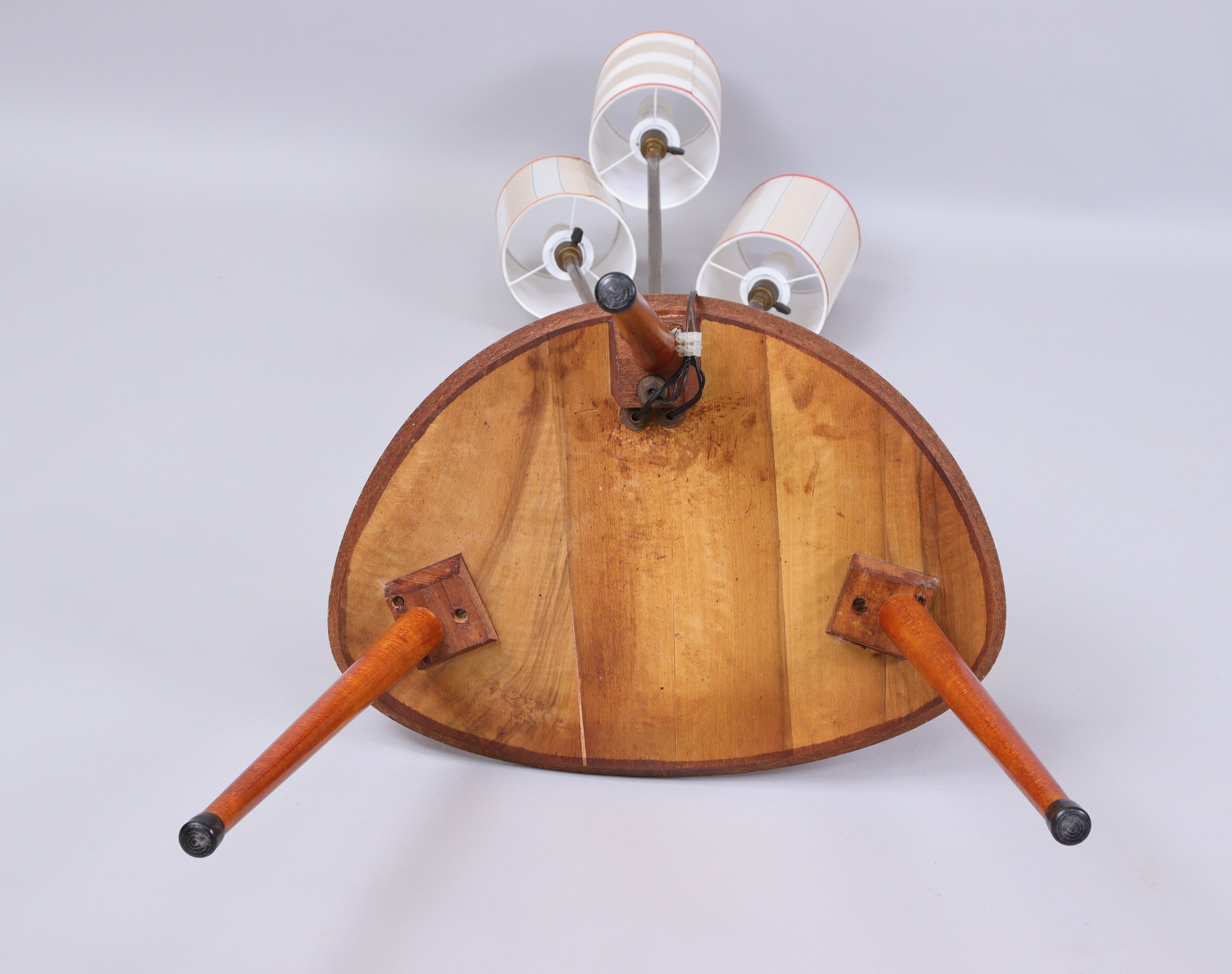 en teck et placage de teck à piétement tripode, électrifiée dans le goût de René MATHIEU par un lampadaire en laiton doré à trois branches.