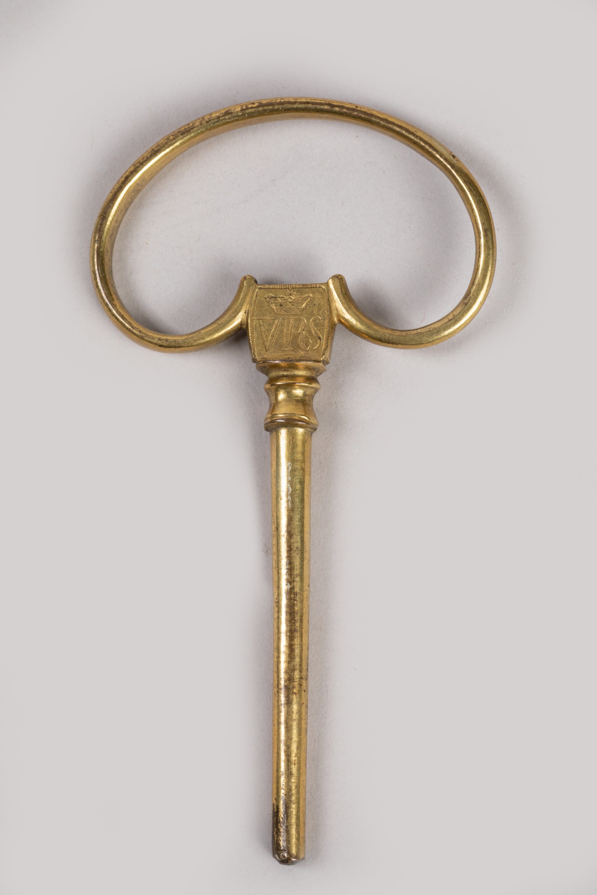 A 18th century Spain or 19th century Italy gilded metal chamberlain key bearing a crowned "VRS" monogram.