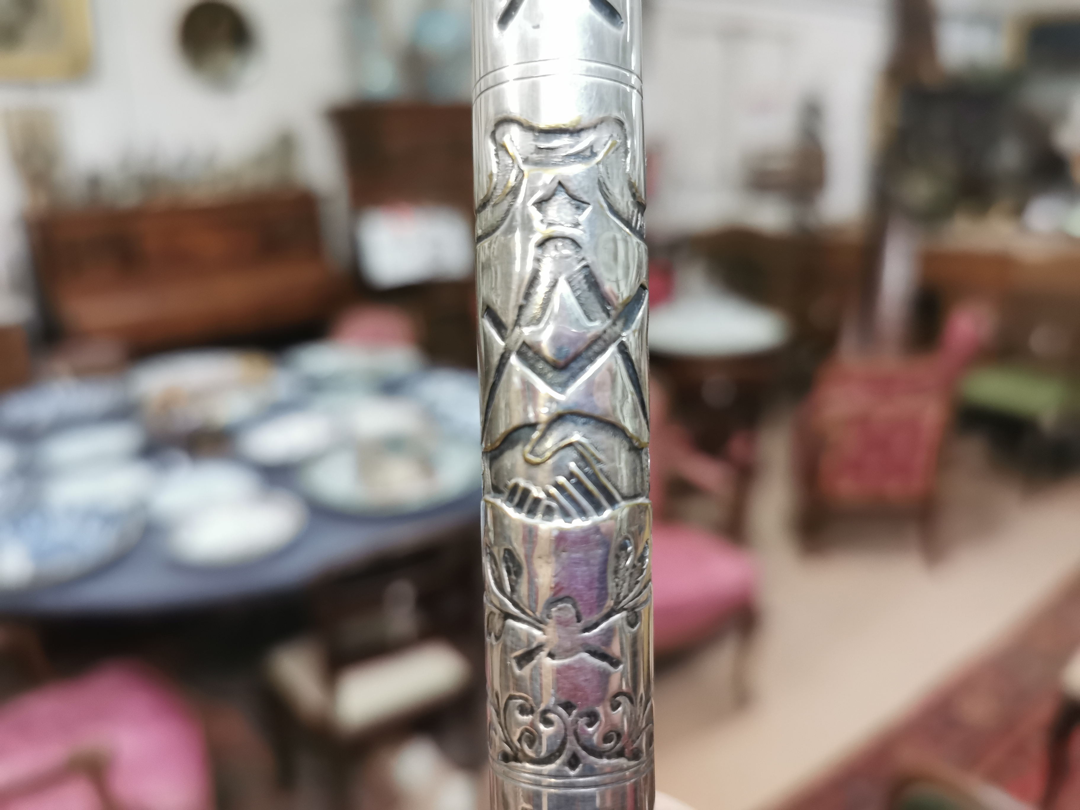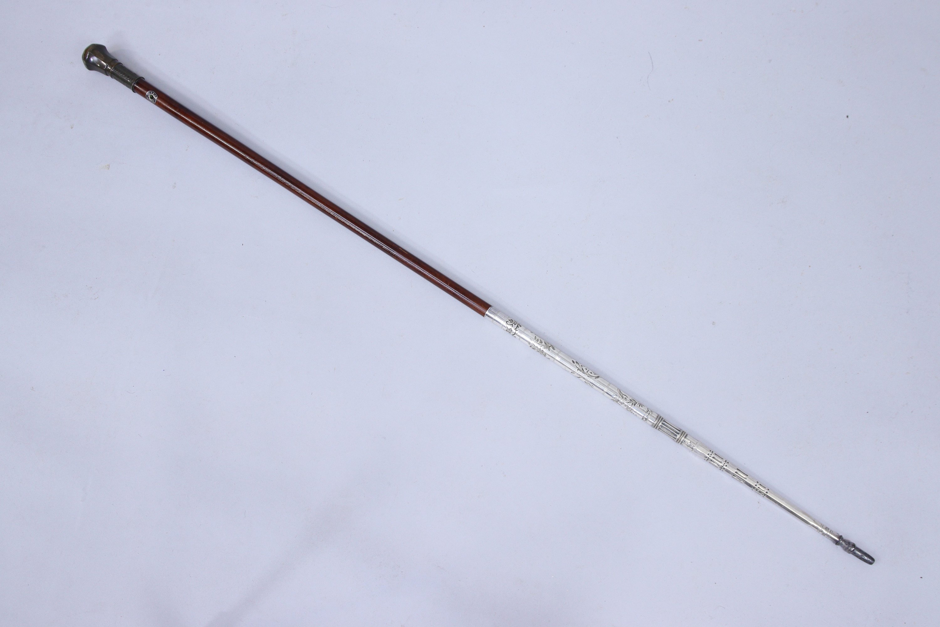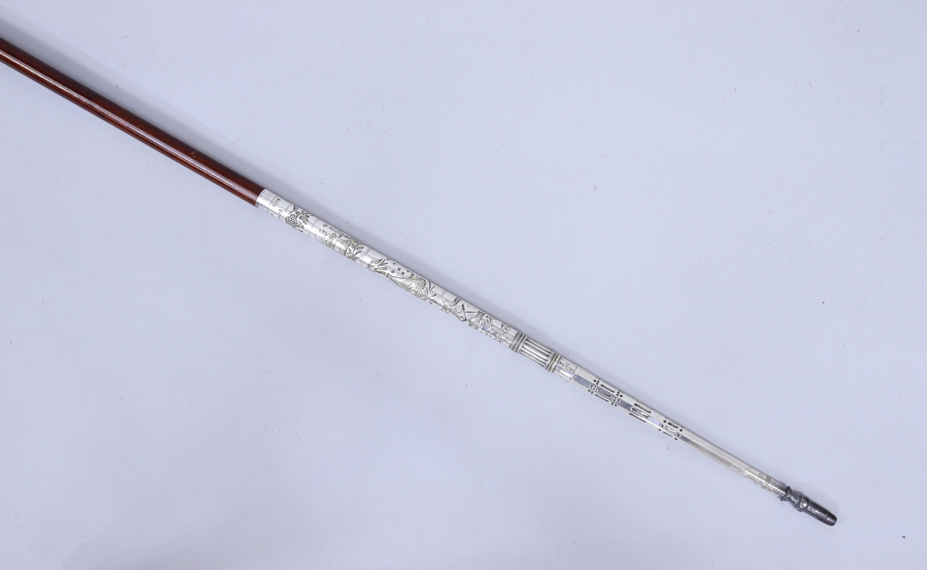 L'extrémité en bronze et métal argenté, gravée de signes compagnonniques, est située et datée "Lyon 1901 déposé". La férule est dévissable.