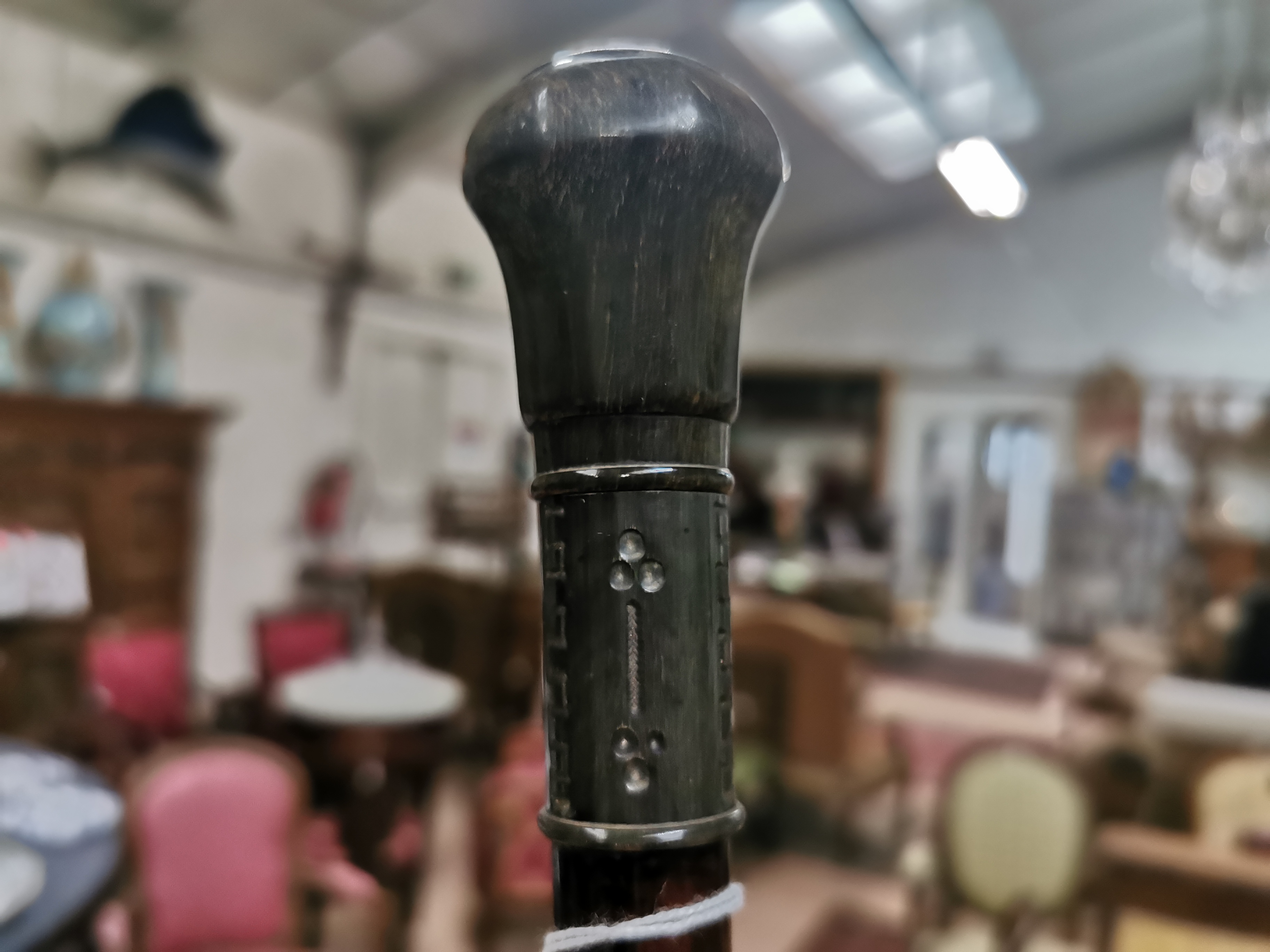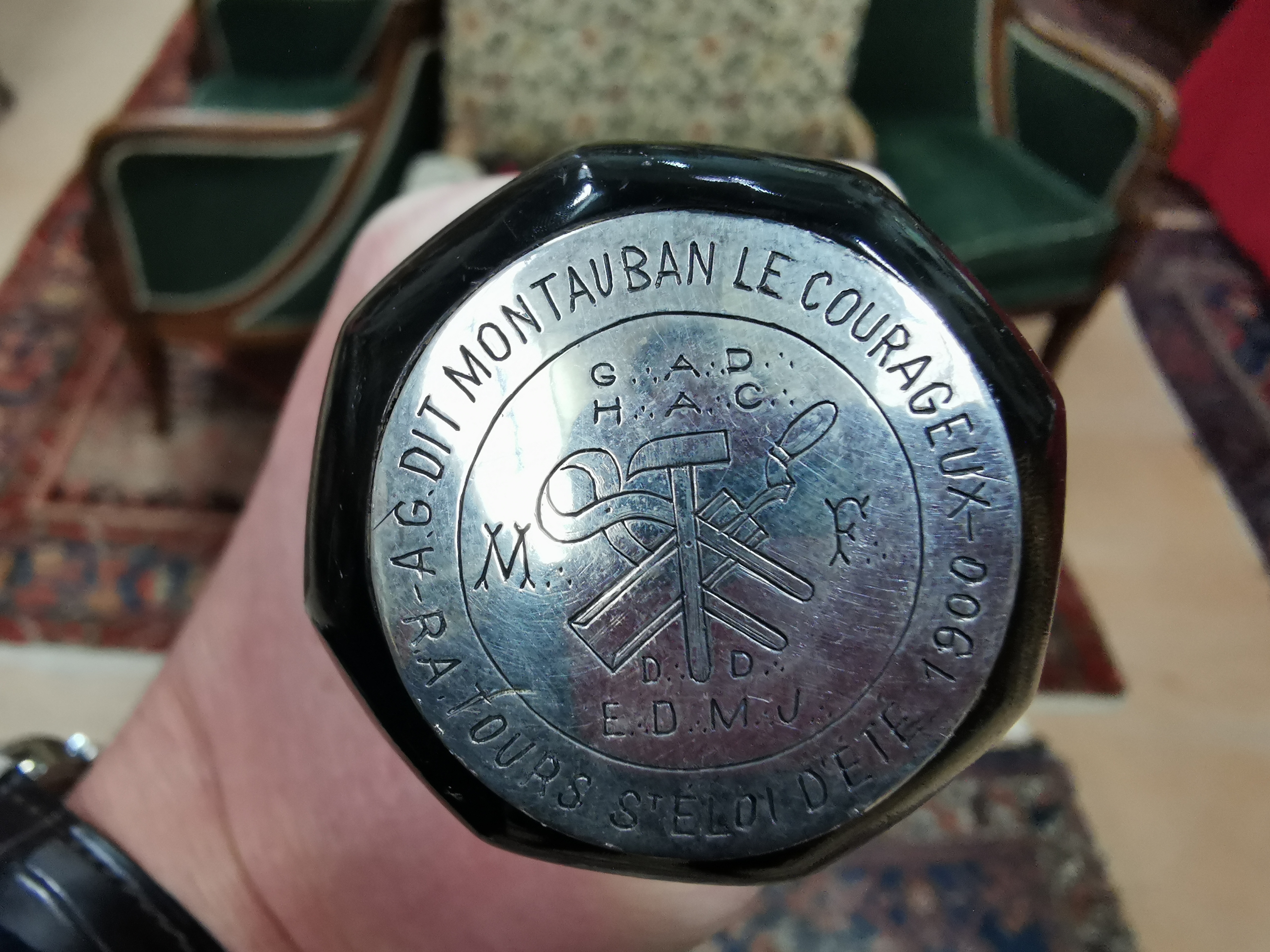 Le pommeau en corne est gravé de motifs géométriques. Sur le sommet, une pastille métallique est gravée "A.G dit Montauban le Courageux, RA Tours St Éloi d'été 1900" et au centre "G. A.D H. A.C MF DD E.D.M.J".