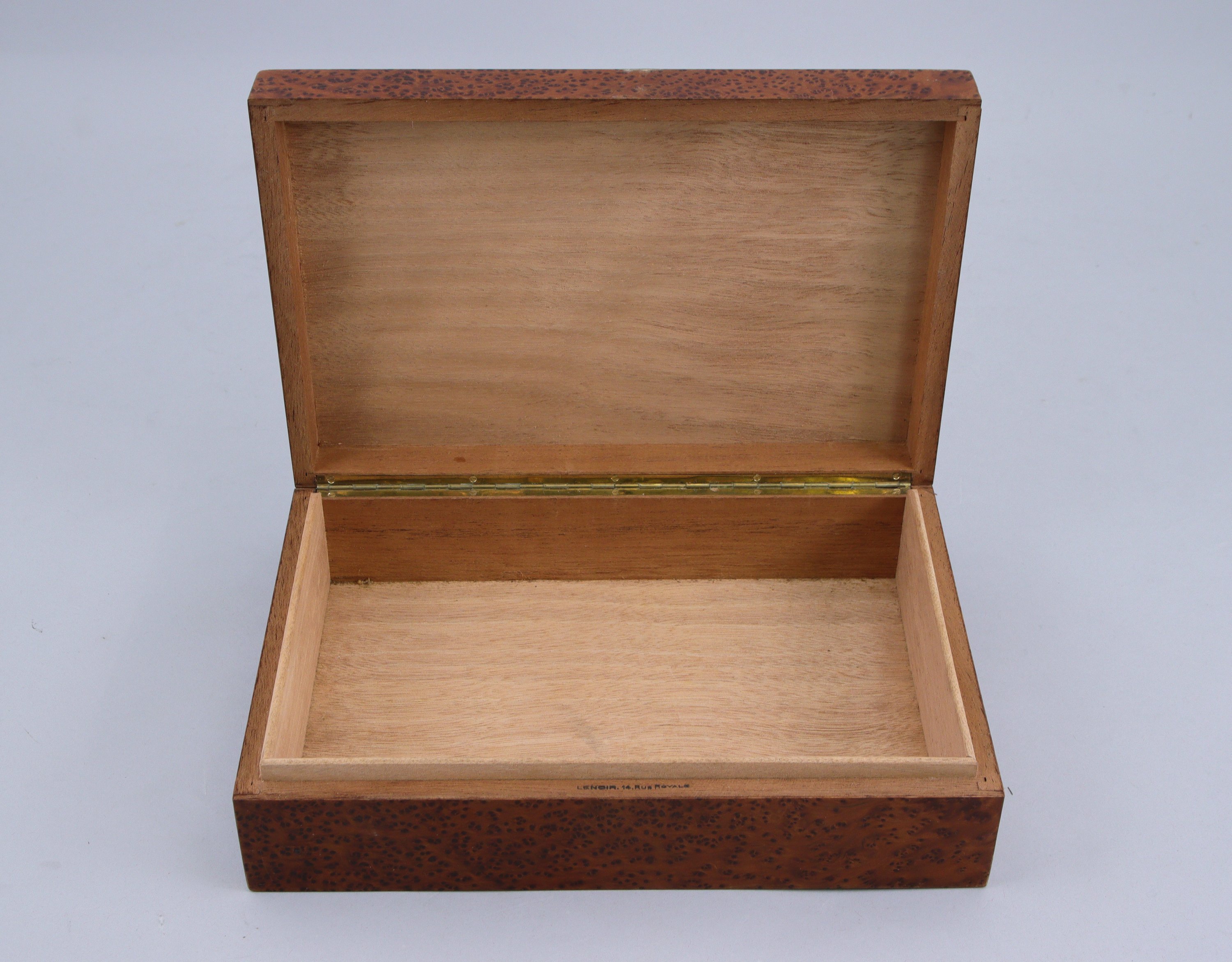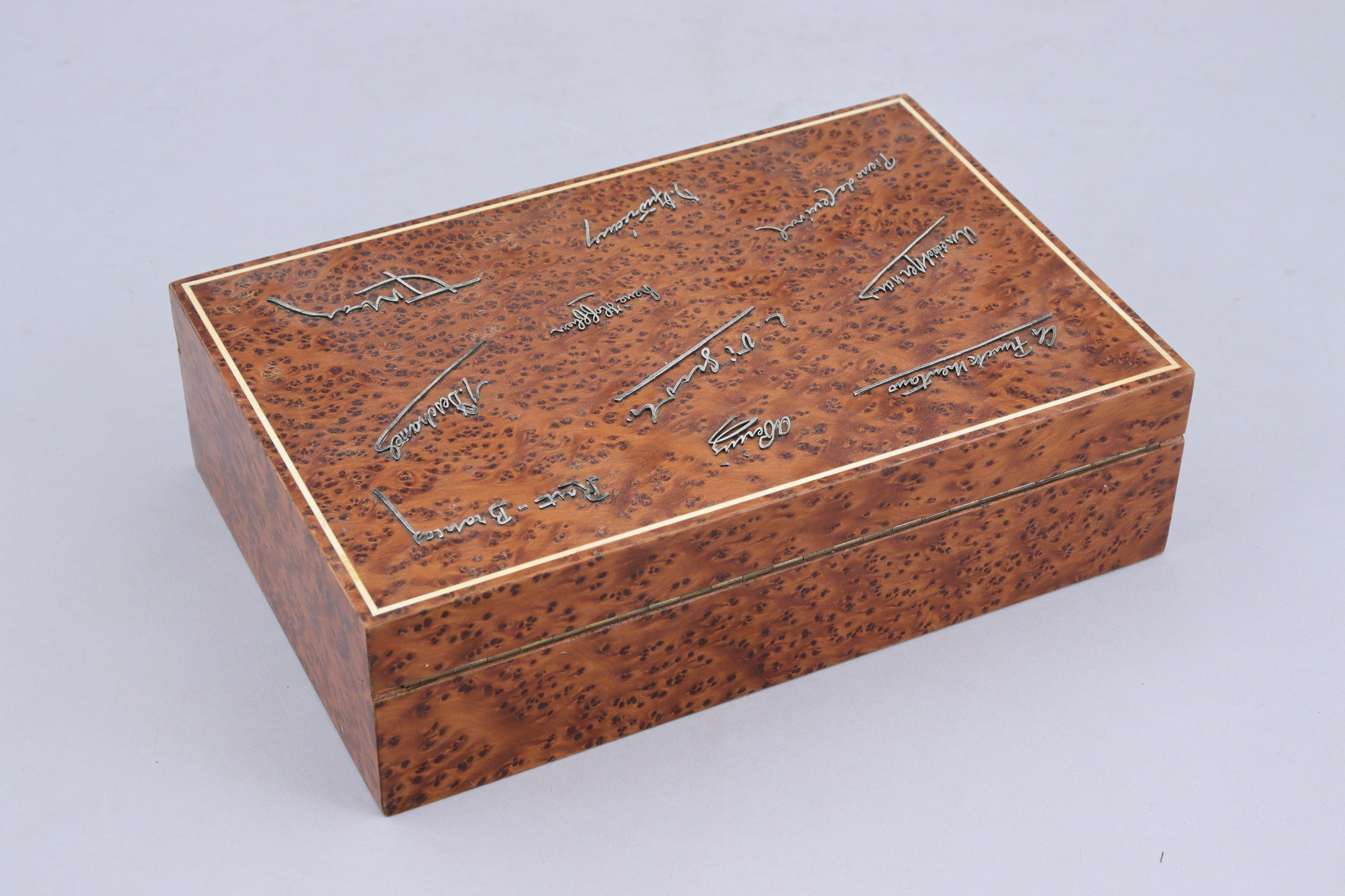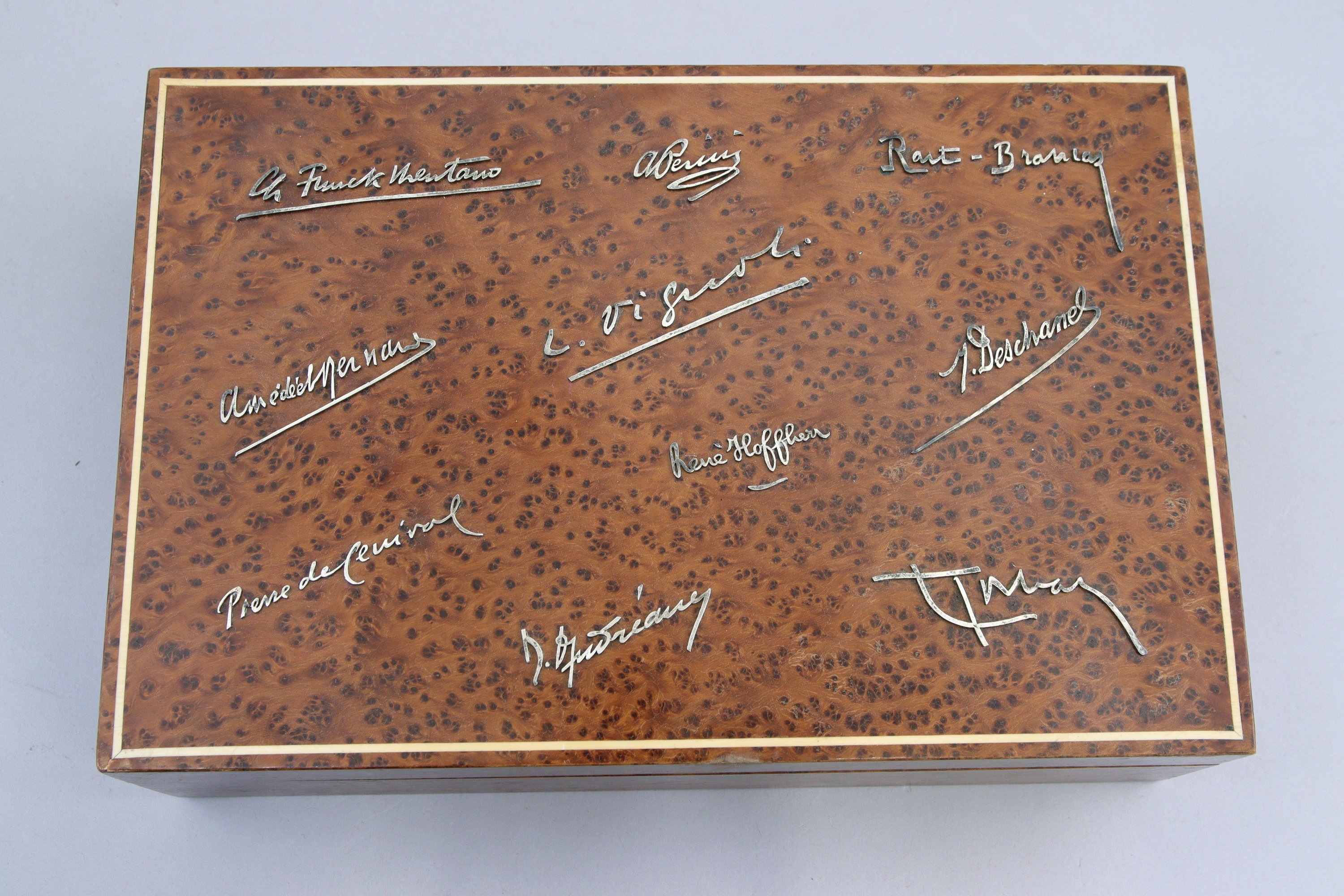 en placage de loupe, de forme rectangulaire. Le dessus incrusté d'un filet d'os et de dix signatures en argent ou métal argenté: René HOFFHER, M. DESCHAMEL, L. VIGNOLI, Amédée MERNARS, Pierre de CEVIVAL, H. ANDREAMY, T. MAY, RART-BRAMAZ. Marquée Lenoir 14 rue royale.