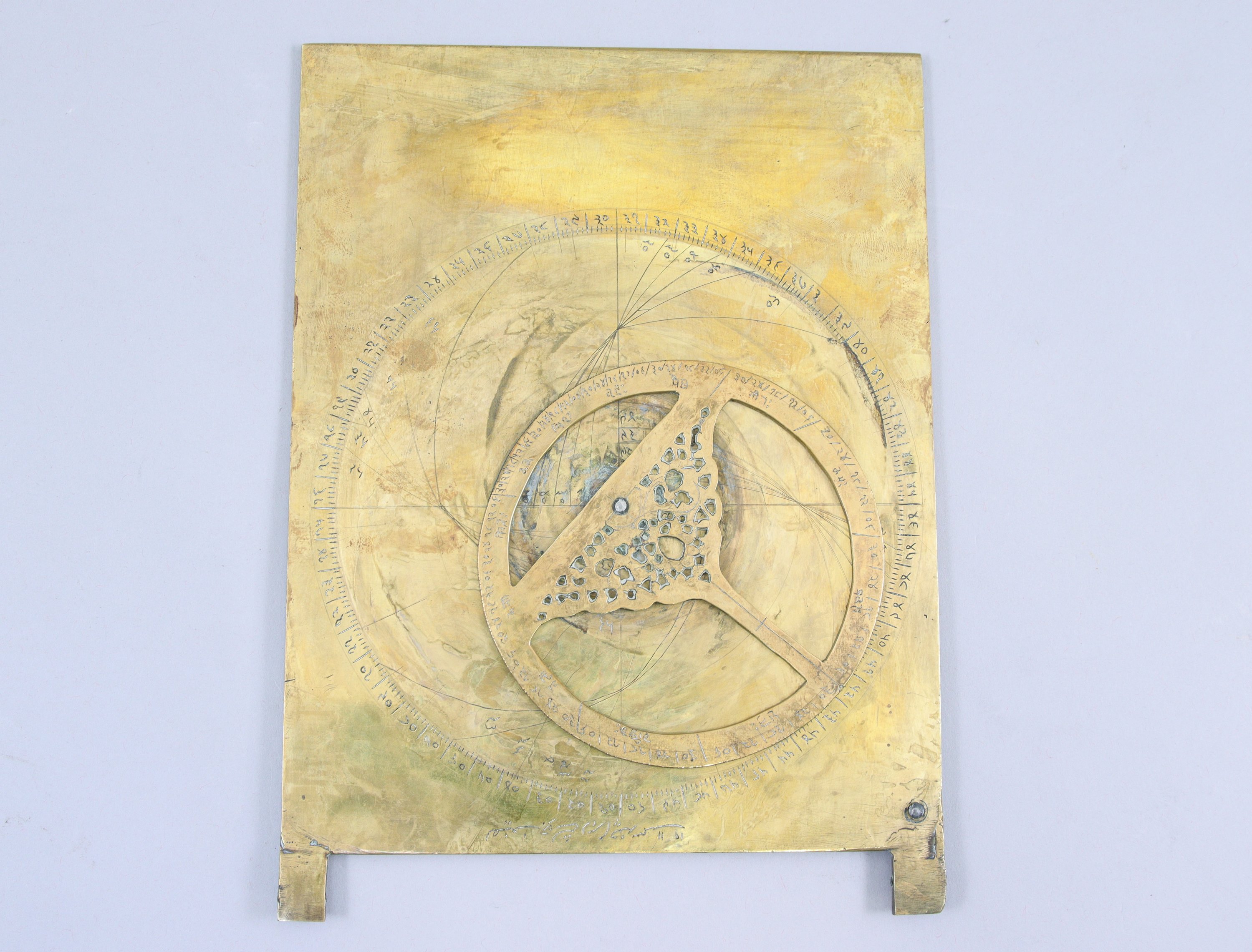 INSTRUMENT SCIENTIFIQUE DÉCORATIF non fonctionnel. Plaque de laiton rectangulaire gravée sur lavers dun quart de cercle trigonométrique non précis, et au revers dune échelle des degrés et dun disque mobile aux graduations irrégulières. Porte une inscription et peut-être la date de 1911.