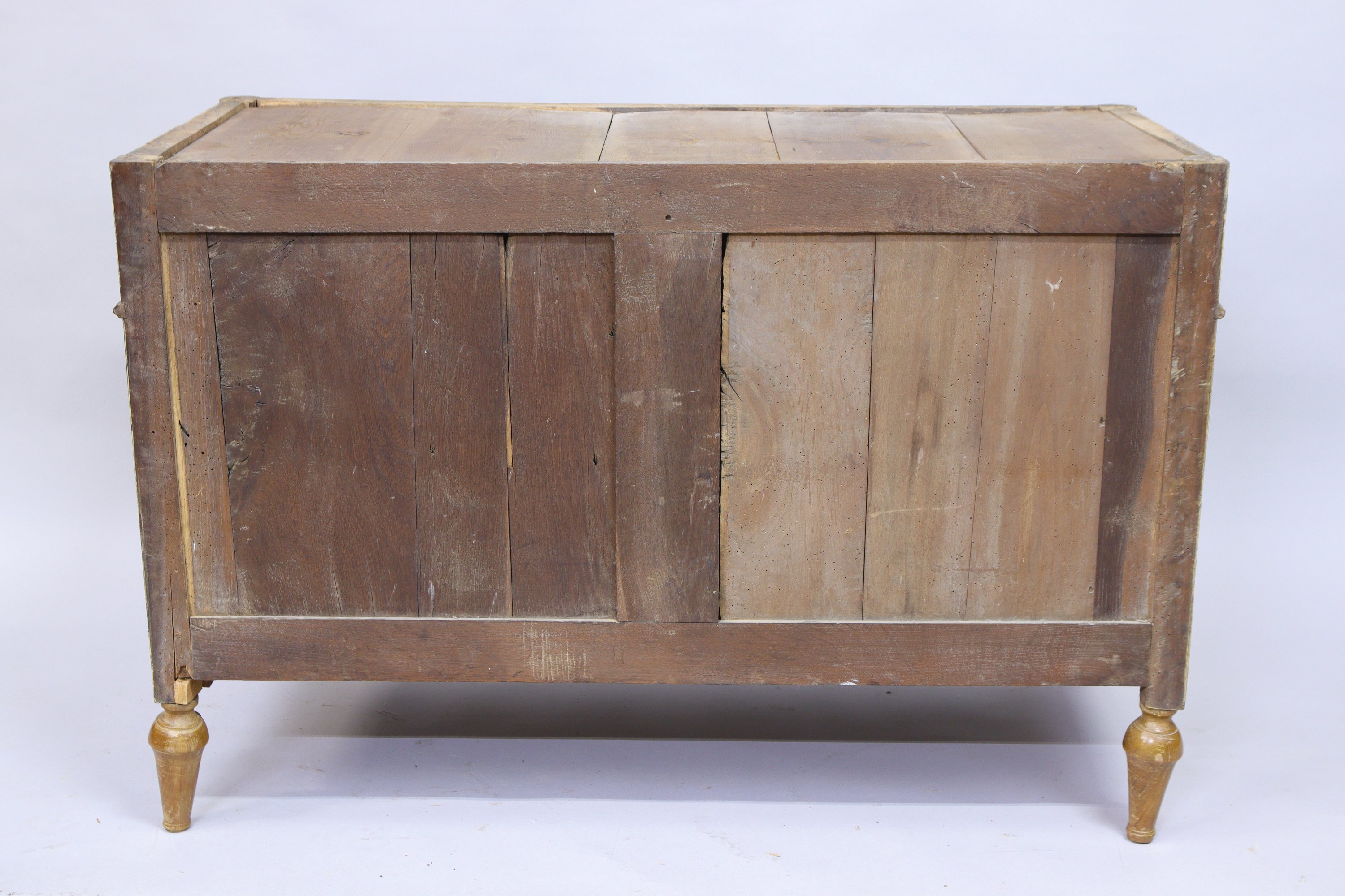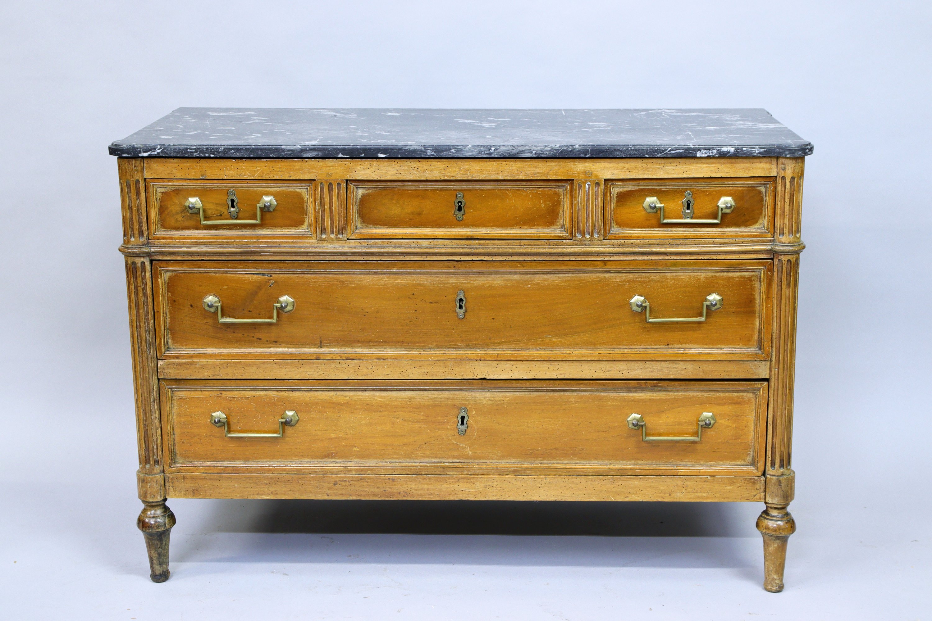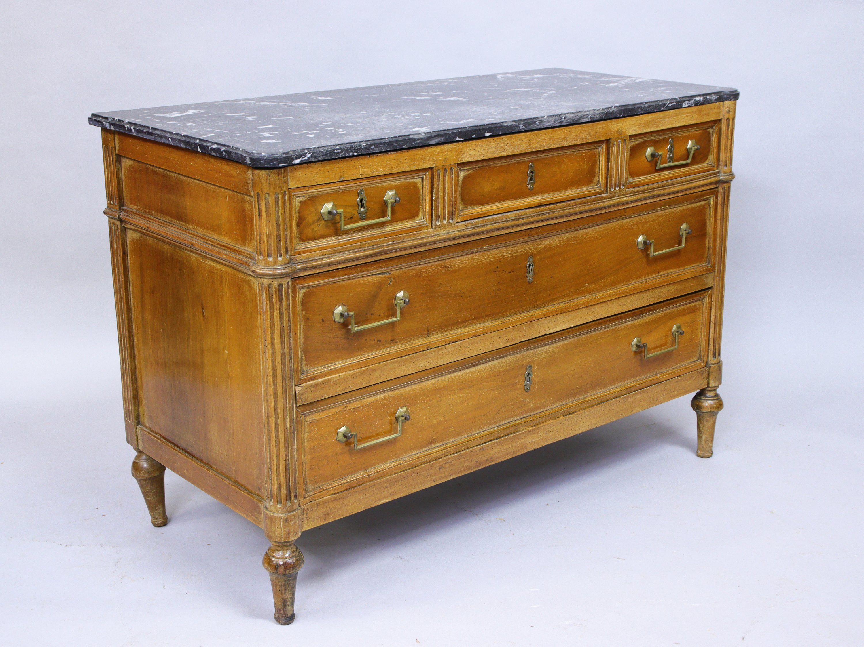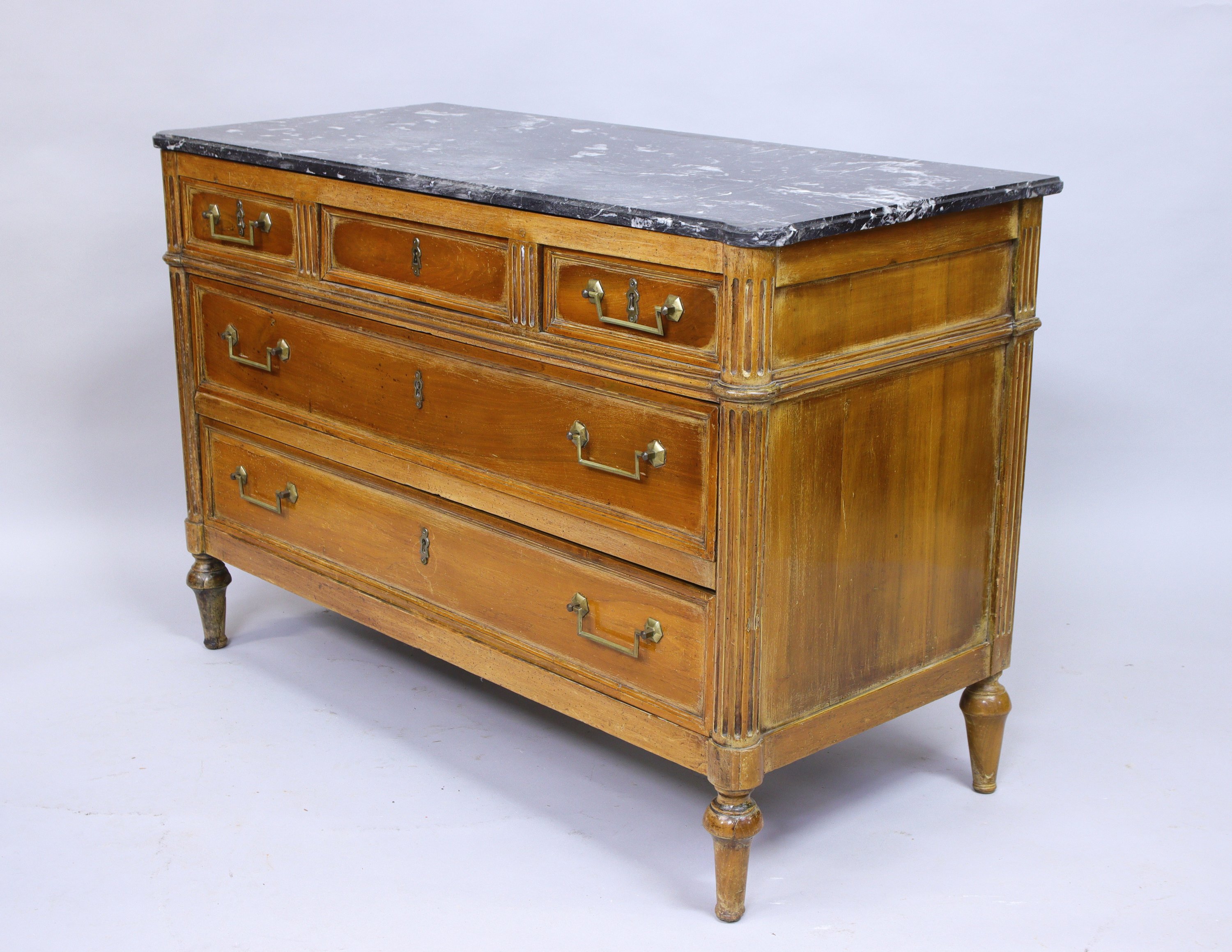 COMMODE en bois naturel anciennement vernis ouvrant par cinq tiroirs. Dans la partie haute, deux petits tiroirs ouvrant par une poignée en laiton encadrent un tiroir fermant à clef. Dans la partie basse, deux grands tiroirs ouvrent de même par une poignée en laiton. Montants antérieurs en colonnes cannelées adossées et postérieurs en pilastres cannelés. Piètement toupie.